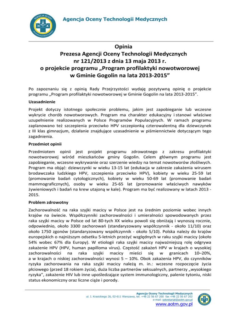 Agencja Oceny Technologii Medycznych Opinia Prezesa Agencji Oceny Technologii Medycznych nr 121/2013 z dnia 13 maja 2013 r. o projekcie programu „Program profilaktyki nowotworowej w Gminie Gogolin na lata 2013-2015” Po zapoznaniu się z opinią Rady Przejrzystości wydaję pozytywną opinię o projekcie programu „Program profilaktyki nowotworowej w Gminie Gogolin na lata 2013-2015”. Uzasadnienie Projekt dotyczy istotnego społecznie problemu, jakim jest zapobieganie lub wczesne wykrycie chorób nowotworowych. Program ma charakter edukacyjny i stanowi właściwe uzupełnienie realizowanych w Polsce Programów Populacyjnych. W ramach programu zaplanowano też szczepienia przeciwko HPV szczepionką czterowalentną dla dziewczynek z III klas gimnazjum, działanie znajdujące uzasadnienie w piśmiennictwie dotyczącym tego zagadnienia. Przedmiot opinii Przedmiotem opinii jest projekt programu zdrowotnego z zakresu profilaktyki nowotworowej wśród mieszkańców gminy Gogolin. Celem głównym programu jest zapobieganie, wczesne wykrywanie oraz szerzenie wiedzy na temat nowotworów złośliwych. Program ma objąć: dziewczynki w wieku 13-15 lat (edukacja w zakresie zakażenia wirusem brodawczaka ludzkiego HPV, szczepienia przeciwko HPV), kobiety w wieku 25-59 lat (promowanie badań cytologicznych), kobiety w wieku 50-69 lat (promowanie badań mammograficznych), osoby w wieku 25-65 lat (promowanie właściwych nawyków żywieniowych i badań na krew utajoną w kale). Program ma być realizowany w latach 2013 2015. Problem zdrowotny Zachorowalność na raka szyjki macicy w Polsce jest na średnim poziomie wobec innych krajów na świecie. Współczynniki zachorowalności i umieralności spowodowanych przez raka szyjki macicy w Polsce od lat 80-tych XX wieku powoli się obniżają i wynoszą rocznie, odpowiednio, około 3300 zachorowań (standaryzowany współczynnik - około 11/10) oraz około 1750 zgonów (standaryzowany współczynnik - około 5/10). Polska należy do krajów europejskich o najniższym odsetku 5-letnich przeżyć względnych w raku szyjki macicy (około 54% wobec 67% dla Europy). W etiologii raka szyjki macicy najważniejszą rolę odgrywa zakażenie HPV (HPV, human papilloma virus). Częstość zakażeń HPV w krajach o wysokiej zachorowalności na raka szyjki macicy mieści się w granicach 10–20%, a w krajach o niskiej zachorowalności wynosi 5 – 10%. Obok zakażenia HPV, do czynników ryzyka zachorowania na raka szyjki macicy należą m. in.: wczesne rozpoczęcie życia płciowego (przed 18 rokiem życia), duża liczba partnerów seksualnych, partnerzy „wysokiego ryzyka”, zakażenie HIV lub inne upośledzające system immunologiczny, palenie tytoniu, niski status ekonomiczny oraz liczne ciąże i porody. Agencja Oceny Technologii Medycznych ul. I. Krasickiego 26, 02-611 Warszawa, tel. +48 22 56 67 200 fax +48 22 56 67 202 e-mail: [email protected] www.aotm.gov.pl Opinia Prezesa AOTM nr 121/2013 z dnia 13 maja 2013 r. Rak piersi jest najczęściej występującym nowotworem u kobiet w Polsce. Stanowi ok. 20% wszystkich nowotworów diagnozowanych u kobiet. Co roku w Polsce odnotowuje się około 11 tys. nowych zachorowań (30 zachorowań na 100 tys. mieszkańców). Z powodu raka piersi każdego roku umiera 5 tys. kobiet. Uznaje się, że rak piersi jest związany z rozwojem cywilizacyjnym społeczeństwa. Umieralność może być skutecznie zmniejszona dzięki wczesnemu wykrywaniu. Kluczową rolę we wczesnym rozpoznaniu raka piersi odgrywa badanie mammograficzne, które umożliwia rozpoznanie zmiany nowotworowej, nim ta osiągnie postać objawiającą się klinicznie. Wykazano, że badania mammograficzne pozwalają zmniejszyć ryzyko zgonu z powodu raka piersi. Powstanie i rozwój raka jelita grubego (RJG, ICD-10: C 18) warunkuje wiele czynników, z których najważniejsze są czynniki genetyczne i środowiskowe. Do uznanych stanów przedrakowych w jelicie grubym należą: pojedyncze gruczolaki, zespoły polipowatości rodzinnej oraz nieswoiste choroby zapalenia jelit. Większość (85%) nowotworów sporadycznych rozwija się w wyniku nabytych, nakładających się mutacji genów supresorowych (APC, DCC, p53), prowadzących do rozrostu nabłonka gruczołowego i uformowania gruczolaka, a następnie do przemiany złośliwej w wyniku aktywacji onkogenów (m.in. K-ras). Do czynników ryzyka powstania RJG zalicza się: polipy gruczołowe jelita grubego, choroby zapalne jelita grubego, czynniki środowiskowe- dietetyczne (częstsze występowanie RJG obserwuje się u osób pozostających na diecie z przewagą tłuszczów zwierzęcych i jednocześnie diecie ubogiej w błonnik oraz wapń), wiek (zwiększone ryzyko zachorowania występuje po 50 roku życia, szczyt zachorowań przypada na 8 dekadę życia). Dziedziczne i rodzinne uwarunkowania dotyczą kilkunastu procent wszystkich zachorowań na RJG. Podstawą do rozpoznania takich uwarunkowań są wywiady rodzinne, obejmujące krewnych pierwszego i drugiego stopnia. Dziedziczne uwarunkowanie zachorowań można uznać za wysoce prawdopodobne, jeżeli: nowotwór rozpoznano u kilku krewnych w przynajmniej dwóch kolejnych pokoleniach; nowotwór rozpoznano bez obciążenia rodzinnego, przed 40 rokiem życia oraz w przypadkach z chronicznymi zachorowaniami na raka jelita grubego i inne nowotwory (zwłaszcza na raka błony śluzowej trzonu macicy). Alternatywne świadczenia W Polsce realizowany jest Populacyjny Program Profilaktyki Raka Szyjki Macicy, oparty o skrining cytologiczny. Populacyjny Program realizowany jest w oparciu o Ustawę z dnia 1 lipca 2005 roku o ustanowieniu programu wieloletniego: "Narodowy program zwalczania chorób nowotworowych" (Dz. U. 05.143.1200) oraz o Uchwałę Nr 24/2011 Rady Ministrów z dnia 1 marca 2011 r. w sprawie harmonogramu zadań wykonywanych w ramach programu wieloletniego: "Narodowy program zwalczania chorób nowotworowych" w roku 2011 oraz kierunków realizacji zadań tego programu n