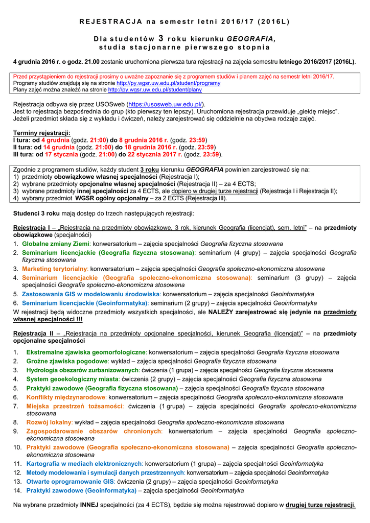 REJESTRACJA na semestr letni 2016/17 (2016L) D l a s t u d e n t ó w 3 r o k u kierunku GEOGRAFIA, studia stacjonarne pierwszego stopnia 4 grudnia 2016 r. o godz. 21.00 zostanie uruchomiona pierwsza tura rejestracji na zajęcia semestru letniego 2016/2017 (2016L). Przed przystąpieniem do rejestracji prosimy o uważne zapoznanie się z programem studiów i planem zajęć na semestr letni 2016/17. Programy studiów znajdują się na stronie http://py.wgsr.uw.edu.pl/student/programy Plany zajęć można znaleźć na stronie http://py.wgsr.uw.edu.pl/student/plany Rejestracja odbywa się przez USOSweb (https://usosweb.uw.edu.pl/). Jest to rejestracja bezpośrednia do grup (kto pierwszy ten lepszy). Uruchomiona rejestracja przewiduje „giełdę miejsc”. Jeżeli przedmiot składa się z wykładu i ćwiczeń, należy zarejestrować się oddzielnie na obydwa rodzaje zajęć. Terminy rejestracji: I tura: od 4 grudnia (godz. 21:00) do 8 grudnia 2016 r. (godz. 23:59) II tura: od 14 grudnia (godz. 21:00) do 18 grudnia 2016 r. (godz. 23:59) III tura: od 17 stycznia (godz. 21:00) do 22 stycznia 2017 r. (godz. 23:59). Zgodnie z programem studiów, każdy student 3 roku kierunku GEOGRAFIA powinien zarejestrować się na: 1) przedmioty obowiązkowe własnej specjalności (Rejestracja I); 2) wybrane przedmioty opcjonalne własnej specjalności (Rejestracja II) – za 4 ECTS; 3) wybrane przedmioty innej specjalności za 4 ECTS, ale dopiero w drugiej turze rejestracji (Rejestracja I i Rejestracja II); 4) wybrany przedmiot WGSR ogólny opcjonalny – za 2 ECTS (Rejestracja III). Studenci 3 roku mają dostęp do trzech następujących rejestracji: Rejestracja I – „Rejestracja na przedmioty obowiązkowe, 3 rok, kierunek Geografia (licencjat), sem. letni” – na przedmioty obowiązkowe (specjalności) 1. Globalne zmiany Ziemi: konwersatorium – zajęcia specjalności Geografia fizyczna stosowana 2. Seminarium licencjackie (Geografia fizyczna stosowana): seminarium (4 grupy) – zajęcia specjalności Geografia fizyczna stosowana 3. Marketing terytorialny: konwersatorium – zajęcia specjalności Geografia społeczno-ekonomiczna stosowana 4. Seminarium licencjackie (Geografia społeczno-ekonomiczna stosowana): seminarium (3 grupy) – zajęcia specjalności Geografia społeczno-ekonomiczna stosowana 5. Zastosowania GIS w modelowaniu środowiska: konwersatorium – zajęcia specjalności Geoinformatyka 6. Seminarium licencjackie (Geoinformatyka): seminarium (2 grupy) – zajęcia specjalności Geoinformatyka W rejestracji będą widoczne przedmioty wszystkich specjalności, ale NALEŻY zarejestrować się jedynie na przedmioty własnej specjalności !!! Rejestracja II – „Rejestracja na przedmioty opcjonalne specjalności, kierunek Geografia (licencjat)” – na przedmioty opcjonalne specjalności 1. 2. 3. 4. 5. 6. 7. 8. 9. 10. 11. 12. 13. 14. Ekstremalne zjawiska geomorfologiczne: konwersatorium – zajęcia specjalności Geografia fizyczna stosowana Groźne zjawiska pogodowe: wykład – zajęcia specjalności Geografia fizyczna stosowana Hydrologia obszarów zurbanizowanych: ćwiczenia (1 grupa) – zajęcia specjalności Geografia fizyczna stosowana System geoekologiczny miasta: ćwiczenia (2 grupy) – zajęcia specjalności Geografia fizyczna stosowana Praktyki zawodowe (Geografia fizyczna stosowana) – zajęcia specjalności Geografia fizyczna stosowana Konflikty międzynarodowe: konwersatorium – zajęcia specjalności Geografia społeczno-ekonomiczna stosowana Miejska przestrzeń tożsamości: ćwiczenia (1 grupa) – zajęcia specjalności Geografia społeczno-ekonomiczna stosowana Rozwój lokalny: wykład – zajęcia specjalności Geografia społeczno-ekonomiczna stosowana Zagospodarowanie obszarów chronionych: konwersatorium – zajęcia specjalności Geografia społecznoekonomiczna stosowana Praktyki zawodowe (Geografia społeczno-ekonomiczna stosowana) – zajęcia specjalności Geografia społecznoekonomiczna stosowana Kartografia w mediach elektronicznych: konwersatorium (1 grupa) – zajęcia specjalności Geoinformatyka Metody modelowania i symulacji danych przestrzennych: konwersatorium – zajęcia specjalności Geoinformatyka Otwarte oprogramowanie GIS: ćwiczenia (2 grupy) – zajęcia specjalności Geoinformatyka Praktyki zawodowe (Geoinformatyka) – zajęcia specjalności Geoinformatyka Na wybrane przedmioty INNEJ specjalności (za 4 ECTS), będzie się można rejestrować dopiero w drugiej turze rejestracji. Rejestracja III – „Rejestracja na przedmioty ogólne opcjonalne, kierunek Geografia (licencjat)” – na przedmioty WGSR ogólne opcjonalne 1. 2. 3. 4. 5. 6. 7. 8. 9. Człowiek i środowisko: wykład Ćwiczenia terenowe w wybranych regionach Polski (Podlasie) Ćwiczenia terenowe w wybranych regionach Polski (Suwalszczyzna) Ćwiczenia terenowe w wybranych regionach Polski (Tatry) Fizyka i astronomia: wykład Geografia medyczna: konwersatorium Geografia społeczno-ekonomiczna Polski: wykład Kartograficzna wizualizacja danych przestrzennych: wykład + ćwiczenia (2 grupy) Regiony społeczno-gospodarcze świata: wykład Na ćwiczenia terenowe studenci 3 roku nie powinni się rejestrować !!! Informacje o rejestracji żetonowej na zajęcia ogólnouniwersyteckie (lektoraty, WF, OGUNy) można znaleźć na stronie http://rejestracja.usos.uw.edu.pl/ Prosimy o rozważne i przemyślane wybory!!!, ponieważ po zakończeniu rejestracji jedynie w uzasadnionych przypadkach, będzie możliwa zamiana grup, lub dopisanie się na zajęcia. Prosimy pamiętać, że zarówno zarejestrowanie, jak i wyrejestrowanie się z zajęć jest możliwe tylko w czasie trwania rejestracji. Po jej zakończeniu studenci mogą tylko zgłosić prośbę o „rezygnację z zaliczenia przedmiotu” (raz w trakcie trwania studiów). W razie problemów z rejestracją należy kontaktować się z Pełnomocnikiem dziekana WGSR ds. USOS mgr Janem Skrzypczukiem ([email protected]).