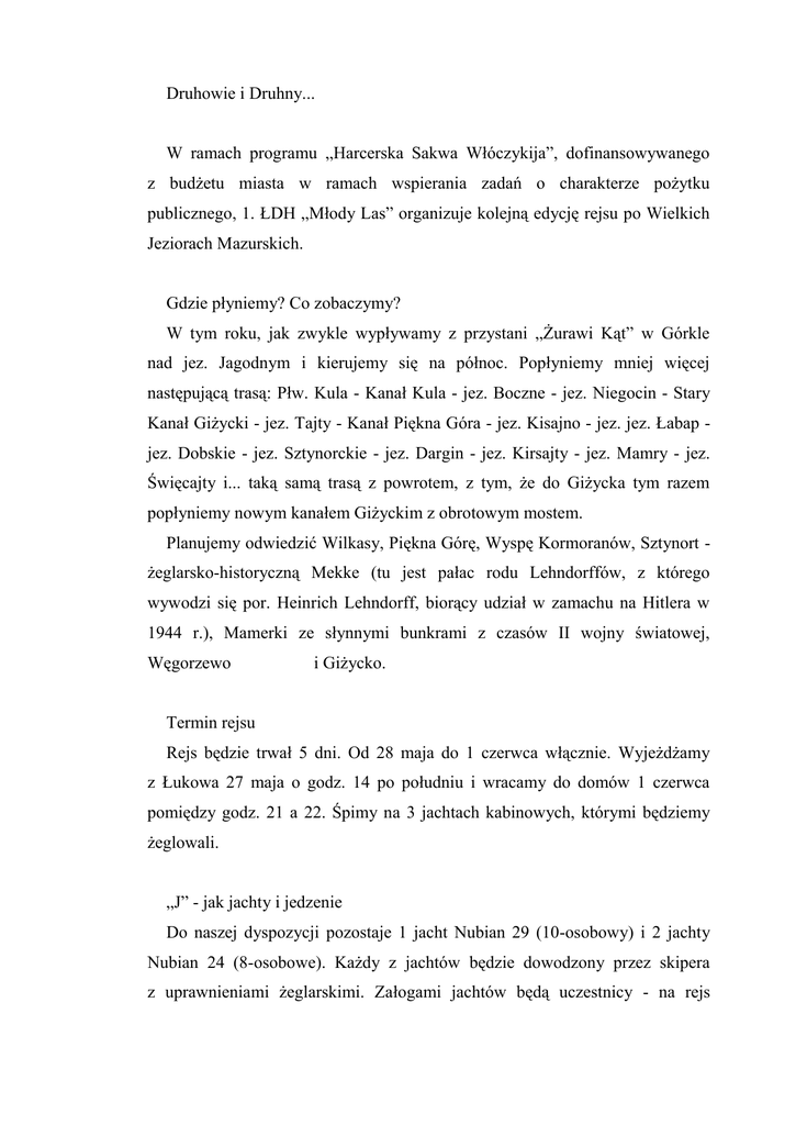 Druhowie i Druhny... W ramach programu „Harcerska Sakwa Włóczykija”, dofinansowywanego z budżetu miasta w ramach wspierania zadań o charakterze pożytku publicznego, 1. ŁDH „Młody Las” organizuje kolejną edycję rejsu po Wielkich Jeziorach Mazurskich. Gdzie płyniemy? Co zobaczymy? W tym roku, jak zwykle wypływamy z przystani „Żurawi Kąt” w Górkle nad jez. Jagodnym i kierujemy się na północ. Popłyniemy mniej więcej następującą trasą: Płw. Kula - Kanał Kula - jez. Boczne - jez. Niegocin - Stary Kanał Giżycki - jez. Tajty - Kanał Piękna Góra - jez. Kisajno - jez. jez. Łabap jez. Dobskie - jez. Sztynorckie - jez. Dargin - jez. Kirsajty - jez. Mamry - jez. Święcajty i... taką samą trasą z powrotem, z tym, że do Giżycka tym razem popłyniemy nowym kanałem Giżyckim z obrotowym mostem. Planujemy odwiedzić Wilkasy, Piękna Górę, Wyspę Kormoranów, Sztynort żeglarsko-historyczną Mekke (tu jest pałac rodu Lehndorffów, z którego wywodzi się por. Heinrich Lehndorff, biorący udział w zamachu na Hitlera w 1944 r.), Mamerki ze słynnymi bunkrami z czasów II wojny światowej, Węgorzewo i Giżycko. Termin rejsu Rejs będzie trwał 5 dni. Od 28 maja do 1 czerwca włącznie. Wyjeżdżamy z Łukowa 27 maja o godz. 14 po południu i wracamy do domów 1 czerwca pomiędzy godz. 21 a 22. Śpimy na 3 jachtach kabinowych, którymi będziemy żeglowali. „J” - jak jachty i jedzenie Do naszej dyspozycji pozostaje 1 jacht Nubian 29 (10-osobowy) i 2 jachty Nubian 24 (8-osobowe). Każdy z jachtów będzie dowodzony przez skipera z uprawnieniami żeglarskimi. Załogami jachtów będą uczestnicy - na rejs jedziemy, by nauczyć się podstaw żeglarskiego rzemiosła i w praktyce i w ten sposób spędzać czas na świeżym powietrzu. Na jachtach załogi też samodzielnie przygotowują posiłki z zabranego ze sobą prowiantu. Przewidziano w czasie rejsu (poza pierwszym wieczorem na przystani w Jagodnem, gdy trzeba będzie posilić się zabranymi z domu kanapkami) 3 posiłki dziennie. Ile to kosztuje? Za transport w obie strony, czarter jachtów kierowanych przez skiperów, wyżywienie, ubezpieczenie oraz zapewnienie żeglarskich atrakcji w najważniejszych portach północnej części Wielkich Jezior Mazurskich trzeba zapłacić 300 zł. Opłatę można wnieść w dwóch ratach po 150 zł - I termin płatności niezwykle korzystna to 10 kwietnia, II termin - 5 maja. (Oferta cenowa jest i być może dzięki naszej ofercie będziecie mieli jedyną życiową szanse zetknięcia się z pięknem żeglarstwa! Dla porównania komercyjny, 7-dniowy rejs, organizowany przez Stowarzyszenie Miłośników Żeglarstwa Millennium z Górkła, mniej więcej w terminie zbliżonym do naszego, kosztuje 9.499 zł! - zobacz - http://www.millennium.pl.eu.org/page.php?section=premier_sailing&lang=pl) Dla kogo to wszystko? Kto może wziąć udział w rejsie? Druhny i druhowie związani z 1. ŁDH „Młody Las” oraz 10. WŁDH „Jata”, a nawet osoby nie zrzeszone w harcerstwie. Uczestnicy rejsu powinni mieć ukończone przynajmniej 12 lat i posiadać podstawową umiejętność pływania. Wszyscy niepełnoletni muszą dostarczyć pisemną zgodę rodziców na wzięcie udziału w rejsie. Chcę popłynąć, gdzie się głosić? Zgłoszenia do dnia 10 kwietnia przyjmują drużynowi 1. ŁDH „Młody Las” oraz 10. WŁDH „Jata”. Można się również zgłaszać do komandora rejsu, „Borowego Ducha” (tel. 502203767). W sobotę 12 kwietnia, w harcówce „Młodego Lasu” odbędzie się zebranie rodziców lub opiekunów uczestników rejsu. Obecność na nim nie jest obowiązkowa, ale jeśli ktoś z młodzieży nie brał jeszcze udziału w poprzednich rejsach - wskazane jest, by ktoś z dorosłych na zapowiadane spotkanie zechciał przybyć. Liczymy na to, że atrakcje, które dla Was przygotowaliśmy spotkają się z Waszym zainteresowaniem. Czekamy na zgłoszenia! Borowy Duch i spółka a
