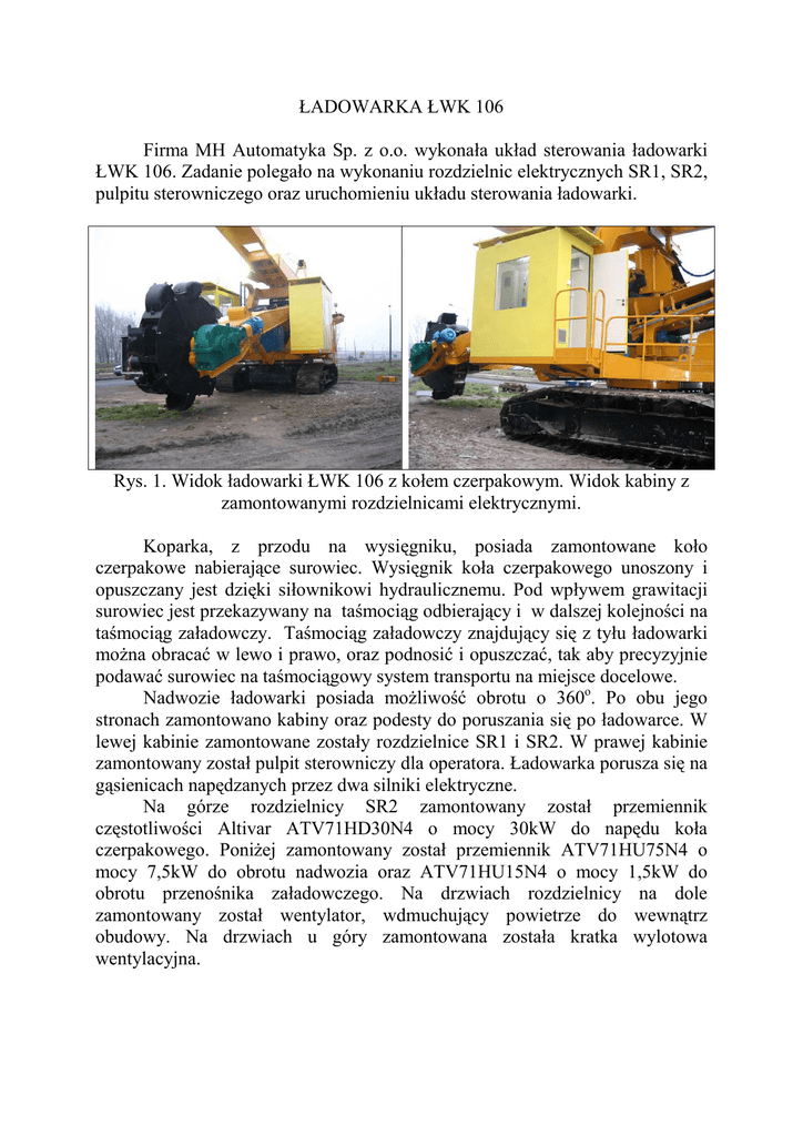 ŁADOWARKA ŁWK 106 Firma MH Automatyka Sp. z o.o. wykonała układ sterowania ładowarki ŁWK 106. Zadanie polegało na wykonaniu rozdzielnic elektrycznych SR1, SR2, pulpitu sterowniczego oraz uruchomieniu układu sterowania ładowarki. Rys. 1. Widok ładowarki ŁWK 106 z kołem czerpakowym. Widok kabiny z zamontowanymi rozdzielnicami elektrycznymi. Koparka, z przodu na wysięgniku, posiada zamontowane koło czerpakowe nabierające surowiec. Wysięgnik koła czerpakowego unoszony i opuszczany jest dzięki siłownikowi hydraulicznemu. Pod wpływem grawitacji surowiec jest przekazywany na taśmociąg odbierający i w dalszej kolejności na taśmociąg załadowczy. Taśmociąg załadowczy znajdujący się z tyłu ładowarki można obracać w lewo i prawo, oraz podnosić i opuszczać, tak aby precyzyjnie podawać surowiec na taśmociągowy system transportu na miejsce docelowe. Nadwozie ładowarki posiada możliwość obrotu o 360o. Po obu jego stronach zamontowano kabiny oraz podesty do poruszania się po ładowarce. W lewej kabinie zamontowane zostały rozdzielnice SR1 i SR2. W prawej kabinie zamontowany został pulpit sterowniczy dla operatora. Ładowarka porusza się na gąsienicach napędzanych przez dwa silniki elektryczne. Na górze rozdzielnicy SR2 zamontowany został przemiennik częstotliwości Altivar ATV71HD30N4 o mocy 30kW do napędu koła czerpakowego. Poniżej zamontowany został przemiennik ATV71HU75N4 o mocy 7,5kW do obrotu nadwozia oraz ATV71HU15N4 o mocy 1,5kW do obrotu przenośnika załadowczego. Na drzwiach rozdzielnicy na dole zamontowany został wentylator, wdmuchujący powietrze do wewnątrz obudowy. Na drzwiach u góry zamontowana została kratka wylotowa wentylacyjna. Rys. 2. Widok wnętrza rozdzielnicy SR2 z zamontowanymi przemiennikami częstotliwości Altivar ATV 71. W rozdzielnicy SR1 znajduje się układ sterowania ładowarki. Zgodnie z wymaganiami klienta nie jest on oparty o sterownik programowalny. Wszystko zrealizowane zostało na przekaźnikach i stycznikach. W rozdzielnicy zamontowano wyłącznik główny Compact NS, stycznik główny LC1-F, transformatory separacyjne. Do zabezpieczenia obwodów użyto wyłączników instalacyjnych i silnikowych. Rys. 3. Widok wnętrza rozdzielnicy SR1 z zamontowanym wyłącznikiem Compact NS, stycznikiem LC1-F, wyłącznikami i przekaźnikami. Pulpit sterowniczy ładowarki znajdujący się w kabinie operatora wykonany jest w oparciu o synoptykę z gamy 4 z oferty Schneider Electric. Zgodnie z wymaganiami klienta zastosowano złącza przyłączeniowe sprężynowe z oferty WAGO. Rys. 4. Widok pulpitu sterowniczego operatora.