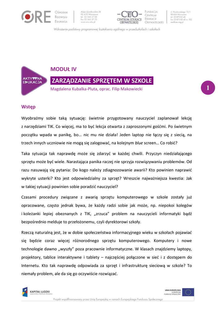 MODUŁ IV ZARZĄDZANIE SPRZĘTEM W SZKOLE Magdalena Kubalka-Pluta, oprac. Filip Makowiecki Wstęp Wyobraźmy sobie taką sytuację: świetnie przygotowany nauczyciel zaplanował lekcję z narzędziami TIK. Co więcej, ma to być lekcja otwarta z zaproszonymi gośćmi. Po świetnym początku wpada w panikę, bo… nic mu nie działa! Jeden laptop nie łączy się z siecią, na trzech innych uczniowie nie mogą się zalogować, na kolejnym blue screen… Co robić? Taka sytuacja tak naprawdę może się zdarzyć w każdej chwili. Przyczyn niedziałającego sprzętu może być wiele. Narastająca panika raczej nie sprzyja rozwiązywaniu problemów. Od razu nasuwają się pytania: Do kogo należy zdiagnozowanie awarii? Kto powinien naprawić wykryte usterki? Kto jest odpowiedzialny za sprzęt? Wreszcie najważniejsza kwestia: Jak w takiej sytuacji powinien sobie poradzić nauczyciel? Czasami procedury związane z awarią sprzętu komputerowego w szkole zostały już opracowane, często jednak bywa, że każdy radzi sobie jak może, np. niepokoi kolegów i koleżanki lepiej obeznanych z TIK, „zrzuca” problem na nauczycieli informatyki bądź bezpośrednio melduje to przełożonemu, czyli dyrektorowi szkoły. Rzeczą naturalną jest, że w dobie społeczeństwa informacyjnego wieku w szkołach pojawiać się będzie coraz więcej różnorodnego sprzętu komputerowego. Komputery i nowe technologie dawno „wyszły” poza pracownie informatyczne. W klasach znajdziemy laptopy, projektory, tablice interaktywne i tablety – najczęściej połączone w sieć i z dostępem do Internetu. Kto tak naprawdę odpowiada za sprzęt i infrastrukturę sieciową w szkole? To niemały problem, ale da się go oczywiście rozwiązać. 1 Kto odpowiada za sprzęt w szkole? W myśl przepisów oświatowych (art. 42 ust. 1 i 2 ustawy Karta Nauczyciela) to nie nauczyciele (czyli także nie nauczyciele informatyki) odpowiadają za prawidłowe działanie sprzętu komputerowego w szkole. Zadania takie powinny być powierzone np. informatykowi zatrudnionemu na stanowisku niepedagogicznym. Czy w szkołach funkcjonują takie stanowiska? Dyrektor w ramach określonej liczby etatów w placówce, którą zarządza, decyduje, czy będzie takie stanowisko czy nie. Często niestety nie jest to możliwe. Obowiązujące Rozporządzenie Rady Ministrów z dn. 18 marca 2009 r. z późn. zmianami w sprawie wynagradzania pracowników samorządowych również nie przewiduje stanowisk związanych z administrowaniem sprzętem komputerowym w oświacie. Wydawałoby się, że sytuacja jest trudna i nie do rozwiązania. W roku 2006 poseł Czesław Mroczek zgłosił w ówczesnym Ministerstwie Edukacji i Nauki interwencję w sprawie problemu administrowania sprzętem informatycznym w szkołach. Zauważono, że szkoły posiadające pracownie informatyczne otrzymane w ramach projektu Pracownie Komputerowe dla Szkół nie mają żądnej podstawy prawnej określającej sprawy opieki nad sprzętem. Już wtedy zarządzanie narzędziami TIK wymagało sporo pracy. W tamtych latach szkoły były w posiadaniu jednej–dwóch pracowni i kilku komputerów na potrzeby sekretariatu, księgowości i dyrekcji. Na skutek wspomnianej interwencji MEN podało propozycje rozwiązania problemu poprzez: 1. przyznanie nauczycielowi, który podejmie się zadań związanych z administracją sprzętem szkolnym, stosownie większego dodatku motywacyjnego, 2. zatrudnienie w szkole osoby na stanowisku niepedagogicznym (np. na umowę zlecenia bądź w ramach umowy z firmą zewnętrzną), 3. obniżenie tygodniowego wymiaru pracy nauczycielowi-administratorowi (jest to praktyczne rozwiązanie, choć wymaga stosownych ustaleń z organem prowadzącym). Najłatwiejszym rozwiązaniem zatem wydaje się przyznanie dodatku motywacyjnego osobie, która pełniłaby funkcję administratora – jeśli oczywiście w szkole jest zatrudniony pracownik posiadający odpowiednie kompetencje i dysponujący czasem na pełnienie nowej funkcji. 2 Istnieją również placówki (a czasami i całe gminy), które wybrały rozwiązanie drugie polegające na zatrudnieniu pracownika, który dzieli etat na kilka szkół, oferując usługi informatyczne obejmujące naprawę i konserwację sprzętu. Każda z zaproponowanych opcji rozwiązuje problem opieki nad sprzętem, zapewniając wysoki poziom dostępności pomocy, co umożliwia szybką reakcję w razie awarii. Czym jest kontrola zarządcza w aspekcie IT? Mocą art. 69 ust. 1 pkt 3 ustawy z dnia 27 sierpnia 2009 r. o finansach publicznych (Dz. U. Nr 157, poz. 1240 z późn. zm.) dyrektor placówki oświatowej zobowiązany jest do realizacji kontroli zarządczej na poziomie I. Obejmuje ona działalność całej szkoły, a nie tylko sfery związanej z finansami publicznymi. Wspomniana ustawa obowiązuje od 1 stycznia 2010 r. Definicję kontroli zarządczej zawiera art. 68 w brzmieniu: Kontrolę zarządczą w jednostkach sektora finansów publicznych stanowi ogół działań podejmowanych dla zapewnienia realizacji celów i zadań w sposób zgodny z prawem, efektywny, oszczędny i terminowy. Jak to powinno wyglądać w praktyce szkolnej w zakresie struktury informatycznej? Chodzi o jasne zasady dotyczące zarówno zarządzania sprzętem, jak i oprogramowaniem, które powinny się znaleźć w schematach kontroli zarządczej każdej szkoły. Zestaw dokumentów dotyczących działu IT oraz administratora niezbędny w pracy sieci każdej placówki to: w zakresie sprzętu: o o o o ewidencja sprzętu komputerowego, wdrożona polityka bezpieczeństwa, procedury zgłaszania awarii sprzętu i infrastruktury sieciowej, instrukcja zarządzania systemem informatycznym przetwarzającym dane osobowe, o regulaminy pracowni, o instrukcje użytkowania sprzętu; w zakresie programów i licencji: o o o o zasady użytkowania oprogramowania zgodnie z posiadanymi licencjami; polityka nabywania oprogramowania; raport zbiorczy oprogramowania i licencji; wskazówki do raportu 