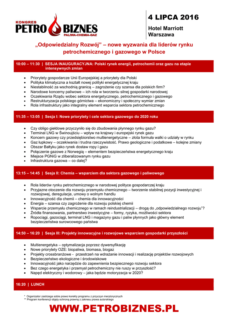 4 LIPCA 2016 Hotel Marriott Warszawa „Odpowiedzialny Rozwój” – nowe wyzwania dla liderów rynku petrochemicznego i gazowego w Polsce 10:00 – 11:30 | SESJA INAUGURACYJNA: Polski rynek energii, petrochemii oraz gazu na etapie intensywnych zmian Priorytety gospodarcze Unii Europejskiej a priorytety dla Polski Polityka klimatyczna a kształt nowej polityki energetycznej kraju Niestabilność za wschodnią granicą – zagrożenie czy szansa dla polskich firm? Narodowe koncerny paliwowe – ich rola w tworzeniu silnej gospodarki narodowej Oczekiwania Rządu wobec sektora energetycznego, petrochemicznego i gazowego Restrukturyzacja polskiego górnictwa – ekonomiczny i społeczny wymiar zmian Rola infrastruktury jako integralny element wsparcia sektora petrochemicznego 11:35 – 13:05 | Sesja I: Nowe priorytety i cele sektora gazowego do 2020 roku Czy obligo giełdowe przyczyniło się do zbudowania płynnego rynku gazu? Terminal LNG w Świnoujściu – wpływ na krajowy i europejski rynek gazu Koncern gazowy czy przedsiębiorstwo multienergetyczne – złota formuła walki o udziały w rynku Gaz łupkowy – oczekiwania i trudna rzeczywistość. Prawo geologiczne i podatkowe – kolejne zmiany Obszar Bałtyku jako rynek dostaw ropy i gazu Połączenie gazowe z Norwegią – elementem bezpieczeństwa energetycznego kraju Miejsce PGNiG w zliberalizowanym rynku gazu Infrastruktura gazowa – co dalej? 13:15 – 14:45 | Sesja II: Chemia – wsparciem dla sektora gazowego i paliwowego Rola liderów rynku petrochemicznego w narodowej polityce gospodarczej kraju Przyjazne otoczenie dla rozwoju przemysłu chemicznego – tworzenie stabilnej pozycji inwestycyjnej i rozwojowej, deregulacje, umowy o wolnym handlu Innowacyjność dla chemii – chemia dla innowacyjności Energia – szansa czy zagrożenie dla rozwoju polskiej chemii Wsparcie przemysłu chemicznego w ramach reindustrializacji – drogą do „odpowiedzialnego rozwoju”? Źródła finansowania, partnerstwo inwestycyjne – formy, ryzyka, możliwości sektora Ropociągi, gazociągi, terminal LNG i magazyny gazu i paliw płynnych jako główny element bezpieczeństwa surowcowego państwa 14:50 – 16:20 | Sesja III: Projekty innowacyjne i rozwojowe wsparciem gospodarki przyszłości Multienergetyka – optymalizacja poprzez dywersyfikację Nowe priorytety OZE: biopaliwa, biomasa, biogaz Projekty crossbranżowe - przestrzeń na wdrażanie innowacji i realizację projektów rozwojowych Bezpieczeństwo ekologiczne i środowiskowe Innowacyjność jako narzędzie do zapewnienia bezpiecznego rozwoju sektora Bez czego energetyka i przemysł petrochemiczny nie ruszy w przyszłość? Napęd elektryczny i wodorowy – jaka będzie motoryzacja w 2020? 16:20 | LUNCH * Organizator zastrzega sobie prawo korekty programu z przyczyn merytorycznych ** Program konferencji objęty ochroną prawną z zakresu prawa autorskiego WWW.PETROBIZNES.PL