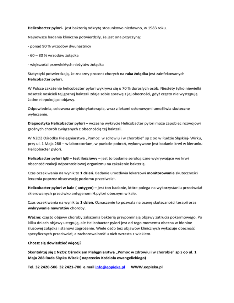 Helicobacter pylori- jest bakterią odkrytą stosunkowo niedawno, w 1983 roku. Najnowsze badania kliniczna potwierdziły, że jest ona przyczyną: - ponad 90 % wrzodów dwunastnicy - 60 – 80 % wrzodów żołądka - większości przewlekłych nieżytów żołądka Statystyki potwierdzają, że znaczny procent chorych na raka żołądka jest zainfekowanych Helicobacter pylori. W Polsce zakażenie helicobacter pylori wykrywa się u 70 % dorosłych osób. Niestety tylko niewielki odsetek nosicieli tej goznej bakterii zdaje sobie sprawę z jej obecności, gdyż często nie występują żadne niepokojące objawy. Odpowiednia, celowana antybiotykoterapia, wraz z lekami osłonowymi umożliwia skuteczne wyleczenie. Diagnostyka Helicobacter pylori – wczesne wykrycie Helicobacter pylori może zapobiec rozwojowi groźnych chorób związanych z obecnością tej bakterii. W NZOZ Ośrodku Pielęgniarstwa „Pomoc w zdrowiu i w chorobie” sp z oo w Rudzie Sląskiej- Wirku, przy ul. 1 Maja 288 – w laboratorium, w punkcie pobrao, wykonywane jest badanie krwi w kierunku Helicobacter pylori. Helicobacter pylori IgG – test ilościowy – jest to badanie serologiczne wykrywające we krwi obecnośd reakcji odpornościowej organizmu na zakażenie bakterią. Czas oczekiwania na wynik to 1 dzieo. Badanie umożliwia lekarzowi monitorowanie skuteczności leczenia poprzez obserwację poziomu przeciwciał. Helicobacter pylori w kale ( antygen) – jest ton badanie, które polega na wykorzystaniu przeciwciał skierowanych przeciwko antygenom H.pylori obecnym w kale. Czas oczekiwania na wynik to 1 dzieo. Oznaczenie to pozwala na ocenę skuteczności terapii oraz wykrywanie nawrotów choroby. Ważne: często objawy choroby zakażenia bakterią przypominają objawy zatrucia pokarmowego. Po kilku dniach objawy ustępują, ale Helicobacter pylori jest od tego momentu obecna w błonioe śluzowej żołądka i stanowi zagrożenie. Wiele osób bez objawów klinicznych wykazuje obecnośd specyficznych przeciwciał, a zachorowalnośd u nich wzrasta z wiekiem. Chcesz się dowiedzied więcej? Skontaktuj się z NZOZ Ośrodkiem Pielęgniarstwa „Pomoc w zdrowiu i w chorobie” sp z oo ul. 1 Maja 288 Ruda Sląska Wirek ( naprzeciw Kościoła ewangelickiego) Tel. 32 2420-506 32 2421-700 e.mail [email protected] WWW.eopieka.pl