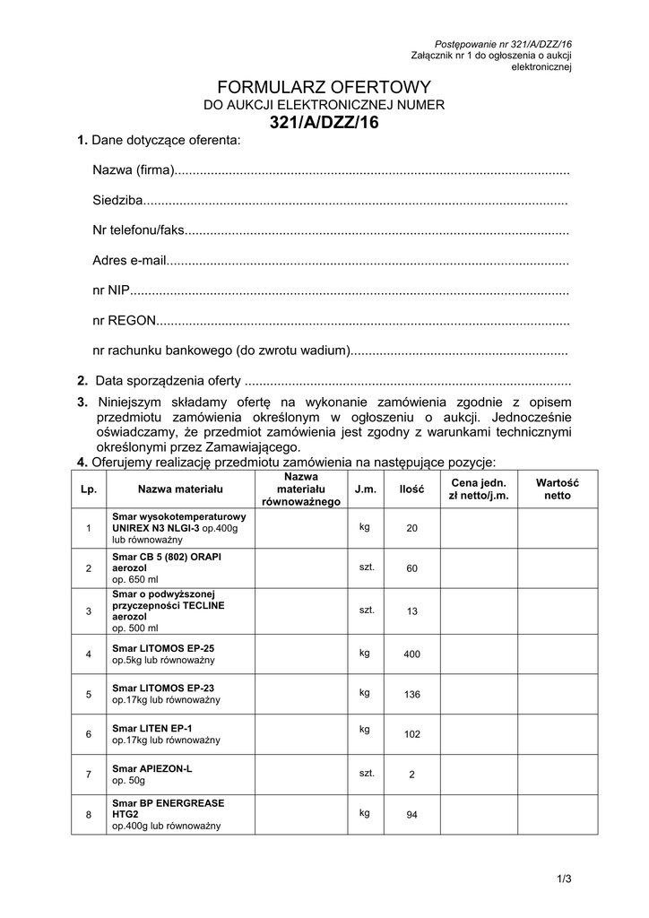 Postępowanie nr 321/A/DZZ/16 Załącznik nr 1 do ogłoszenia o aukcji elektronicznej FORMULARZ OFERTOWY DO AUKCJI ELEKTRONICZNEJ NUMER 321/A/DZZ/16 1. Dane dotyczące oferenta: Nazwa (firma)............................................................................................................. Siedziba..................................................................................................................... Nr telefonu/faks.......................................................................................................... Adres e-mail............................................................................................................... nr NIP......................................................................................................................... nr REGON.................................................................................................................. nr rachunku bankowego (do zwrotu wadium)............................................................ 2. Data sporządzenia oferty .......................................................................................... 3. Niniejszym składamy ofertę na wykonanie zamówienia zgodnie z opisem przedmiotu zamówienia określonym w ogłoszeniu o aukcji. Jednocześnie oświadczamy, że przedmiot zamówienia jest zgodny z warunkami technicznymi określonymi przez Zamawiającego. 4. Oferujemy realizację przedmiotu zamówienia na następujące pozycje: Lp. Nazwa materiału 1 Smar wysokotemperaturowy UNIREX N3 NLGI-3 op.400g lub równoważny 2 3 Smar CB 5 (802) ORAPI aerozol op. 650 ml Smar o podwyższonej przyczepności TECLINE aerozol op. 500 ml Nazwa materiału równoważnego J.m. Ilość kg 20 szt. 60 szt. 13 4 Smar LITOMOS EP-25 op.5kg lub równoważny kg 400 5 Smar LITOMOS EP-23 op.17kg lub równoważny kg 136 6 Smar LITEN EP-1 op.17kg lub równoważny kg 7 Smar APIEZON-L op. 50g szt. 2 8 Smar BP ENERGREASE HTG2 op.400g lub równoważny kg 94 Cena jedn. zł netto/j.m. Wartość netto 102 1/3 Postępowanie nr 321/A/DZZ/16 Załącznik nr 1 do ogłoszenia o aukcji elektronicznej Lp. 9 10 Nazwa materiału Smar BP ENERGREASE FG00-EP op. 18kg lub SPHEEROL FG00 EP op.18kg lub równoważny Smar BP ENERGREASE LC2 op.5kg lub równoważny Nazwa materiału równoważnego J.m. Ilość kg 306 kg 10 380 11 Smar do łożysk tocznych ŁT4S-3 op.10kg kg 12 Smar wysokotemperaturowy K-NATE NLGI 2 op.4,5kg lub równoważny kg Smar łożyskowy ARCANOL MULTITOP op.10kg do łożysk prod. FAG stosowanych w przesiewaczu wibracyjnym typu WK 1-2,2x4 lub równoważny Smar do lin stalowych NYROSTEN N-113FS op. 180kg lub równoważny 250 kg 540 15 Smar do łożysk MOTOR LIFE 3 PROFESSIONAL op. 5kg lub równoważny zgodnie z DTR kombajnu ścianowego - KGE-710FM nr 337 (383D); - KGE-710FM nr 293 (373D); prod. Famur S.A. szt. 110 16 Smar do łożysk MOTOR LIFE 3 PROFESSIONAL op. 5kg lub równoważny zgodnie z DTR kombajnu ścianowego - FS400/1,0 nr 276 (387D), nr 330 prod. Famur S.A.; - KSW-1140EZ (9002204) prod. Zabrzańskie Zakłady Mechaniczne S.A.; - KSW-460NE (01H9005456) 2 prod. Kopex Machinery S.A.; kombajnu chodnikowego - AM-50-Bumech/Z1 prod. Bumech S.A. szt. 43 17 Smar do układów centralnego smarowania MOTOR LIFE 11 PROFESSIONAL lub równoważny zgodnie z DTR kombajnu ścianowego - KGE-710FM nr 337 (383D), - KGE-710FM nr 293 (373D) prod. Famur S.A. (pakiet 1) szt. 23 14 Wartość netto 112,500 kg 13 Cena jedn. zł netto/j.m. 2/3 Postępowanie nr 321/A/DZZ/16 Załącznik nr 1 do ogłoszenia o aukcji elektronicznej Lp. 18 19 20 Nazwa materiału Smar do układów centralnego smarowania MOTOR LIFE 11 PROFESSIONAL op. 5kg lub równoważny zgodnie z DTR kombajnu ścianowego - FS400/1,0 nr 330, nr 276(387D); kombajnu chodnikowego - R-130 (nr 31/08,26/08, 43/11, 48/11, 46/11), - R-150 (nr 7/15, 8/15, 10/15) prod.Famur S.A.; kombajnu ścianowego - KSW-880EU/1kV (01H9004138), - KSW-880EU (9005489), - KSW-1500EU1/3300VAC (G2430DTR), - KSW-1140EZ (01H9004872), kombajnu przodkowego - KTW-200/1 prod. Kopex Machinery; kombajnu ścianowego - KSW-1140EZ (9002204) prod. Zabrzańskie Zakłady Mechaniczne S.A.; kombajnu chodnikowego - AM-50-Bumech/Z1 prod. Bumech S.A. Smar do przegubów MOTOR LIFE 6 PROFESSIONAL op. 5kg lub równoważny zgodnie z DTR kombajnu ścianowego - KSW-1140EZ (9002204) prod. Zabrzańskie Zakłady Mechaniczne S.A.; kombajnu ścianowego - KSW-460NE (01H9005456) prod. Kopex Machinery S.A.; kombajnu chodnikowego - AM-50-Bumech/Z1 prod. Bumech S.A. Smar do przegubów MOTOR LIFE 6 PROFESSIONAL op. 5kg lub równoważny zgodnie z DTR kombajnu ścianowego - 4LS LWS725 prod. JOY Maszyny Górnicze Sp.z o.o. Nazwa materiału równoważnego J.m. Ilość szt. 174 szt. 17 szt. 69 Cena jedn. zł netto/j.m. Wartość netto Razem wartość: 5. Niniejszym udzielamy …………. miesięcy gwarancji jakości oferowanych materiałów. ……………………………… Miejscowość, data …………………… Podpis upoważnionej osoby 3/3