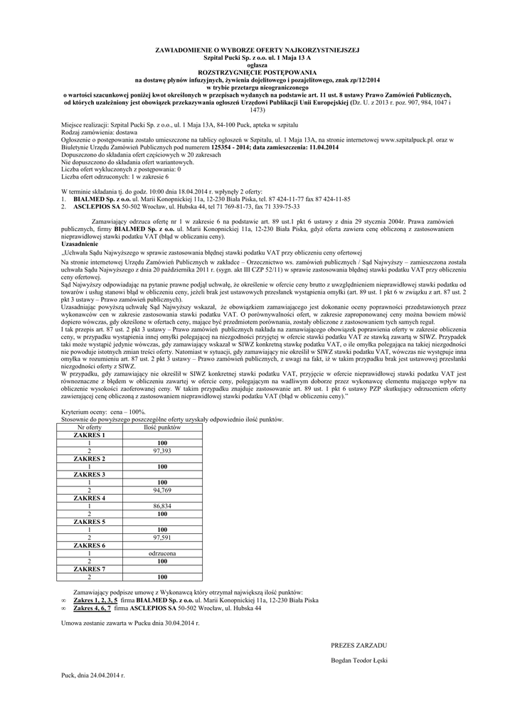 ZAWIADOMIENIE O WYBORZE OFERTY NAJKORZYSTNIEJSZEJ Szpital Pucki Sp. z o.o. ul. 1 Maja 13 A ogłasza ROZSTRZYGNIĘCIE POSTĘPOWANIA na dostawę płynów infuzyjnych, żywienia dojelitowego i pozajelitowego, znak zp/12/2014 w trybie przetargu nieograniczonego o wartości szacunkowej poniżej kwot określonych w przepisach wydanych na podstawie art. 11 ust. 8 ustawy Prawo Zamówień Publicznych, od których uzależniony jest obowiązek przekazywania ogłoszeń Urzędowi Publikacji Unii Europejskiej (Dz. U. z 2013 r. poz. 907, 984, 1047 i 1473) Miejsce realizacji: Szpital Pucki Sp. z o.o., ul. 1 Maja 13A, 84-100 Puck, apteka w szpitalu Rodzaj zamówienia: dostawa Ogłoszenie o postępowaniu zostało umieszczone na tablicy ogłoszeń w Szpitalu, ul. 1 Maja 13A, na stronie internetowej www.szpitalpuck.pl. oraz w Biuletynie Urzędu Zamówień Publicznych pod numerem 125354 - 2014; data zamieszczenia: 11.04.2014 Dopuszczono do składania ofert częściowych w 20 zakresach Nie dopuszczono do składania ofert wariantowych. Liczba ofert wykluczonych z postępowania: 0 Liczba ofert odrzuconych: 1 w zakresie 6 W terminie składania tj. do godz. 10:00 dnia 18.04.2014 r. wpłynęły 2 oferty: 1. BIALMED Sp. z o.o. ul. Marii Konopnickiej 11a, 12-230 Biała Piska, tel. 87 424-11-77 fax 87 424-11-85 2. ASCLEPIOS SA 50-502 Wrocław, ul. Hubska 44, tel 71 769-81-73, fax 71 339-75-33 Zamawiający odrzuca ofertę nr 1 w zakresie 6 na podstawie art. 89 ust.1 pkt 6 ustawy z dnia 29 stycznia 2004r. Prawa zamówień publicznych, firmy BIALMED Sp. z o.o. ul. Marii Konopnickiej 11a, 12-230 Biała Piska, gdyż oferta zawiera cenę obliczoną z zastosowaniem nieprawidłowej stawki podatku VAT (błąd w obliczaniu ceny). Uzasadnienie „Uchwała Sądu Najwyższego w sprawie zastosowania błędnej stawki podatku VAT przy obliczeniu ceny ofertowej Na stronie internetowej Urzędu Zamówień Publicznych w zakładce – Orzecznictwo ws. zamówień publicznych / Sąd Najwyższy – zamieszczona została uchwała Sądu Najwyższego z dnia 20 października 2011 r. (sygn. akt III CZP 52/11) w sprawie zastosowania błędnej stawki podatku VAT przy obliczeniu ceny ofertowej. Sąd Najwyższy odpowiadając na pytanie prawne podjął uchwałę, że określenie w ofercie ceny brutto z uwzględnieniem nieprawidłowej stawki podatku od towarów i usług stanowi błąd w obliczeniu ceny, jeżeli brak jest ustawowych przesłanek wystąpienia omyłki (art. 89 ust. 1 pkt 6 w związku z art. 87 ust. 2 pkt 3 ustawy – Prawo zamówień publicznych). Uzasadniając powyższą uchwałę Sąd Najwyższy wskazał, że obowiązkiem zamawiającego jest dokonanie oceny poprawności przedstawionych przez wykonawców cen w zakresie zastosowania stawki podatku VAT. O porównywalności ofert, w zakresie zaproponowanej ceny można bowiem mówić dopiero wówczas, gdy określone w ofertach ceny, mające być przedmiotem porównania, zostały obliczone z zastosowaniem tych samych reguł. I tak przepis art. 87 ust. 2 pkt 3 ustawy – Prawo zamówień publicznych nakłada na zamawiającego obowiązek poprawienia oferty w zakresie obliczenia ceny, w przypadku wystąpienia innej omyłki polegającej na niezgodności przyjętej w ofercie stawki podatku VAT ze stawką zawartą w SIWZ. Przypadek taki może wystąpić jedynie wówczas, gdy zamawiający wskazał w SIWZ konkretną stawkę podatku VAT, o ile omyłka polegająca na takiej niezgodności nie powoduje istotnych zmian treści oferty. Natomiast w sytuacji, gdy zamawiający nie określił w SIWZ stawki podatku VAT, wówczas nie występuje inna omyłka w rozumieniu art. 87 ust. 2 pkt 3 ustawy – Prawo zamówień publicznych, z uwagi na fakt, iż w takim przypadku brak jest ustawowej przesłanki niezgodności oferty z SIWZ. W przypadku, gdy zamawiający nie określił w SIWZ konkretnej stawki podatku VAT, przyjęcie w ofercie nieprawidłowej stawki podatku VAT jest równoznaczne z błędem w obliczeniu zawartej w ofercie ceny, polegającym na wadliwym doborze przez wykonawcę elementu mającego wpływ na obliczenie wysokości zaoferowanej ceny. W takim przypadku znajduje zastosowanie art. 89 ust. 1 pkt 6 ustawy PZP skutkujący odrzuceniem oferty zawierającej cenę obliczoną z zastosowaniem nieprawidłowej stawki podatku VAT (błąd w obliczeniu ceny).” Kryterium oceny: cena – 100%. Stosownie do powyższego poszczególne oferty uzyskały odpowiednio ilość punktów. Nr oferty Ilość punktów ZAKRES 1 1 100 2 97,393 ZAKRES 2 1 100 ZAKRES 3 1 100 2 94,769 ZAKRES 4 1 86,834 2 100 ZAKRES 5 1 100 2 97,591 ZAKRES 6 1 odrzucona 2 100 ZAKRES 7 2 100 • • Zamawiający podpisze umowę z Wykonawcą który otrzymał największą ilość punktów: Zakres 1, 2, 3, 5 firma BIALMED Sp. z o.o. ul. Marii Konopnickiej 11a, 12-230 Biała Piska Zakres 4, 6, 7 firma ASCLEPIOS SA 50-502 Wrocław, ul. Hubska 44 Umowa zostanie zawarta w Pucku dnia 30.04.2014 r. PREZES ZARZADU Bogdan Teodor Łęski Puck, dnia 24.04.2014 r.