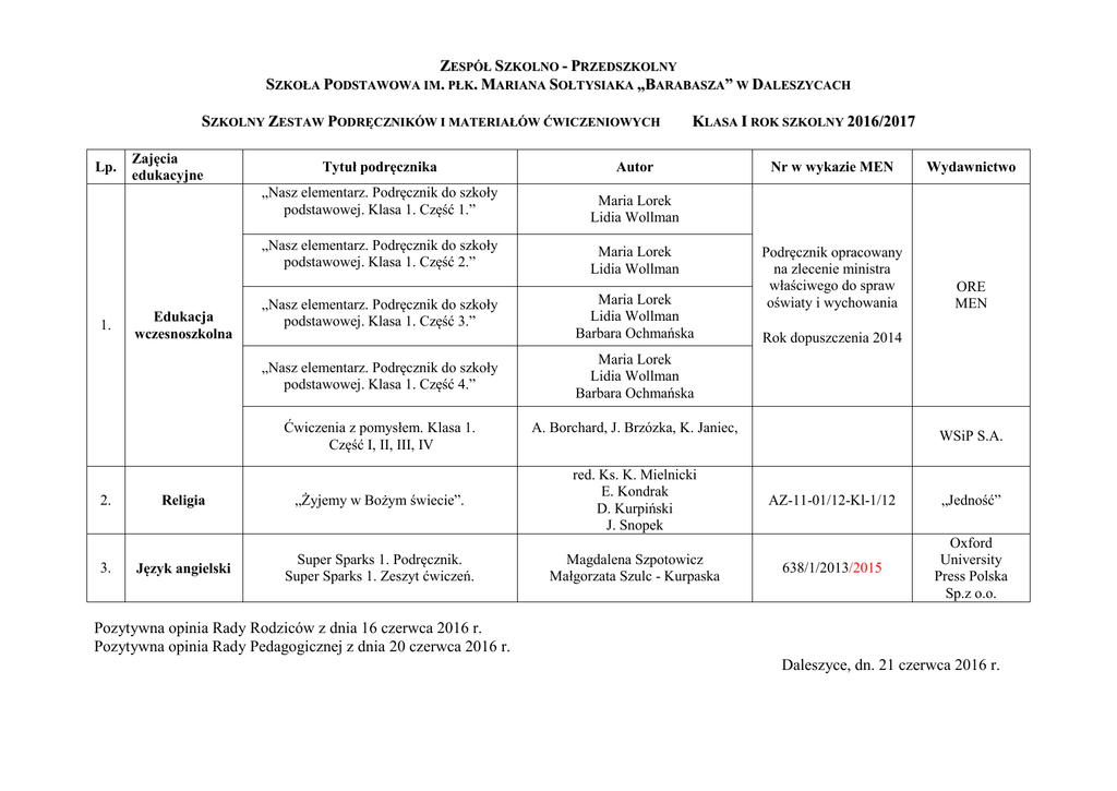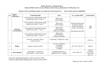 ZESPÓŁ SZKOLNO - PRZEDSZKOLNY SZKOŁA PODSTAWOWA IM. PŁK. MARIANA SOŁTYSIAKA „BARABASZA” W DALESZYCACH SZKOLNY ZESTAW PODRĘCZNIKÓW I MATERIAŁÓW ĆWICZENIOWYCH Lp. Zajęcia edukacyjne Tytuł podręcznika „Nasz elementarz. Podręcznik do szkoły podstawowej. Klasa 1. Część 1.” „Nasz elementarz. Podręcznik do szkoły podstawowej. Klasa 1. Część 2.” 1. 2. 3. Edukacja wczesnoszkolna „Nasz elementarz. Podręcznik do szkoły podstawowej. Klasa 1. Część 3.” KLASA I ROK SZKOLNY 2016/2017 Autor Nr w wykazie MEN Wydawnictwo Podręcznik opracowany na zlecenie ministra właściwego do spraw oświaty i wychowania ORE MEN Maria Lorek Lidia Wollman Maria Lorek Lidia Wollman Maria Lorek Lidia Wollman Barbara Ochmańska „Nasz elementarz. Podręcznik do szkoły podstawowej. Klasa 1. Część 4.” Maria Lorek Lidia Wollman Barbara Ochmańska Ćwiczenia z pomysłem. Klasa 1. Część I, II, III, IV A. Borchard, J. Brzózka, K. Janiec, Religia „Żyjemy w Bożym świecie”. red. Ks. K. Mielnicki E. Kondrak D. Kurpiński J. Snopek Język angielski Super Sparks 1. Podręcznik. Super Sparks 1. Zeszyt ćwiczeń. Magdalena Szpotowicz Małgorzata Szulc - Kurpaska Rok dopuszczenia 2014 WSiP S.A. AZ-11-01/12-Kl-1/12 „Jedność” 638/1/2013/2015 Oxford University Press Polska Sp.z o.o. Pozytywna opinia Rady Rodziców z dnia 16 czerwca 2016 r. Pozytywna opinia Rady Pedagogicznej z dnia 20 czerwca 2016 r. Daleszyce, dn. 21 czerwca 2016 r. ZESPÓŁ SZKOLNO - PRZEDSZKOLNY SZKOŁA PODSTAWOWA IM. PŁK. MARIANA SOŁTYSIAKA „BARABASZA” W DALESZYCACH SZKOLNY ZESTAW PODRĘCZNIKÓW I MATERIAŁÓW ĆWICZENIOWYCH Lp. 1. Zajęcia edukacyjne Edukacja wczesnoszkolna Tytuł podręcznika Autor „Nasza szkoła. Podręcznik do szkoły podstawowej. Klasa 2. Część 1A.” „Nasza szkoła. Matematyka. Podręcznik do szkoły podstawowej. Klasa 2. Część 1.” Maria Lorek Monika Zatorska „Nasza szkoła. Podręcznik do szkoły podstawowej. Klasa 2. Część 2,3,4” „Nasza szkoła. Matematyka. Podręcznik do szkoły podstawowej. Klasa 2. Część 2,3,4” Materiały ćwiczeniowe. „Ćwiczenia z pomysłem”. Klasa 2. cz. I, II, III, IV. Materiały ćwiczeniowe. „Ćwiczenia z pomysłem”. Klasa 2. Matematyka. Cz.I,II,III,IV. 2. 3. KLASA II ROK SZKOLNY 2016/2017 Religia „Idziemy do Jezusa”. Język angielski Super Sparks 2. Podręcznik. Super Sparks 2. Zeszyt ćwiczeń. Agata Ludwa wsp. Maria Lorek Maria Lorek Monika Zatorska Agata Ludwa wsp. Maria Lorek Nr w wykazie MEN Podręcznik opracowany na zlecenie ministra właściwego do spraw oświaty i wychowania ORE MEN Rok dopuszczenia 2015 J. Filipowicz, K. Harmak, K. Izbińska, dr. M. Fuszara J. Brzózka, A. Jasiocha, A. Chankowska red. Ks. J. Czerkawski E. Kondrak D. Kurpiński J. Snopek Paul A. Davies C. Graham Magdalena Szpotowicz Małgorzata Szulc Kurpaska Wydawnictwo WSiP S.A. AZ-12-01/12-Kl-3/12 „Jedność” 638/2/2014/2015 Oxford University Press Polska Sp.z o.o. Pozytywna opinia Rady Rodziców z dnia 16 czerwca 2016 r. Pozytywna opinia Rady Pedagogicznej z dnia 20 czerwca 2016 r. Daleszyce, dn. 21 czerwca 2016 r. ZESPÓŁ SZKOLNO - PRZEDSZKOLNY SZKOŁA PODSTAWOWA IM. PŁK. MARIANA SOŁTYSIAKA „BARABASZA” W DALESZYCACH SZKOLNY ZESTAW PODRĘCZNIKÓW I MATERIAŁÓW ĆWICZENIOWYCH Lp. Zajęcia edukacyjne Tytuł podręcznika Nasza szkoła. Podręcznik do szkoły podstawowej. Klasa 3. 1. Edukacja wczesnoszkolna Materiały ćwiczeniowe. Klasa 3. Ćwiczenia z pomysłem Materiały ćwiczeniowe. Klasa 3. Ćwiczenia z pomysłem. Matematyka „Jezus jest z nami” - podręcznik 2. 3. Religia Język angielski Jezus jest z nami – zeszyt ćwiczeń do religii dla klasy III szkoły podstawowej Super Sparks 3. Podręcznik. Super Sparks 3. Zeszyt ćwiczeń. KLASA III ROK SZKOLNY 2016/2017 Autor Nr w wykazie MEN Maria Lorek, Monika Zatorska, Agata Ludwa Podręcznik opracowany na zlecenie ministra właściwego do spraw oświaty i wychowania Jolanta Filipowicz, Katarzyna Harmak, Kamila Izbińska, Ewa Kłos, Wawrzyniec Kofta Jolanta Brzózka, Anna Jasiocha Dariusz Kurpiński Jerzy Snopek red. Jarosław Czerkawski Elżbieta Kondrak Paul A. Davies C. Graham Magdalena Szpotowicz Małgorzata Szulc Kurpaska Wydawnictwo ORE MEN WSiP S.A. WSiP S.A. AZ-13-01/12-Kl-4/13 „Jedność” 638/3/2014/2015 Oxford University Press Polska Sp.z o.o. Pozytywna opinia Rady Rodziców z dnia 16 czerwca 2016 r. Pozytywna opinia Rady Pedagogicznej z dnia 20 czerwca 2016 r. Daleszyce, dn. 21 czerwca 2016 r.