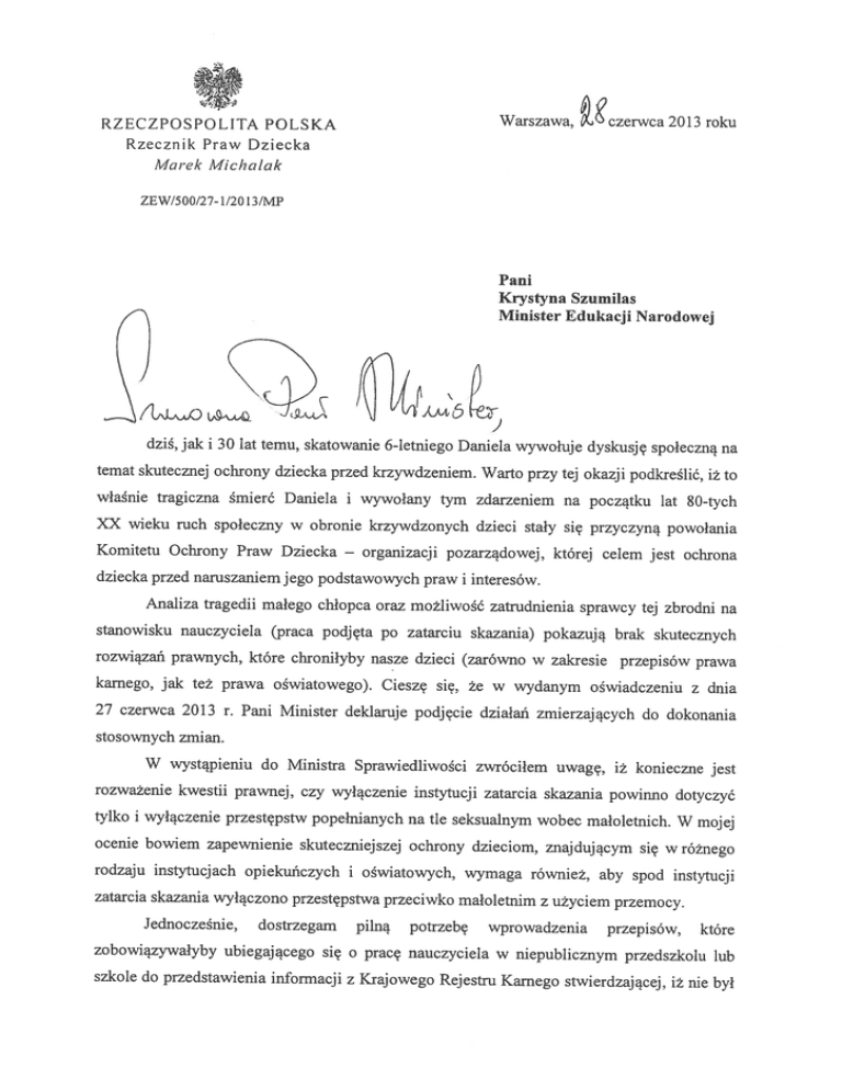4 MINISTER EDUKACJI NARODOWEJ DWST—WPZN —423189/BSZI13 Warszawa, 2013 -Q-4 Pan Marek Michalak Rzecznik Praw Dziecka Szanowny Panie, w odpowiedzi na Pana wystąpienie z dnia 28 czerwca 2013 r. (znak: ZEW/5001271/2013/MP), dotyczące m.in. wprowadzenia zmian w zakresie obowiązujących przepisów prawa mających na celu wzmocnienie standardów ochrony praw dziecka, poniżej przedstawiam wyjaśnienia w sprawie. Obowiązujące przepisy prawa oświatowego przewidują ochronę uczniów przed pozostawaniem w zawodzie nauczyciela osób, które zagrażają bezpieczeństwu dzieci. Dyrektor szkoły/organ prowadzący obowiązany jest zawiesić w czynnościach nauczyciela/dyrektora szkoły, wobec którego zaszło podejrzenie o popełnieniu przestępstwa przeciwko dzieciom lub innym małoletnim, o czym mowa w art. 83 ust. 1 ustawy z dnia 26 stycznia 1982 r. Karta Nauczyciela (Dz. U. z 2006 r. Nr 97, poz. - 674, z późn. zm.). Ponadto, zgodnie z art. 26 ust. 1 pkt 3 ww. ustawy w przypadku, gdy doszło do prawomocnego skazania za przestępstwo popełnione umyślnie, stosunek pracy nauczyciela wygasa z mocy prawa. Należy także zauważyć, że w przypadku potwierdzenia zarzutu uchybienia godności zawodu lub/i naruszenia obowiązków nauczyciela określonych w art. 6 ustawy Karta Nauczyciela, — nauczycielowi zostaje wymierzona jedna z kar dyscyplinarnych, adekwatna do stopnia przewinień zarzucanych obwinionemu nauczycielowi, określonych w art. 76 ust. 1 ustawy — Karta Nauczyciela tj. nagana z ostrzeżeniem, zwolnienie z pracy, zwolnienie z pracy z zakazem przyjmowania ukaranego do pracy w zawodzie nauczycielskim w okresie 3 lat od ukarania i wydalenie z zawodu nauczycielskiego. W „Projekcie założeń projektu ustawy o zmianie ustawy — Karta Nauczyciela i innych ustaw”, przesłanym w dniu 12 lipca br. pod obrady Rady Ministrów przewiduje się m.in. zmiany mające na celu dostosowanie regulacji dotyczących postępowań dyscyplinarnych nauczycieli do standardów konstytucyjnych i obowiązujących rozwiązań ustrojowych, a także wprowadzenie rozwiązań służących zapewnieniu sprawnego przebiegu postępowania dyscyplinarnego i wyeliminowaniu przewlekłości tych postępowań. wprowadzenie Mając na jednoznacznej uwadze bariery dobro dziecka, uniemożliwiającej przewidziano osobom także skazanym za przestępstwo popełnione umyślnie lub przeciwko którym toczy się postępowanie karne lub dyscyplinarne lub postępowanie o ubezwłasnowolnienie, podjęcie pracy w zawodzie nauczyciela. W obowiązującym stanie prawnym przepisy te nie mają bowiem zastosowania do nauczycieli zatrudnionych w publicznych przedszkolach, szkołach i placówkach prowadzonych przez osoby fizyczne oraz osoby prawne niebędące jednostkami samorządu terytorialnego, przedszkolach niepublicznych, niepublicznych placówkach oraz szkołach niepublicznych o uprawnieniach szkół publicznych, co zostało podniesione w Pana wystąpieniu. Może zatem zaistnieć sytuacja, że w ww. szkołach i placówkach pracę w zawodzie nauczyciela podejmie osoba skazana za przestępstwo popełnione umyślnie, w tym za przestępstwo, w którym pokrzywdzonym było dziecko. Spełnianie warunku niekaralności za przestępstwo popełnione umyślnie będzie potwierdzane zgodnie z art. 10 ust. 8a ustawy Karta Nauczyciela,tj. nauczyciel, przed nawiązaniem stosunku pracy, będzie obowiązany przedstawić dyrektorowi szkoły informację z Krajowego Rejestru — Karnego. Ponadto, w przypadku publicznych przedszkoli, szkół i placówek prowadzonych przez osoby fizyczne oraz osoby prawne niebędące jednostkami samorządu terytorialnego, przedszkoli niepublicznych, niepublicznych placówek oświatowych oraz szkół ustawy niepublicznych o uprawnieniach szkół publicznych - przepisy art. 26 Karta Nauczyciela dotyczące wygaśnięcia stosunku pracy oraz art. 75-85 tej ustawy dotyczące odpowiedzialności dyscyplinarnej mają obecnie zastosowanie — wyłącznie do nauczycieli zatrudnionych w wymiarze co najmniej % obowiązkowego wymiaru zajęć. Innymi słowy, nauczyciele zatrudnieni w niższym wymiarze nie podlegają odpowiedzialności dyscyplinarnej, a więc nie można orzec w stosunku 2 do nich m.in. zakazu przyjmowania do pracy w zawodzie nauczycielskim przez pewien okres ani też wydalić takiego nauczyciela z zawodu. Nauczyciel, z którym zostanie rozwiązany stosunek pracy z uwagi na popełnienie przewinienia uniemożliwiającego dalszą pracę w szkole, może więc podjąć pracę w innej szkole. W celu wyeliminowania takich zjawisk i zapewnienia odpowiedniej ochrony uczniom zakłada się rozciągnięcie przepisów art. 26 i art. 75-85 ustawy — Karta Nauczyciela na wszystkich nauczycieli ww. publicznych i niepublicznych szkół i placówek, bez względu na wymiar zatrudnienia. Odnosząc się jeszcze do kwestii odpowiedzialności dyscyplinarnej nauczycieli, w projekcie założeń projektu ustawy o zmianie ustawy Karta Nauczyciela oraz — niektórych innych ustaw przewiduje się m.in. wprowadzenie centralnego rejestru orzeczeń dyscyplinarnych Obowiązujące przepisy ustawy Karta Nauczyciela nie — zawierają skutecznych mechanizmów gwarantujących, iż osoba, która była ukarana karą dyscyplinarną wydalenia z zawodu nauczycielskiego lub zwolnienia z pracy z zakazem przyjmowania ukaranego do pracy w zawodzie nauczycielskim w okresie 3 lat od ukarania, nie zostanie następnie zatrudniona na stanowisku nauczyciela. Obecnie brak jest bowiem podstaw do prowadzenia centralnego rejestru wydanych orzeczeń dyscyplinarnych, a dyrektor szkoły przed nawiązaniem stosunku pracy z nauczycielem nie ma obowiązku zasięgania takich informacji. Z uwagi na fakt, iż sytuacja ta stanowi zagrożenie naruszenia praw i dobra dziecka ze strony zatrudnionego z naruszeniem obowiązujących przepisów prawa nauczyciela ukaranego jedną z ww. kar dyscyplinarnych, przewiduje się stworzenie w ustawie skutecznej bariery uniemożliwiającej zatrudnienie t