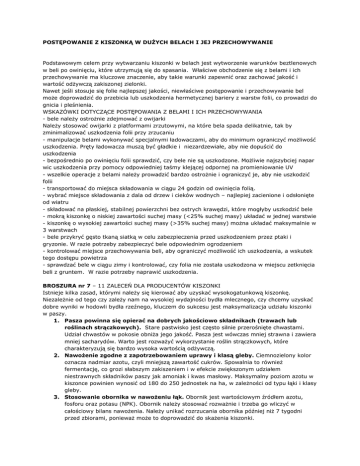 POSTĘPOWANIE Z KISZONKĄ W DUŻYCH BELACH I JEJ PRZECHOWYWANIE Podstawowym celem przy wytwarzaniu kiszonki w belach jest wytworzenie warunków beztlenowych w beli po owinięciu, które utrzymują się do spasania. Właściwe obchodzenie się z belami i ich przechowywanie ma kluczowe znaczenie, aby takie warunki zapewnić oraz zachować jakość i wartość odżywczą zakiszonej zielonki. Nawet jeśli stosuje się folie najlepszej jakości, niewłaściwe postępowanie i przechowywanie bel może doprowadzić do przebicia lub uszkodzenia hermetycznej bariery z warstw folii, co prowadzi do gnicia i pleśnienia. WSKAZÓWKI DOTYCZĄCE POSTĘPOWANIA Z BELAMI I ICH PRZECHOWYWANIA - bele należy ostrożnie zdejmować z owijarki Należy stosować owijarki z platformami zrzutowymi, na które bela spada delikatnie, tak by zminimalizować uszkodzenia folii przy zrzucaniu - manipulacje belami wykonywać specjalnymi ładowaczami, aby do minimum ograniczyć możliwość uszkodzenia. Pręty ładowacza muszą być gładkie i niezardzewiałe, aby nie dopuścić do uszkodzenia - bezpośrednio po owinięciu folii sprawdzić, czy bele nie są uszkodzone. Możliwie najszybciej napar wic uszkodzenia przy pomocy odpowiedniej taśmy klejącej odpornej na promieniowanie UV - wszelkie operacje z belami należy prowadzić bardzo ostrożnie i ograniczyć je, aby nie uszkodzić folii - transportować do miejsca składowania w ciągu 24 godzin od owinięcia folią. - wybrać miejsce składowania z dala od drzew i cieków wodnych – najlepiej zacienione i odsłonięte od wiatru - składować na płaskiej, stabilnej powierzchni bez ostrych krawędzi, które mogłyby uszkodzić bele - mokrą kiszonkę o niskiej zawartości suchej masy (<25% suchej masy) układać w jednej warstwie - kiszonkę o wysokiej zawartości suchej masy (>35% suchej masy) można układać maksymalnie w 3 warstwach - bele przykryć gęsto tkaną siatką w celu zabezpieczenia przed uszkodzeniem przez ptaki i gryzonie. W razie potrzeby zabezpieczyć bele odpowiednim ogrodzeniem - kontrolować miejsce przechowywania beli, aby ograniczyć możliwość ich uszkodzenia, a wskutek tego dostępu powietrza - sprawdzać bele w ciągu zimy i kontrolować, czy folia nie została uszkodzona w miejscu zetknięcia beli z gruntem. W razie potrzeby naprawić uszkodzenia. BROSZURA nr 7 – 11 ZALECEŃ DLA PRODUCENTÓW KISZONKI Istnieje kilka zasad, którymi należy się kierować aby uzyskać wysokogatunkową kiszonkę. Niezależnie od tego czy zależy nam na wysokiej wydajności bydła mlecznego, czy chcemy uzyskać dobre wyniki w hodowli bydła rzeźnego, kluczem do sukcesu jest maksymalizacja udziału kiszonki w paszy. 1. Pasza powinna się opierać na dobrych jakościowo składnikach (trawach lub roślinach strączkowych). Stare pastwisko jest często silnie przerośnięte chwastami. Udział chwastów w pokosie obniża jego jakość. Pasza jest wówczas mniej strawna i zawiera mniej sacharydów. Warto jest rozważyć wykorzystanie roślin strączkowych, które charakteryzują się bardzo wysoka wartością odżywczą. 2. Nawożenie zgodne z zapotrzebowaniem uprawy i klasą gleby. Ciemnozielony kolor oznacza nadmiar azotu, czyli mniejszą zawartość cukrów. Spowalnia to również fermentację, co grozi słabszym zakiszeniem i w efekcie zwiększonym udziałem niestrawnych składników paszy jak amoniak i kwas masłowy. Maksymalny poziom azotu w kiszonce powinien wynosić od 180 do 250 jednostek na ha, w zależności od typu łąki i klasy gleby. 3. Stosowanie obornika w nawożeniu łąk. Obornik jest wartościowym źródłem azotu, fosforu oraz potasu (NPK). Obornik należy stosować rozważnie i trzeba go wliczyć w całościowy bilans nawożenia. Należy unikać rozrzucania obornika później niż 7 tygodni przed zbiorami, ponieważ może to doprowadzić do skażenia kiszonki. 4. Do koszenia przystępujemy w odpowiednim stadium rozwoju zielonki. Wysokoprzyswajalna kiszonka (70+) powinna być koszona we wczesnym okresie strzelania w źdźbło. Należy zatem dobrać moment, w którym łodyga zaczyna pęcznieć – jest to najlepszy czas na koszenie. Każdy kolejny tydzień opóźnienia pokosów majowych oznacza spadek wartości odżywczych kiszonki o 1,8 jednostki. 5. Zielonkę tniemy na odpowiedniej wysokości i gdy jest sucha. Zielonkę tniemy na wysokości 5 – 20 cm, w zalewności od ryzyka skażenia gleby. W ten sposób upewniamy się, że martwa materia pozostanie na polu. Kosić należy, gdy uprawa jest sucha, w innym przypadku woda zostanie zatrzymana w pokosie i ciężko go będzie osuszyć. 6. Podsuszanie pokosu. Im szybciej podsuszy się pokos (pożądany udział suchej masy dla belowanej kiszonki to 35-55% objętości) tym niższe będą straty energetyczne oraz mniejsze ryzyko skażenia pleśnią i drożdżami paszowymi. WPŁYW AFZY ROZWOJU UPRAWY NA EFEKTYWNOŚĆ ENERGETYCZNĄ I ZAWARTOŚĆ PROTEIN Etap rozwoju łodyg i liści w Wartość energetyczna Zawartość protein (%) uprawie (MJ/kg suchej masy) Uprawa silnie uliściona, brak 12 18 łodyg Uprawa uliściona, z rzadka 11 16 widoczne łodygi Uprawa uliściona z 10 14 kwitnącymi łodygami Uprawa średnio uliściona z 9 12 dużą liczbą kwitnących łodyg Łodygi w pełni rozwinięte, 8 10 uprawa wchodzi w okres kwitnienia 7. Stosowanie belownicy tnącej. Przy zastosowaniu belownicy tnącej zwiększa się gęstość kiszonki w beli, co ułatwia fermentacje przez ograniczenie dostępu powietrza. Bardziej zbita kiszonka oznacza mniej beli na ha uprawy, co znacznie wpływa na obniżenie kosztów. Układanie zbitych beli o tym samym rozmiarze znacznie ułatwia owijanie i składowanie kiszonki. 8. Stosowanie dodatków do kiszonki. Stosowanie dodatków ułatwia fermentację oraz zatrzymanie składników odżywczych w kiszonce. 9. Stosowanie folii o wysokiej jakości. Folia wysokiej jakości odznacza się lepszą wytrzymałością i lepkością, co zmniejsza ryzyko dostępu tlenu po zbelowaniu. Przy