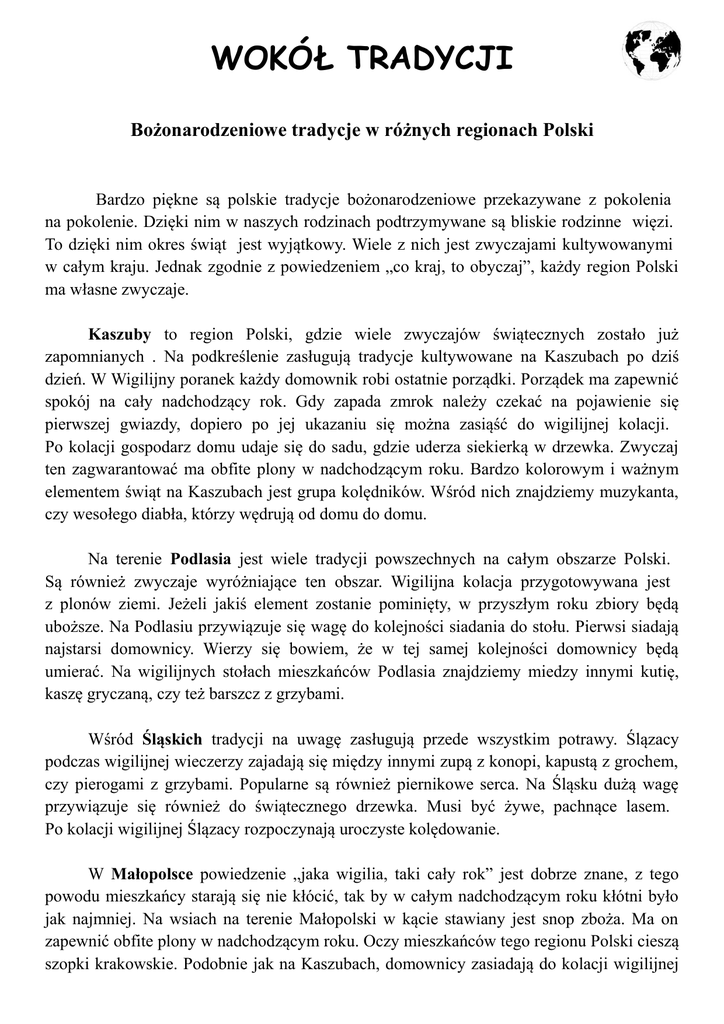 WOKÓŁ TRADYCJI Bożonarodzeniowe tradycje w różnych regionach Polski Bardzo piękne są polskie tradycje bożonarodzeniowe przekazywane z pokolenia na pokolenie. Dzięki nim w naszych rodzinach podtrzymywane są bliskie rodzinne więzi. To dzięki nim okres świąt jest wyjątkowy. Wiele z nich jest zwyczajami kultywowanymi w całym kraju. Jednak zgodnie z powiedzeniem „co kraj, to obyczaj”, każdy region Polski ma własne zwyczaje. Kaszuby to region Polski, gdzie wiele zwyczajów świątecznych zostało już zapomnianych . Na podkreślenie zasługują tradycje kultywowane na Kaszubach po dziś dzień. W Wigilijny poranek każdy domownik robi ostatnie porządki. Porządek ma zapewnić spokój na cały nadchodzący rok. Gdy zapada zmrok należy czekać na pojawienie się pierwszej gwiazdy, dopiero po jej ukazaniu się można zasiąść do wigilijnej kolacji. Po kolacji gospodarz domu udaje się do sadu, gdzie uderza siekierką w drzewka. Zwyczaj ten zagwarantować ma obfite plony w nadchodzącym roku. Bardzo kolorowym i ważnym elementem świąt na Kaszubach jest grupa kolędników. Wśród nich znajdziemy muzykanta, czy wesołego diabła, którzy wędrują od domu do domu. Na terenie Podlasia jest wiele tradycji powszechnych na całym obszarze Polski. Są również zwyczaje wyróżniające ten obszar. Wigilijna kolacja przygotowywana jest z plonów ziemi. Jeżeli jakiś element zostanie pominięty, w przyszłym roku zbiory będą uboższe. Na Podlasiu przywiązuje się wagę do kolejności siadania do stołu. Pierwsi siadają najstarsi domownicy. Wierzy się bowiem, że w tej samej kolejności domownicy będą umierać. Na wigilijnych stołach mieszkańców Podlasia znajdziemy miedzy innymi kutię, kaszę gryczaną, czy też barszcz z grzybami. Wśród Śląskich tradycji na uwagę zasługują przede wszystkim potrawy. Ślązacy podczas wigilijnej wieczerzy zajadają się między innymi zupą z konopi, kapustą z grochem, czy pierogami z grzybami. Popularne są również piernikowe serca. Na Śląsku dużą wagę przywiązuje się również do świątecznego drzewka. Musi być żywe, pachnące lasem. Po kolacji wigilijnej Ślązacy rozpoczynają uroczyste kolędowanie. W Małopolsce powiedzenie „jaka wigilia, taki cały rok” jest dobrze znane, z tego powodu mieszkańcy starają się nie kłócić, tak by w całym nadchodzącym roku kłótni było jak najmniej. Na wsiach na terenie Małopolski w kącie stawiany jest snop zboża. Ma on zapewnić obfite plony w nadchodzącym roku. Oczy mieszkańców tego regionu Polski cieszą szopki krakowskie. Podobnie jak na Kaszubach, domownicy zasiadają do kolacji wigilijnej WOKÓŁ TRADYCJI dopiero bo ujrzeniu pierwszej gwiazdy. Podczas wigilii na stole cały czas czeka nakrycie na nieoczekiwanego gościa, zbłąkanego wędrowca. Wśród potraw na stołach mieszkańców Małopolski królują kluski z makiem oraz polski karp. Mojka to w gwarze podhalańskiej choinka. Dawniej na terenie Podhala gospodarz przynosił żywą, pachnącą choinkę do domu, gdzie następnie dekorowano ją czerwonymi jabłkami, cukierkami oraz zabawkami przygotowanymi przez dzieci. Dziś ta dekoracja zastąpiona została bombkami. Pod obrus na wigilijnym stole wkładane jest sianko. Po wieczerzy rozpoczyna się wspólne kolędowanie. Na Podhalu często trwa ono do samego rana! Tradycją świąteczną na Lubelszczyźnie jest pachnąca lasem choinka, która przystrojona jest bombkami, łańcuchami oraz co istotne jabłkami, gdyż te owoce były na biblijnym drzewie. Kolacja składa się z dwunastu potraw. Na wigilijnych stołach mieszkańców Lubelszczyzny znajdziemy między innymi: kapustę z grochem i grzybami, czy śledzie. Po kolacji wszystkie resztki oraz opłatek zanoszone zwierzętom. O godzinie 12 cała rodzina udaje się na uroczystą pasterkę. Poza tradycjami świątecznymi, wymienionymi w poszczególnych regionach Polski na uwagę zasługują również zwyczaje powszechne na terenie całego naszego kraju. Żaden Polak nie wyobraża sobie wigilijnej kolacji, przed którą nie dzielimy się opłatkiem, składając życzenia naszym bliskim. Na wigilijnym stole wielu Polaków gości tradycyjnie 12 bezmięsnych potraw. Oczy cieszy kolorowa choinka z pięknymi, ciepłymi lampkami. To właśnie zwyczaje świąteczne sprawiają, że okres Bożego Narodzenia jest pełen ciepła. Tradycje przekazywane z pokolenia na pokolenie sprawiają, że wielu z nas z utęsknieniem czeka na świąteczny, grudniowy czas. opr. Bożena Tytuła