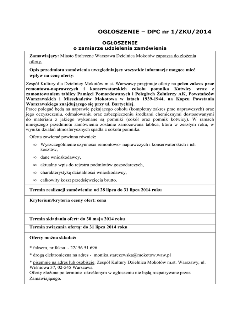 OGŁOSZENIE – DPC nr 1/ZKU/2014 OGŁOSZENIE o zamiarze udzielenia zamówienia Zamawiający: Miasto Stołeczne Warszawa Dzielnica Mokotów zaprasza do złoŜenia oferty. Opis przedmiotu zamówienia uwzględniający wszystkie informacje mogące mieć wpływ na cenę oferty: Zespół Kultury dla Dzielnicy Mokotów m.st. Warszawy przyjmuje oferty na pełen zakres prac remontowo-naprawczych i konserwatorskich cokołu pomnika Kotwicy wraz z zamontowaniem tablicy Pamięci Pomordowanych i Poległych śołnierzy AK, Powstańców Warszawskich i Mieszkańców Mokotowa w latach 1939-1944, na Kopcu Powstania Warszawskiego znajdującego się przy ul. Bartyckiej. Prace polegać będą na naprawie pękającego cokołu (kompletny zakres prac naprawczych) oraz jego oczyszczeniu, odmalowaniu oraz zabezpieczeniu środkami chemicznymi dostosowanymi do materiału z jakiego wykonane są pomniki (cokół oraz pomnik kotwicy). W ramach niniejszego przedmiotu zamówienia zostanie zamocowana tablica, która w zeszłym roku, w wyniku działań atmosferycznych spadła z cokołu pomnika. Oferta zawierać powinna równieŜ: • Wyszczególnienie czynności remontowo- naprawczych i konserwatorskich i ich kosztów, • dane wnioskodawcy, • aktualny wpis do rejestru podmiotów gospodarczych, • charakterystykę działalności wnioskodawcy, • całkowity koszt przedsięwzięcia brutto. Termin realizacji zamówienia: od 28 lipca do 31 lipca 2014 roku Kryterium/kryteria oceny ofert: cena Termin składania ofert: do 30 maja 2014 roku Termin związania ofertą: do 31 lipca 2014 roku Oferty moŜna składać: * faksem, nr faksu - 22/ 56 51 696 * drogą elektroniczną na adres - [email protected] * pisemnie na adres lub osobiście: Zespół Kultury Dzielnica Mokotów m.st. Warszawy, ul. Wiśniowa 37, 02-545 Warszawa Oferty złoŜone po terminie określonym w ogłoszeniu nie będą rozpatrywane przez Zamawiającego. Oferta będzie rozpatrywana przez Zamawiającego, jeŜeli Zamawiający otrzyma ją przed terminem składania ofert określonym w Ogłoszeniu. Komórka organizacyjna Urzędu Dzielnicy Mokotów m.st. Warszawy realizująca wydatek: Zespół Kultury Osoba do kontaktu: Monika Starczewska tel. : (22) 56-51-691 Informacje dodatkowe: 1. Zamawiający będzie rozpatrywał oferty złoŜone zgodnie z Ogłoszeniem. 2. Zamawiający udzieli zamówienia Wykonawcy, którego oferta zostanie wybrana jako najkorzystniejsza. 3. Niezwłocznie po rozpatrzeniu ofert Zamawiający informuje na stronie internetowej Urzędu, na której zostało zamieszczone Ogłoszenie, o wyborze najkorzystniejszej oferty lub o uniewaŜnieniu postępowania. 4. Zamawiający zastrzega sobie prawo do zmiany Ogłoszenia bez podania przyczyn. 5. Zamawiający zastrzega sobie prawo odwołania Ogłoszenia w kaŜdym czasie bez podawania przyczyn. 6. W sprawach nie ujętych w Ogłoszeniu mają zastosowanie przepisy kodeksu cywilnego. Załączniki 1. wzór umowy 2. wzór oferty 15.05.2014 Monika Starczewska (z upowaŜnienia kierownika) data, podpis i pieczęć Kierownika komórki realizującej wniosek * wzór umowy winien być parafowany przez Radcę Prawnego, właściwego pracownika WBK oraz Kierownika komórki