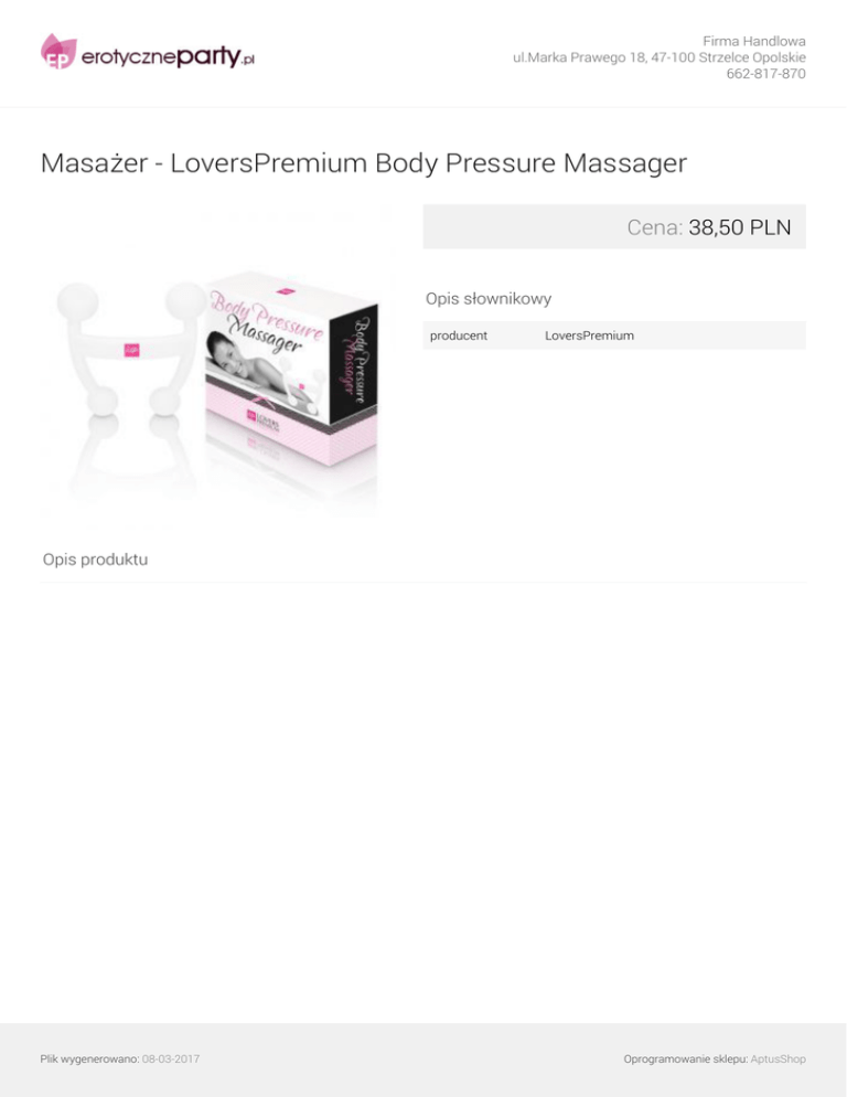 Firma Handlowa ul.Marka Prawego 18, 47-100 Strzelce Opolskie 662-817-870 Masażer - LoversPremium Body Pressure Massager Cena: 38,50 PLN Opis słownikowy producent LoversPremium Opis produktu Plik wygenerowano: 08-03-2017 Oprogramowanie sklepu: AptusShop Firma Handlowa ul.Marka Prawego 18, 47-100 Strzelce Opolskie 662-817-870 Ergonomcznie ukszta?towany masa?er z czterema punktami nacisku. Pozwala w prosty sposób na przy?o?enie odpowiedniej si?y do intensywnego masa?u mi??ni shiatsu. Masuj i roluj po ciele by usun?? stres. Najwa?niejsze cechy tego produktu: wymiary 4x12x12,5cm (wysoko??, szeroko??, d?ugo??) lekki i por?czny pozwala na samodzielny masa? wymiary odpowiednie by zawsze zabra? go ze sob? ergonomiczny kszta?t pozwalaj?cy na ?atwy masa? sprzedawany w pude?ku ozdobnym Plik wygenerowano: 08-03-2017 Powered by TCPDF (www.tcpdf.org) Oprogramowanie sklepu: AptusShop