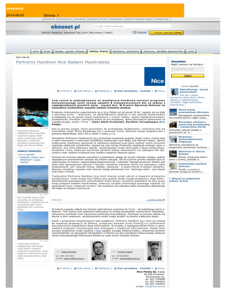 oknonet.pl 2014-06-03 Strona: 1 oknonet.pl oknotube.pl oknoblog stolmap forum newsletter pobierz Windoor Expert PRACA Redakcja download Daj cynk! Nasi Klienci TARGI okna drzwi fasady, ogrody zimowe osłony, bramy FORUM dostawcy, akcesoria zaloguj się DODAJ SWOJĄ FIRMĘ! maszyny, obróbka powierzchni szkło 2014-06-03 Partnerzy Handlowi Nice śladami Hipokratesa Newsletter Bądź zawsze na bieżąco. Podaj swój e-mail... Zapisz O firmie | Cała oferta | Publikacje | Sieć sprzedaży - kontakt | Praca Tym razem w podziękowaniu za współpracę handlową laureaci programu motywacyjnego mieli okazję spędzić 8 niezapomnianych dni na jednej z najpiękniejszych greckich wysp - wyspie Kos. W Krainie Ogrzanej Słońcem na wszystkich uczestników wyjazdu czekało mnóstwo atrakcji. Programy motywacyjne organizowane są w Nice Polska już od ponad 10 lat i wpisały się na stałe w p o l i t y k ę f i r m y . - Wierzymy, że doświadczenia zdobyte w taki sposób bezpośrednio przekładają się na jakość relacji budowanych z innymi ludźmi, często współpracownikami, przełożonymi, klientami. Dzisiejszy biznes to gra zespołowa, której kluczowymi elementami są współpracujący ludzie i firmy - mówi Adam Krużyński, Dyrektor Zarządzający Nice Polska. fot. NICE Wszystkich Partnerów Handlowych Nice przywitała wspaniała pogoda, dzięki czemu można było w pełni skorzystać z możliwości kompleksu hotelowego Club Magic Life Marmari Palace. ZOBACZ RÓWNIEŻ: KONKURS! Wybierz okna OKNOPLAST i wygraj wakacje! Kos to grecka wyspa, która przynależy do archipelagu Dodekanezu i położona jest we wschodniej części Morza Egejskiego tuż u wybrzeży Turcji. Górzysta wyspa związana jest z postacią Hipokratesa, który żył tu około V wieku p.n.e. Wszystkich Partnerów Handlowych Nice przywitała wspaniała pogoda, dzięki czemu można było w pełni skorzystać z możliwości kompleksu hotelowego Club Magic Life Marmari Palace. Oprócz tradycyjnej rywalizacji sportowej w siatkówce plażowej oraz piłce wodnej, która corocznie angażuje większość uczestników, pojawił się cały szereg możliwości spędzania wolnego czasu w aktywny, lecz nieco odmienny sposób. Zainteresowani mogli skorzystać z lekcji windsurfingu, strzelania z łuku, lokalnych wycieczek górskich (także rowerowych) czy zabiegów fish spa. Lokalny wiatr meltemi orzeźwiał oraz chłodził rozpalone Słońcem głowy. Formuła All Inclusive dawała wszystkich uczestnikom dostęp do kuchni różnego rodzaju, jednak największym powodzeniem cieszyły się lokalne specjały. Od lat kuchnia grecka uważana jest za najzdrowszą na świecie, zapewniającą długowieczność i witalność. Niezaprzeczalnym faktem jest duża ilość spożywanych warzyw i owoców, wszelkiej zieleniny (horty czy szpinaku), roślin strączkowych, ryb i owoców morza, nabiału i pieczywa - w dużej mierze w postaci sucharów. Wszyscy uczestnicy wyjazdu mieli również okazję skosztować tzw. "płynnego złota", czyli oliwek oraz oliwy z oliwek. Tradycyjnie Partnerzy Handlowi Nice m i e l i o k a z j ę w z i ą ć u d z i a ł w b o g a t y m p r o g r a m i e turystycznym. Uroki wyspy Kos można było poznać dzięki zorganizowanemu Jeep Safari. Samodzielnie prowadzonymi samochodami marki Suzuki uczestnicy podzieleni na dwie grupy mogli podążać śladami Hipokratesa, zobaczyć szczątki pierwszego greckiego szpitala czy skosztować wina z lokalnych winiarni. Na wyjeździe nie zabrakło także elementów delikatnego off-roadu na trasach szutrowych. fot. NICE Kos to grecka wyspa, która przynależy do archipelagu Dodekanezu i położona jest we wschodniej części Morza Egejskiego tuż u wybrzeży Turcji. Reklama ...czytaj dalej ▼ W trakcie wyjazdu odbyła się również jednodniowa wyprawa do Turcji - do pobliskiego portu w Bodrum. Tam można było podziwiać zachowane do dzisiaj pozostałości nadmorskich wiatraków, odnowiony amfiteatr oraz luksusową jubilerską manufakturę. Ponieważ wycieczka odbyła się akurat w dniu targowym, zainteresowane osoby mogły przejść na lokalny tradycyjny bazar. Każdy z programów motywacyjnych jest wyjątkowy. Partnerzy Handlowi Nice mieli już okazję do wspólnej ekspedycji na Saharę, przeprawy barkami przez Francję czy podziwiania futurystycznych krajobrazów Wysp Kanaryjskich. W związku z zaangażowaniem firmy w sport, niektóre programy motywacyjne były powiązane z wspólnym kibicowaniem. Dzięki temu laureaci programów mogli wspólnie z Nice oglądać występy Roberta Kubicy, oklaskiwać polskich reprezentantów na Igrzyskach Olimpijskich w Pekinie czy być świadkami historycznego zdobycia tytułu Indywidualnego Mistrzostwa Świata na żużlu przez Tomasza Golloba. fot. NICE Tradycyjnie Partnerzy Handlowi Nice mieli okazję wziąć udział w bogatym programie turystycznym. Uroki wyspy Kos można było poznać dzięki zorganizowanemu Jeep Safari. red. Paweł Sommer red. Tomasz Pępek tel. 509 230 592 e-mail: [email protected] tel. 507029852 e-mail: [email protected] O firmie | Cała oferta | Publikacje | Sieć sprzedaży - kontakt | Praca Nice Polska Sp. z o.o. 05-800 Pruszków Parzniewska 2a tel. 022 7594000 tel. 022 7594012 fax 022 7594022 e-mail: [email protected] AlpineEnergy- szczyt doskonałości Tak jak z pasją tworzymy nasze okna i drzwi, dbając o najdrobniejszy szczegół, ciągle podnosząc poprzeczkę... Nowe bramy przemysłowe Hörmann Wymagania użytkowników hal produkcyjnych ciągle rosną... Schweiker wkrótce z nową halą produkcyjną i rozszerzoną ofertą Schweiker zakupił działkę o powierzchni ok. 5... Okiennice zautomatyzowana elegancja Okiennice zewnętrzne są eleganckim elementem wystroju... Okiennice w ofercie Domela Domel, producent okien i drzwi z Łomży, posiada w... Automatyka zasilana słońcem Somfy, w trosce o klientów ceniących komfort i... > Więcej na subportalu osłony, bramy oknonet.pl 2014-06-03 Strona: 2 http://www.nice.pl | DODAJ 