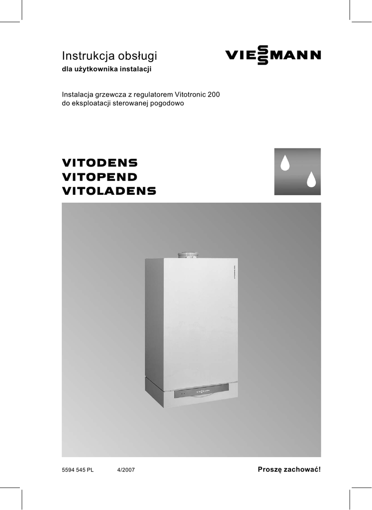 Instrukcja obsługi VIESMANN dla użytkownika instalacji Instalacja grzewcza z regulatorem Vitotronic 200 do eksploatacji sterowanej pogodowo VITODENS VITOPEND VITOLADENS 5594 545 PL 4/2007 Proszę zachować! Wskazówki bezpieczeństwa Dla własnego bezpieczeństwa Prosimy o dokładne przestrzeganie wskazówek bezpieczeństwa w celu wykluczenia ryzyka utraty zdrowia oraz powstania szkód materialnych. Niebezpieczeństwo Ten znak ostrzega przed niebezpieczeństwem zranienia. ! Uwaga Ten znak ostrzega przed stratami materialnymi i zanieczyszczeniem środowiska. Wskazówka Tekst oznaczony słowem Wskazówka zawiera dodatkowe informacje. Przeznaczenie Niniejsza instrukcja obsługi skierowana jest do osób obsługujących instalację grzewczą. Niebezpieczeństwo Niefachowo przeprowadzone prace przy instalacji grzewczej mogą doprowadzić do wypadków zagrażających życiu. & Prace przy instalacji gazowej może wykonywać wyłącznie instalator posiadający odpowiednie uprawnienia. & Prace na podzespołach elektrycznych mogą być wykonywane tylko przez wykwalifikowany personel. 2 Jeżeli występuje zapach gazu Niebezpieczeństwo Ulatniający się gaz może spowodować eksplozję, a w jej następstwie ciężkie obrażenia. & Nie palić! Nie dopuszczać do powstania otwartego ognia i tworzenia się iskier. Pod żadnym pozorem nie włączać ani nie wyłączać oświetlenia i urządzeń elektrycznych. & Zamknąć zawór odcinający gaz. & Otworzyć okna i drzwi. & Ewakuować osoby z obszaru zagrożenia. & Zawiadomić zakład gazowniczy, energetyczny i firmę instalatorską z miejsca poza budynkiem. & Zasilanie prądowe budynku rozłączyć z bezpiecznego miejsca (z miejsca poza budynkiem). Jeżeli występuje zapach spalin Niebezpieczeństwo Wdychanie spalin może powodować zatrucia zagrażające życiu i zdrowiu. & Wyłączyć instalację grzewczą. & Przewietrzyć pomieszczenie kotłowni. & Zamknąć drzwi prowadzące do pomieszczeń mieszkalnych. 5594 545 PL Objaśnienia do wskazówek bezpieczeństwa Wskazówki bezpieczeństwa Dla własnego bezpieczeństwa (ciąg dalszy) Zachowanie w razie pożaru Niebezpieczeństwo Podczas pożaru istnieje niebezpieczeństwo poparzenia i eksplozji. & Wyłączyć instalację grzewczą. & Zamknąć zawory odcinające dopływ paliwa. & Używać tylko atestowanych gaśnic klasy pożarowej ABC. Elementy dodatkowe, części zamienne i szybkozużywalne ! Uwaga Elementy, które nie zostały sprawdzone w połączeniu z instalacją grzewczą, mogą spowodować jej uszkodzenie lub zakłócić prawidłowe funkcjonowanie. Montażu lub wymiany może dokonywać tylko firma specjalistyczna. Wymogi dotyczące kotłowni Uwaga Nieodpowiednie warunki otoczenia mogą spowodować uszkodzenie instalacji grzewczej i zagrozić bezpieczeństwu eksploatacji. & Zapewnić temperaturę otoczenia między 0ºC i 35ºC. & Powietrze w kotłowni nie może być zanieczyszczone przez chlorowco‐alkany (zawarte np. w aerozolach, farbach, rozpuszczalnikach i środkach czyszczących); unikać silnego zapylenia (np. wskutek prac szlifierskich). & Unikać długotrwałej wysokiej wilgotności powietrza (np. wskutek częstego suszenia prania). & Nie zamykać istniejących otworów nawiewnych. 5594 545 PL ! 3 Spis treści Spis treści Informacje wstępne Pierwsze uruchomienie............................................................................... Instalacja posiada wstępne ustawienia........................................................ 6 6 Włączenie i wyłączenie Uruchomienie instalacji grzewczej .............................................................. Wyłączenie instalacji grzewczej .................................................................. Włączenie obiegu grzewczego i podgrzewu ciepłej wody użytkowej ............ Wyłączenie obiegu grzewczego i podgrzewu ciepłej wody użytkowej........... Włączenie tylko podgrzewu ciepłej wody użytkowej..................................... Wyłączenie ciepłej wody użytkowej ............................................................. 12 13 13 15 15 16 Regulacja temperatury pomieszczeń Nastawa stałej regulacji temperatury pomieszczenia ................................... & Nastawa normalnej temperatury pomieszczeń.......................................... & Nastawa zredukowanej temperatury pomieszczenia................................. & Nastawa programu czasowego (czasy łączeniowe) .................................. Zmiana temperatury pomieszczenia tylko na kilka dni.................................. & Ustawianie programu wakacyjnego .......................................................... Zmiana temperatury pomieszczenia tylko na kilka godzin ............................ & Nastawa trybu ekonomicznego ................................................................ & Nastawa trybu Party................................................................................. 17 18 19 19 22 22 24 24 25 Nastawa ciepłej wody użytkowej Stała nastawa ciepłej wody użytkowej ......................................................... & Nastawa temperatury ciepłej wody ........................................................... & Nastawa programu czasowego (czasy łączeniowe) .................................. Nastawa ciepłej wody tylko na kilka godzin ................................................. Jednorazowa nastawa ciepłej wody ............................................................ 26 26 27 31 32 Dalsze nastawy Godzina i data ............................................................................................ Język.......................................................................................................... Regulacja kontrastu wyświetlacza............................................................... Nastawa podstawowa ................................................................................. 33 33 34 34 4 5594 545 PL Miejsce obsługi Przegląd elementów obsługowych i wskaźnikow