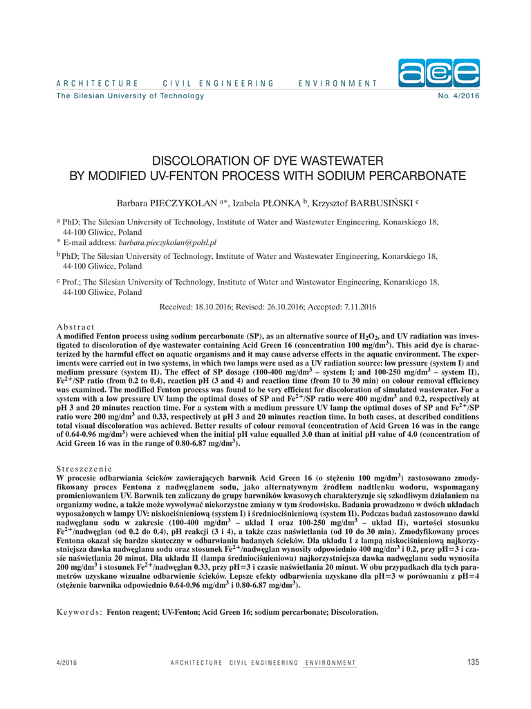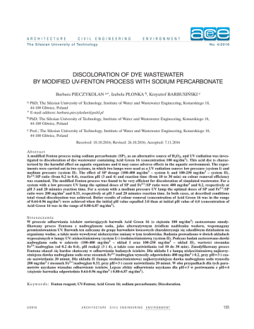 A R C H I T E C T U R E C I V I L E N G I N E E R I N G E N V I R O N M E N T T h e S i l e s i a n U n i v e r s i t y o f Te c h n o l o g y N o. 4 / 2 0 1 6 DISCOLORATION OF DYE WASTEWATER BY MODIFIED UV-FENTON PROCESS WITH SODIUM PERCARBONATE Barbara PIECZYKOLAN a*, Izabela PŁONKA b, Krzysztof BARBUSIŃSKI c a PhD; The Silesian University of Technology, Institute of Water and Wastewater Engineering, Konarskiego 18, 44-100 Gliwice, Poland * E-mail address: [email protected] b PhD; The Silesian University of Technology, Institute of Water and Wastewater Engineering, Konarskiego 18, 44-100 Gliwice, Poland c Prof.; The Silesian University of Technology, Institute of Water and Wastewater Engineering, Konarskiego 18, 44-100 Gliwice, Poland Received: 18.10.2016; Revised: 26.10.2016; Accepted: 7.11.2016 Abstract A modified Fenton process using sodium percarbonate (SP), as an alternative source of H2O2, and UV radiation was investigated to discoloration of dye wastewater containing Acid Green 16 (concentration 100 mg/dm3). This acid dye is characterized by the harmful effect on aquatic organisms and it may cause adverse effects in the aquatic environment. The experiments were carried out in two systems, in which two lamps were used as a UV radiation source: low pressure (system I) and medium pressure (system II). The effect of SP dosage (100-400 mg/dm3 – system I; and 100-250 mg/dm3 – system II), Fe2+/SP ratio (from 0.2 to 0.4), reaction pH (3 and 4) and reaction time (from 10 to 30 min) on colour removal efficiency was examined. The modified Fenton process was found to be very efficient for discoloration of simulated wastewater. For a system with a low pressure UV lamp the optimal doses of SP and Fe2+/SP ratio were 400 mg/dm3 and 0.2, respectively at pH 3 and 20 minutes reaction time. For a system with a medium pressure UV lamp the optimal doses of SP and Fe2+/SP ratio were 200 mg/dm3 and 0.33, respectively at pH 3 and 20 minutes reaction time. In both cases, at described conditions total visual discoloration was achieved. Better results of colour removal (concentration of Acid Green 16 was in the range of 0.64-0.96 mg/dm3) were achieved when the initial pH value equalled 3.0 than at initial pH value of 4.0 (concentration of Acid Green 16 was in the range of 0.80-6.87 mg/dm3). Streszczenie W procesie odbarwiania ścieków zawierających barwnik Acid Green 16 (o stężeniu 100 mg/dm3) zastosowano zmodyfikowany proces Fentona z nadwęglanem sodu, jako alternatywnym źródłem nadtlenku wodoru, wspomagany promieniowaniem UV. Barwnik ten zaliczany do grupy barwników kwasowych charakteryzuje się szkodliwym działaniem na organizmy wodne, a także może wywoływać niekorzystne zmiany w tym środowisku. Badania prowadzono w dwóch układach wyposażonych w lampy UV: niskociśnieniową (system I) i średniociśnieniową (system II). Podczas badań zastosowano dawki nadwęglanu sodu w zakresie (100-400 mg/dm3 – układ I oraz 100-250 mg/dm3 – układ II), wartości stosunku Fe2+/nadwęglan (od 0.2 do 0.4), pH reakcji (3 i 4), a także czas naświetlania (od 10 do 30 min). Zmodyfikowany proces Fentona okazał się bardzo skuteczny w odbarwianiu badanych ścieków. Dla układu I z lampą niskociśnieniową najkorzystniejsza dawka nadwęglanu sodu oraz stosunek Fe2+/nadwęglan wynosiły odpowiednio 400 mg/dm3 i 0.2, przy pH=3 i czasie naświetlania 20 minut. Dla układu II (lampa średniociśnieniowa) najkorzystniejsza dawka nadwęglanu sodu wynosiła 200 mg/dm3 i stosunek Fe2+/nadwęglan 0.33, przy pH=3 i czasie naświetlania 20 minut. W obu przypadkach dla tych parametrów uzyskano wizualne odbarwienie ścieków. Lepsze efekty odbarwienia uzyskano dla pH=3 w porównaniu z pH=4 (stężenie barwnika odpowiednio 0.64-0.96 mg/dm3 i 0.80-6.87 mg/dm3). K e y w o r d s : Fenton reagent; UV-Fenton; Acid Green 16; sodium percarbonate; Discoloration. 4/2016 ARCHITECTURE CIVIL ENGINEERING ENVIRONMENT 135