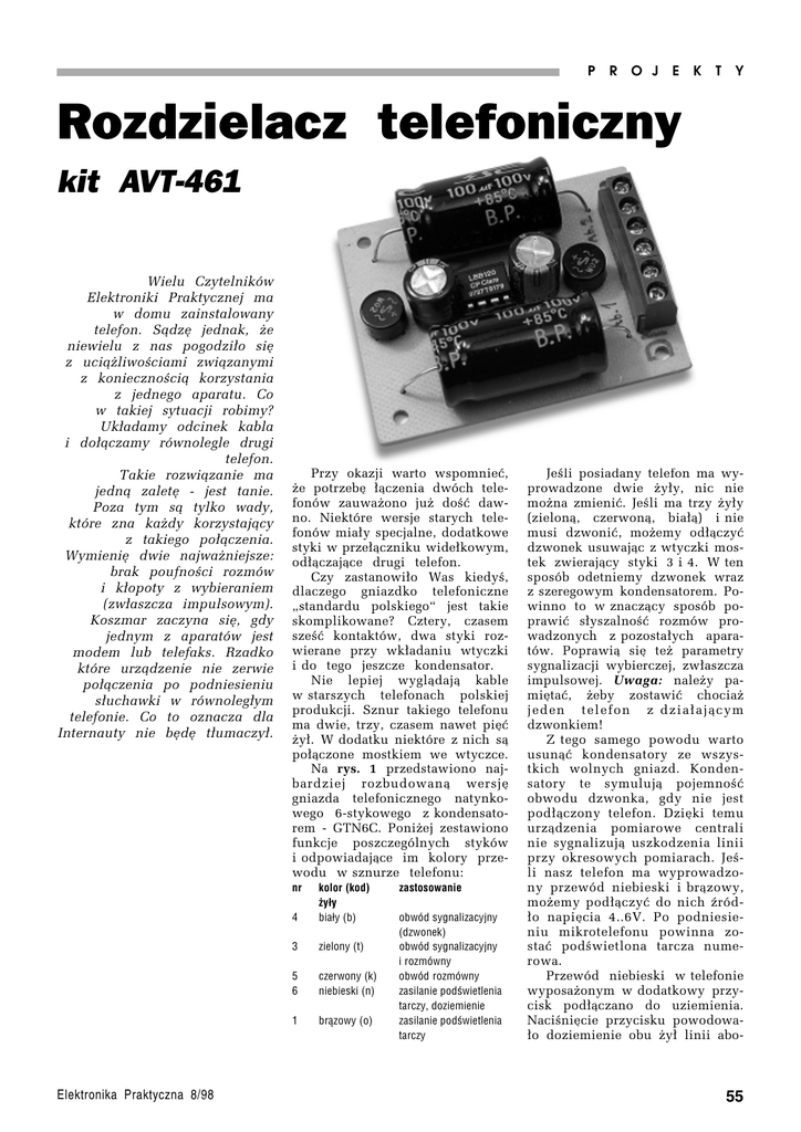 Rozdzielacz P R O Jtelefoniczny E K T Y Rozdzielacz telefoniczny kit AVT−461 Wielu CzytelnikÛw Elektroniki Praktycznej ma w†domu zainstalowany telefon. S¹dzÍ jednak, øe niewielu z†nas pogodzi³o siÍ z†uci¹øliwoúciami zwi¹zanymi z†koniecznoúci¹ korzystania z†jednego aparatu. Co w†takiej sytuacji robimy? Uk³adamy odcinek kabla i†do³¹czamy rÛwnolegle drugi telefon. Takie rozwi¹zanie ma jedn¹ zaletÍ - jest tanie. Poza tym s¹ tylko wady, ktÛre zna kaødy korzystaj¹cy z†takiego po³¹czenia. WymieniÍ dwie najwaøniejsze: brak poufnoúci rozmÛw i†k³opoty z†wybieraniem (zw³aszcza impulsowym). Koszmar zaczyna siÍ, gdy jednym z†aparatÛw jest modem lub telefaks. Rzadko ktÛre urz¹dzenie nie zerwie po³¹czenia po podniesieniu s³uchawki w†rÛwnoleg³ym telefonie. Co to oznacza dla Internauty nie bÍdÍ t³umaczy³. Przy okazji warto wspomnieÊ, øe potrzebÍ ³¹czenia dwÛch telefonÛw zauwaøono juø doúÊ dawno. NiektÛre wersje starych telefonÛw mia³y specjalne, dodatkowe styki w†prze³¹czniku wide³kowym, od³¹czaj¹ce drugi telefon. Czy zastanowi³o Was kiedyú, dlaczego gniazdko telefoniczne ìstandardu polskiegoî jest takie skomplikowane? Cztery, czasem szeúÊ kontaktÛw, dwa styki rozwierane przy wk³adaniu wtyczki i†do tego jeszcze kondensator. Nie lepiej wygl¹daj¹ kable w†starszych telefonach polskiej produkcji. Sznur takiego telefonu ma dwie, trzy, czasem nawet piÍÊ øy³. W†dodatku niektÛre z†nich s¹ po³¹czone mostkiem we wtyczce. Na rys. 1 przedstawiono najbardziej rozbudowan¹ wersjÍ gniazda telefonicznego natynkowego 6-stykowego z†kondensatorem - GTN6C. Poniøej zestawiono funkcje poszczegÛlnych stykÛw i†odpowiadaj¹ce im kolory przewodu w†sznurze telefonu: nr Elektronika Praktyczna 8/98 4 kolor (kod) żyły biały (b) 3 zielony (t) 5 6 czerwony (k) niebieski (n) 1 brązowy (o) zastosowanie obwód sygnalizacyjny (dzwonek) obwód sygnalizacyjny i rozmówny obwód rozmówny zasilanie podświetlenia tarczy, doziemienie zasilanie podświetlenia tarczy Jeúli posiadany telefon ma wyprowadzone dwie øy³y, nic nie moøna zmieniÊ. Jeúli ma trzy øy³y (zielon¹, czerwon¹, bia³¹) i†nie musi dzwoniÊ, moøemy od³¹czyÊ dzwonek usuwaj¹c z†wtyczki mostek zwieraj¹cy styki 3†i†4. W†ten sposÛb odetniemy dzwonek wraz z†szeregowym kondensatorem. Powinno to w†znacz¹cy sposÛb poprawiÊ s³yszalnoúÊ rozmÛw prowadzonych z†pozosta³ych aparatÛw. Poprawi¹ siÍ teø parametry sygnalizacji wybierczej, zw³aszcza impulsowej. Uwaga: naleøy pamiÍtaÊ, øeby zostawiÊ chociaø jeden telefon z†dzia³aj¹cym dzwonkiem! Z†tego samego powodu warto usun¹Ê kondensatory ze wszystkich wolnych gniazd. Kondensatory te symuluj¹ pojemnoúÊ obwodu dzwonka, gdy nie jest pod³¹czony telefon. DziÍki temu urz¹dzenia pomiarowe centrali nie sygnalizuj¹ uszkodzenia linii przy okresowych pomiarach. Jeúli nasz telefon ma wyprowadzony przewÛd niebieski i†br¹zowy, moøemy pod³¹czyÊ do nich ürÛd³o napiÍcia 4..6V. Po podniesieniu mikrotelefonu powinna zostaÊ podúwietlona tarcza numerowa. PrzewÛd niebieski w†telefonie wyposaøonym w†dodatkowy przycisk pod³¹czano do uziemienia. NaciúniÍcie przycisku powodowa³o doziemienie obu øy³ linii abo- 55 Rozdzielacz telefoniczny Rys. 1. Rozmieszczenie styków w gnieździe natynkowym. nenckiej. W†niektÛrych centralach moøna by³o w†ten sposÛb zawiesiÊ jedn¹ rozmowÍ i†odebraÊ drug¹. Uwaga: nowoczesne centrale elektroniczne bardzo nie lubi¹ takich doziemieÒ. Na rys. 2 przedstawiono wzorcow¹ sieÊ gniazdek roz³¹cznych. Lini¹ przerywan¹ zaznaczono na rysunku obwÛd podúwietlania tarczy numerowej i†uziemienia. W†tak poprowadzonej sieci dzia³a zawsze tylko jeden telefon, ten pod³¹czony najbliøej gniazda pocz¹tkowego. Od³¹czenie wszystkich telefonÛw powoduje zamkniÍcie linii kondensatorem w†gniazdku koÒcowym. Obecnie wielu producentÛw modemÛw i†telefaksÛw przewiduje moøliwoúÊ do³¹czenia do swoich urz¹dzeÒ dodatkowego telefonu. Stosowane s¹ dwa rozwi¹zania: ✓ Montowanie dwÛch gniazdek: jedno dla linii telefonicznej (WALL, LINE) i†drugie do pod³¹czenia dodatkowego telefonu (PHONE, AUX). ✓ Gniazdo typu Modular Jack o†czterech stykach. WewnÍtrzne styki (przewody czerwony i†zielony) s³uø¹ do pod³¹czenia linii centralowej, do zewnÍtrznych (przewody øÛ³ty i†czarny) przy³¹cza siÍ dodatkowy telefon. W†obu przypadkach dodatkowy aparat telefoniczny jest od³¹czany, gdy liniÍ zajmuje telefaks (modem). Obydwa rozwi¹zania zak³adaj¹ wyøszy priorytet pierwszego urz¹dzenia, dlatego rozmowa prowadzona z†dodatkowego telefonu moøe zostaÊ przypadkowo przerwana lub przejÍta. Wobec tego proponujemy wykonanie prostego rozdzielacza telefonicznego, ktÛry jest pozbawiony tych wad. Opis uk³adu Schemat rozdzielacza przedstawiono na rys. 3. Przeúledzimy drogÍ pr¹du w†ga³Ízi telefonu Ab1 - ga³¹ü telefonu Ab2 jest identyczna. Dla uproszczenia po- 56 miniemy nieistotne w†tym momencie kondensatory. Z†øy³y a linii miejskiej pr¹d p³ynie przez zwarte styki (5-6) przekaünika P1, diodÍ w†mostku prostowniczym, diodÍ LED (1-2) przekaünika P1, diodÍ mostka, telefon Ab1. Przekaüniki OptoMos P1 maj¹ styki normalnie zwarte (opis przekaünikÛw tego typu zamieszczono w†EP11 i†12/95, oraz 1, 2, 3, 4/ 96). Zastosowanie mostka prostowniczego uniezaleønia dzia³anie uk³adu od polaryzacji napiÍcia z†centrali telefonicznej. Jest to konieczne, poniewaø wiele central odwraca biegunowoúÊ na czas trwania po³¹czenia. W†stanie spoczynku telefon stanowi przerwÍ dla pr¹du sta³ego. Diody LED przekaünikÛw nie úwiec¹. Podniesienie mikrotelefonu w†aparacie Ab1 zamyka omÛwiony wyøej obwÛd. Dioda LED (1-2) przekaünika úwieci od³¹czaj¹c stykami (7-8) telefon Ab2 od øy³y a linii telefonicznej. Podniesienie s³uchawki telefonu Ab2 nic nie zmienia, gdyø jego ob