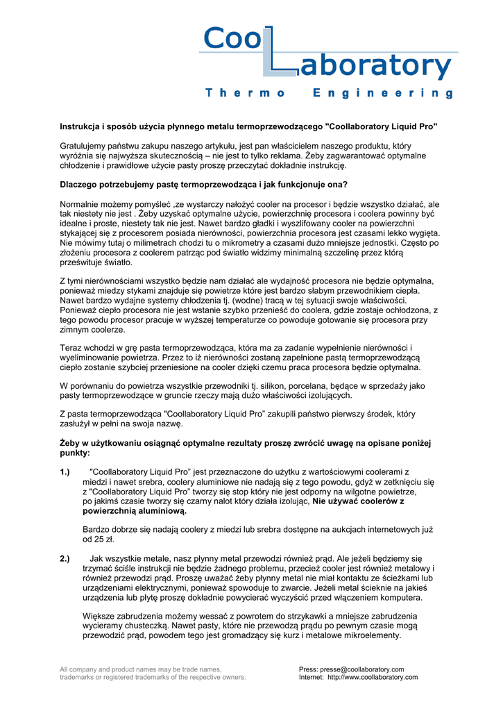 Instrukcja i sposób użycia płynnego metalu termoprzewodzącego "Coollaboratory Liquid Pro" Gratulujemy państwu zakupu naszego artykułu, jest pan właścicielem naszego produktu, który wyróżnia się najwyższa skutecznością – nie jest to tylko reklama. Żeby zagwarantować optymalne chłodzenie i prawidłowe użycie pasty proszę przeczytać dokładnie instrukcję. Dlaczego potrzebujemy pastę termoprzewodząca i jak funkcjonuje ona? Normalnie możemy pomyśleć ,ze wystarczy nałożyć cooler na procesor i będzie wszystko działać, ale tak niestety nie jest . Żeby uzyskać optymalne użycie, powierzchnię procesora i coolera powinny być idealne i proste, niestety tak nie jest. Nawet bardzo gładki i wyszlifowany cooler na powierzchni stykającej się z procesorem posiada nierówności, powierzchnia procesora jest czasami lekko wygięta. Nie mówimy tutaj o milimetrach chodzi tu o mikrometry a czasami dużo mniejsze jednostki. Często po złożeniu procesora z coolerem patrząc pod światło widzimy minimalną szczelinę przez którą prześwituje światło. Z tymi nierównościami wszystko będzie nam działać ale wydajność procesora nie będzie optymalna, ponieważ miedzy stykami znajduje się powietrze które jest bardzo słabym przewodnikiem ciepła. Nawet bardzo wydajne systemy chłodzenia tj. (wodne) tracą w tej sytuacji swoje właściwości. Ponieważ ciepło procesora nie jest wstanie szybko przenieść do coolera, gdzie zostaje ochłodzona, z tego powodu procesor pracuje w wyższej temperaturze co powoduje gotowanie się procesora przy zimnym coolerze. Teraz wchodzi w grę pasta termoprzewodząca, która ma za zadanie wypełnienie nierówności i wyeliminowanie powietrza. Przez to iż nierówności zostaną zapełnione pastą termoprzewodzącą ciepło zostanie szybciej przeniesione na cooler dzięki czemu praca procesora będzie optymalna. W porównaniu do powietrza wszystkie przewodniki tj. silikon, porcelana, będące w sprzedaży jako pasty termoprzewodzące w gruncie rzeczy mają dużo właściwości izolujących. Z pasta termoprzewodząca "Coollaboratory Liquid Pro” zakupili państwo pierwszy środek, który zasłużył w pełni na swoja nazwę. Żeby w użytkowaniu osiągnąć optymalne rezultaty proszę zwrócić uwagę na opisane poniżej punkty: 1.) "Coollaboratory Liquid Pro” jest przeznaczone do użytku z wartościowymi coolerami z miedzi i nawet srebra, coolery aluminiowe nie nadają się z tego powodu, gdyż w zetknięciu się z "Coollaboratory Liquid Pro” tworzy się stop który nie jest odporny na wilgotne powietrze, po jakimś czasie tworzy się czarny nalot który działa izolując, Nie używać coolerów z powierzchnią aluminiową. Bardzo dobrze się nadają coolery z miedzi lub srebra dostępne na aukcjach internetowych już od 25 zł. 2.) Jak wszystkie metale, nasz płynny metal przewodzi również prąd. Ale jeżeli będziemy się trzymać ściśle instrukcji nie będzie żadnego problemu, przecież cooler jest również metalowy i również przewodzi prąd. Proszę uważać żeby płynny metal nie miał kontaktu ze ścieżkami lub urządzeniami elektrycznymi, ponieważ spowoduje to zwarcie. Jeżeli metal ścieknie na jakieś urządzenia lub płytę proszę dokładnie powycierać wyczyścić przed włączeniem komputera. Większe zabrudzenia możemy wessać z powrotem do strzykawki a mniejsze zabrudzenia wycieramy chusteczką. Nawet pasty, które nie przewodzą prądu po pewnym czasie mogą przewodzić prąd, powodem tego jest gromadzący się kurz i metalowe mikroelementy. All company and product names may be trade names, trademarks or registered trademarks of the respective owners. Press: [email protected] Internet: http://www.coollaboratory.com Przygotowanie do montażu "Coollaboratory Liquid Pro” odprowadza ciepło dużo lepiej (Faktor 9 do 150) niż dotychczas używane pasty termoprzewodzące. Stara pasta z powierzchni coolera musi być dokładnie oczyszczona, zanim użyjemy płynnego metalu, to często nie jest proste, ponieważ pasta gromadzi się w szczelinach mikroskopijnych wentylatora często nie widocznych gołym okiem. Nałożenie płynnego metalu na starą pastę spowoduje działanie izolujące. Przez dotychczas używane pasty termoprzewodzące powierzchnie coolera mogą zostać uratowane przez zeszlifowanie (1/100mm). Nawet jak procesor i cooler są nowe powinniśmy dobrze wyczyścić powierzchnię, w tym celu najlepiej nadaje się szmatka nasączona acetonem lub czystym alkoholem. Nie powinniśmy używać do czyszczenia żadnych płynów na bazie olejów. Oczyszczone powierzchnie powinny być czyste od kurzu, tłuszczu i odcisków palców. WAŻNE: Przy niedokładnym wyczyszczeniu może dojść do problemów między płynnym metalem a procesorem i coolerem ( metal nie będzie się dobrze trzymał powierzchni). W przypadku kiedy cooler posiada już warstwę termoprzewodzącą, na której znajduje się wosk parafinowy, powinniśmy ją usunąć zanim nałożymy płynny metal. Do usunięcia wosku parafinowego nie używamy ciepłej wody , gdyż powoduje ona wtapianie wosku w mikroszczeliny, najlepiej jest wyszlifować . Najbardziej polecany byłby nowy cooler miedziany, z którego należy tylko rozpuszczalnikiem zetrzeć odciski palców . Nie dotykać ponownie wyczyszczonych powierzchni. Odcisk palca pozostawia warstwę 0,005 mm co uniemożliwia dokładne dojście płynnego metalu do powierzchni procesora i coolera, w skutek czego praca nie będzie 100%. Nakładanie płynnego metalu na cooler i procesor. Teraz państwo możecie nałożyć płynny metal na powierzchnię procesora, wystarczy tylko jedna kropelka, należy pamiętać żeby płynny metal wypełnił tylko mikroelement, nie może wystawać poza powierzchnie dolegające. Nałożoną kropelkę należy równomiernie rozprowadzić po powierzchni coolera za pomocą wacika lub pędzelka (nie używać palca). Jak dobrze rozprowadzimy płynny metal tworzy się cienka 