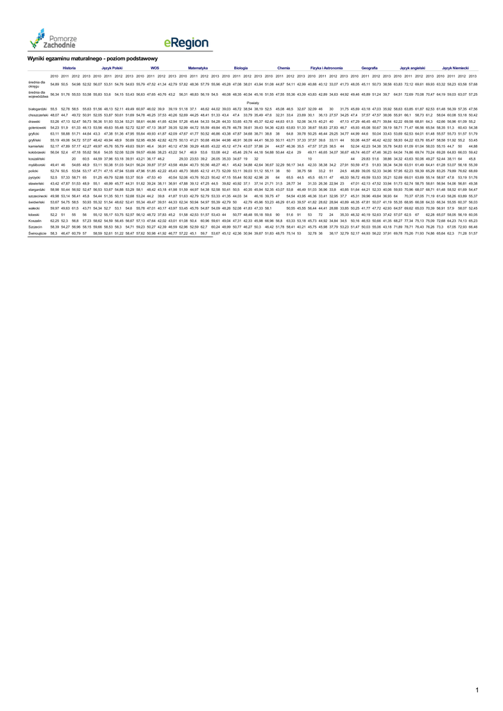 Wyniki egzaminu maturalnego - poziom podstawowy Historia Język Polski WOS Matematyka Biologia Chemia Fizyka i Astronomia Geografia Język angielski Język Niemiecki 2010 2011 2012 2013 2010 2011 2012 2013 2010 2011 2012 2013 2010 2011 2012 2013 2010 2011 2012 2013 2010 2011 2012 2013 2010 2011 2012 2013 2010 2011 2012 2013 2010 2011 2012 2013 2010 2011 2012 2013 średnia dla okręgu 54,89 50,5 54,98 52,52 56,07 53,51 54,76 54,63 55,79 47,52 41,34 42,79 57,82 48,36 57,79 55,96 45,28 47,08 38,01 43,94 51,08 44,87 54,11 42,99 40,88 40,12 33,07 41,73 48,05 45,11 50,73 38,58 63,83 72,12 69,61 69,93 63,32 58,23 63,58 57,68 średnia dla 56,34 51,76 55,53 53,58 55,83 53,6 województwa 54,15 53,43 56,63 47,65 40,76 43,2 56,31 46,83 56,19 54,5 46,08 48,35 40,54 45,16 51,55 47,55 55,36 43,39 43,83 42,89 34,63 44,92 49,46 45,89 51,24 39,7 64,51 72,69 70,08 70,47 64,19 59,03 63,07 57,25 Powiaty białogardzki 55,5 52,78 58,5 choszczeński 48,07 44,7 55,63 51,56 48,13 52,11 49,49 60,97 46,02 39,9 39,19 51,18 37,1 46,62 44,02 39,03 46,72 38,54 38,19 52,5 49,72 50,91 52,05 53,87 50,61 51,69 54,78 46,25 37,53 40,26 52,69 44,25 48,41 51,33 43,4 47,4 33,79 35,49 47,6 45,08 46,5 32,67 32,09 46 32,31 33,4 23,69 30,1 drawski 53,26 47,13 52,47 56,73 56,36 51,93 53,34 53,21 58,61 44,86 41,65 42,94 57,26 45,44 54,33 54,28 44,33 53,65 43,78 45,37 62,42 44,63 61,5 goleniowski 54,23 51,9 gryficki 63,11 58,88 51,71 44,64 43,3 gryfiński 55,19 49,06 54,72 57,07 48,42 49,94 48,9 kamieński 52,17 47,89 57,17 42,27 49,97 45,76 55,79 49,63 59,91 46,4 kołobrzeski 56,04 52,4 koszaliński 31,75 45,69 43,18 47,03 35,92 58,63 63,85 61,87 62,53 61,48 56,39 57,35 47,56 52,06 34,15 40,21 40 47,18 55,62 56,6 20 60,5 47,38 51,36 47,95 55,64 49,93 41,87 42,09 47,67 41,77 50,52 46,86 43,38 47,87 34,68 38,71 38,8 38 36,91 40,12 47,56 39,29 48,65 43,22 45,12 47,74 43,07 37,86 24 54,05 52,08 52,09 59,57 49,66 38,23 43,22 54,7 44,59 37,96 53,18 39,51 43,21 36,17 46,2 46,9 53,6 29,33 23,53 39,2 53,08 44,2 45,46 29,74 44,18 54,88 50,44 42,4 26,05 35,33 34,67 19 52,74 50,5 53,54 53,17 47,71 47,15 47,94 53,69 47,96 51,85 42,22 45,43 48,73 38,65 42,12 41,73 52,09 53,11 39,03 51,12 55,11 38 pyrzycki 52,5 sławieński 43,42 47,87 51,53 48,9 stargardzki 58,98 50,44 56,92 52,47 56,53 53,67 54,88 53,29 58,1 55,1 47,53 40 45,42 34,88 42,64 36,67 32,29 56,17 34,6 40,54 52,06 43,76 50,23 50,42 47,15 55,44 50,92 42,96 26 48,99 45,77 44,31 51,62 39,24 38,11 36,91 47,88 39,12 47,25 44,5 39,82 40,92 37,1 48,42 43,18 41,98 51,59 44,97 54,38 52,58 50,41 50,5 54,44 51,35 50,11 52,68 53,24 44,2 39,8 świdwiński 53,67 54,75 58,5 50,93 55,32 51,54 48,62 52,41 55,34 49,47 39,51 44,33 62,34 50,94 54,97 55,39 42,79 50 wałecki 59,97 49,63 61,5 43,71 54,34 52,7 łobeski 52,2 55 56 Koszalin 62,25 52,3 56,8 57,23 58,62 54,59 56,45 56,67 57,13 47,64 42,02 43,01 61,08 50,4 Szczecin 58,39 54,27 56,96 58,15 59,66 58,53 58,3 Świnoujście 58,3 46,47 60,79 57 53,1 54,6 64 37,14 21,71 31,5 46,16 39,75 47 51,58 42,53 51,57 53,43 44 50,77 48,48 55,18 59,6 59,7 60,43 54,38 50,04 33,43 53,69 62,53 64,01 61,48 55,57 55,73 51,57 51,79 50,08 44,57 46,42 42,02 58,93 64,22 63,76 65,47 58,58 51,92 55,2 53,45 52,04 42,23 54,38 35,78 54,83 61,09 61,04 58,03 55,15 44,7 44,88 50 49,11 46,65 34,07 36,67 48,74 46,07 47,46 36,23 64,04 74,86 69,74 70,24 69,28 64,83 66,03 59,42 44 42,33 38,38 34,2 38,75 58 33,2 65,5 44,5 65,11 47 28,77 34 62,66 56,96 61,09 55,2 45,5 51 24,5 38,86 34,32 43,63 50,06 49,27 52,44 38,11 64 45,8 51,83 38,34 54,39 63,51 61,49 64,41 61,28 53,07 56,18 55,39 46,89 39,05 52,33 34,96 57,95 62,23 59,39 65,29 83,25 79,89 76,62 68,69 48,33 56,72 49,59 53,53 35,21 52,69 69,01 63,69 55,14 58,97 47,8 31,33 26,36 22,94 23 46,49 51,03 36,96 33,8 29,83 51,6 27,91 50,59 47,5 53,19 51,76 47,01 42,13 47,52 33,94 51,73 62,74 58,75 58,61 56,94 54,06 56,81 49,38 40,85 51,64 44,21 52,33 40,06 59,93 70,96 68,07 68,71 61,48 58,52 61,69 54,47 54,54 43,95 46,36 33,41 32,95 37,7 45,31 39,96 49,84 36,93 64 70,37 67,05 71,19 61,43 58,26 63,89 55,37 50,55 45,55 56,44 44,41 28,88 33,85 50,25 41,77 47,72 42,93 64,57 69,62 65,03 70,39 56,91 57,9 90 60,96 59,61 49,04 47,31 42,33 45,98 66,96 56,8 54,71 59,23 50,27 42,39 46,59 62,96 52,59 62,7 58,59 52,61 51,22 58,47 57,62 50,98 41,92 46,77 57,22 45,1 44 58,04 60,08 53,18 50,42 42,79 45,96 53,23 46,29 61,43 39,57 41,82 28,62 28,94 40,89 46,35 47,81 50,07 41,19 55,35 68,95 66,08 64,33 66,34 55,55 60,37 56,03 55,78 47,01 40,17 43,97 53,45 45,76 54,87 54,09 48,26 52,08 41,83 47,33 58,1 55,12 55,17 53,75 52,57 56,12 48,72 37,83 45,2 47,57 37,25 38,5 50 40,35 45,94 52,35 43,07 53,8 41,87 51,63 42,79 52,79 53,33 41,35 44,03 34 33,11 44 10 policki 51,25 49,79 52,88 53,37 50,9 29 32 54,65 48,9 szczecinecki 49,98 53,14 56,41 45,8 53,11 50,38 51,03 54,01 56,24 39,87 37,57 43,58 49,84 40,73 50,56 48,27 46,1 44,57 46,36 35,5 58,73 61,2 45,93 45,08 50,67 39,19 58,71 71,47 66,56 65,54 58,35 51,3 39,78 50,25 46,44 29,25 34,77 44,99 44,6 50,69 52,95 49,56 42,82 42,75 50,13 41,21 50,68 49,94 44,98 46,91 36,09 44,41 56,33 50,11 43,71 37,33 37,57 39,6 49,41 46 57,33 58,71 65 64,8 37,57 47,57 38,06 55,91 66,1 47,13 47,29 46,45 48,71 39,84 62,22 69,58 68,81 64,3 61,33 46,13 53,56 49,63 55,48 52,72 52,97 47,13 38,97 39,35 52,99 44,72 55,59 49,84 45,78 46,78 39,61 39,43 54,36 42,83 63,83 51,33 38,67 55,83 27,83 46,7 myśliborski 51 30 36,13 27,57 34,25 47,4 60,24 48,99 50,77 46,27 50,3 51,6 91 53 72 24 35,33 46,32 40,19 52,63 37,42 57,07 62,5 63,33 53,18 45,73 44,92 34,84 34,5 67 46,42 51,78 58,41 40,21 45,75 45,98 37,79 53,23 51,47 50,03 55,06 43,18 71,89 78,71 76,43 76,26 73,3 53,67 45,12 42,36 30,94 39,87 51,83 48,75 75,14 53 32,78 36 58,07 52,45 62,28 65,07 58,05 56,19 60,05 50,16 46,53 50,66 41,35 68,27 77,34 75,13 75,09 72,68 64,23 74,13 65,23 67,05 72,93 66,46 38,17 32,79 52,17 44,93 56,22 37,91 69,78 75,26 71,93 74,86 65,64 62,3 71,28 51,57 1