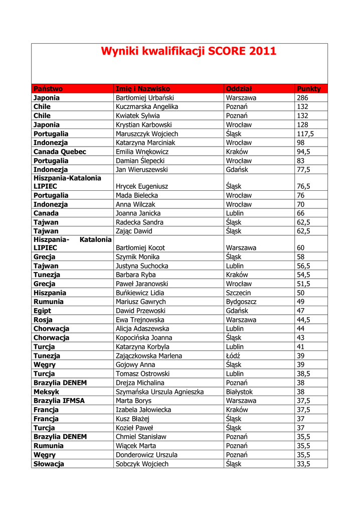 Wyniki kwalifikacji SCORE 2011 Państwo Japonia Chile Chile Japonia Portugalia Indonezja Canada Quebec Portugalia Indonezja Hiszpania-Katalonia LIPIEC Portugalia Indonezja Canada Tajwan Tajwan HiszpaniaKatalonia LIPIEC Grecja Tajwan Tunezja Grecja Hiszpania Rumunia Egipt Rosja Chorwacja Chorwacja Turcja Tunezja Węgry Turcja Brazylia DENEM Meksyk Brazylia IFMSA Francja Francja Turcja Brazylia DENEM Rumunia Węgry Słowacja Imię i Nazwisko Bartłomiej Urbański Kuczmarska Angelika Kwiatek Sylwia Krystian Karbowski Maruszczyk Wojciech Katarzyna Marciniak Emilia Wnękowicz Damian Ślepecki Jan Wieruszewski Oddział Warszawa Poznań Poznań Wrocław Śląsk Wrocław Kraków Wrocław Gdańsk Punkty 286 132 132 128 117,5 98 94,5 83 77,5 Hrycek Eugeniusz Mada Bielecka Anna Wilczak Joanna Janicka Radecka Sandra Zając Dawid Śląsk Wrocław Wrocław Lublin Śląsk Śląsk 76,5 76 70 66 62,5 62,5 Bartłomiej Kocot Szymik Monika Justyna Suchocka Barbara Ryba Paweł Jaranowski Buńkiewicz Lidia Mariusz Gawrych Dawid Przewoski Ewa Trejnowska Alicja Adaszewska Kopocińska Joanna Katarzyna Korbyla Zajączkowska Marlena Gojowy Anna Tomasz Ostrowski Drejza Michalina Szymańska Urszula Agnieszka Marta Borys Izabela Jałowiecka Kusz Błażej Kozieł Paweł Chmiel Stanisław Wiącek Marta Donderowicz Urszula Sobczyk Wojciech Warszawa Śląsk Lublin Kraków Wrocław Szczecin Bydgoszcz Gdańsk Warszawa Lublin Śląsk Lublin Łódź Śląsk Lublin Poznań Białystok Warszawa Kraków Śląsk Śląsk Poznań Poznań Poznań Śląsk 60 58 56,5 54,5 51,5 50 49 47 44,5 44 43 41 39 39 38,5 38 38 37,5 37,5 37 37 35,5 35,5 35,5 33,5 Słowacja Bułgaria Serbia Bułgaria Brazylia IFMSA Egipt Rumunia Meksyk Tunezja Turcja Rosja Rosja Egipt Egipt Serbia Serbia Egipt Turcja Tunezja Egipt Austria Azerbejdżan Azerbejdżan Oman Kapałka Agata Ogrodnik Krzysztof Maciej Pakuła Kujawa Anita Krzysztof Siemion Kamila Roeslaniec Żuk Anna Ewelina Dziaduch Kaczmarek Krystian Radzicka Karolina Monika Peplińska Frączak Małgorzata Tomasz Garbacz Ilona Reszka Katarzyna Górska Daria Świecka Michał Dudziński Jabłońska Paulina Kamil Adamczyk Karolina Sapota Michal Błaż 0 0 0 Śląsk Szczecin Gdańsk Poznań Warszawa Kraków Szczecin Lublin Poznań Poznań Gdańsk Łódź Lublin Lublin Kraków Gdańsk Warszawa Białystok Warszawa Białystok Kraków 0 0 0 33,5 33 33 32 31,5 31,5 31,5 30 29 29 27,5 26,5 25,5 22,5 21 20,5 17,5 15,5 15 14,5 8 0 0 0