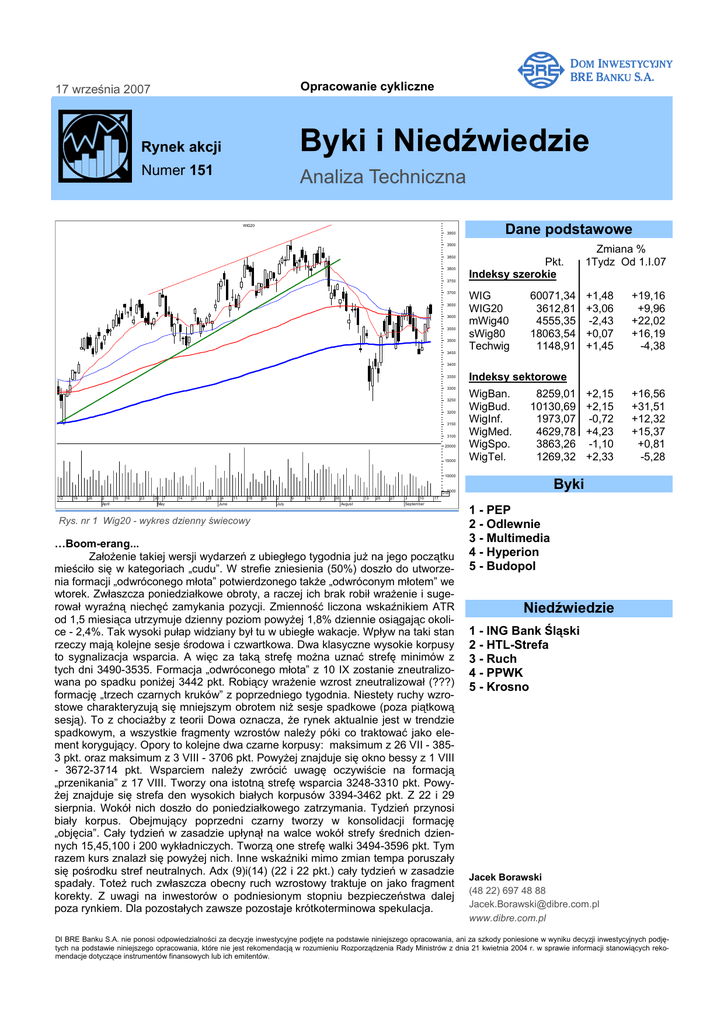 Byki i Niedźwiedzie BRE Bank BRE Bank Securities Opracowanie cykliczne 17 września 2007 Rynek akcji Byki i Niedźwiedzie Numer 151 Analiza Techniczna WIG20 3950 Dane podstawowe 3900 3850 3800 3750 3700 3650 3600 3550 3500 3450 Pkt. Indeksy szerokie WIG WIG20 mWig40 sWig80 Techwig 60071,34 3612,81 4555,35 18063,54 1148,91 Zmiana % 1Tydz Od 1.I.07 +1,48 +3,06 -2,43 +0,07 +1,45 +19,16 +9,96 +22,02 +16,19 -4,38 +2,15 +2,15 -0,72 +4,23 -1,10 +2,33 +16,56 +31,51 +12,32 +15,37 +0,81 -5,28 3400 3350 3300 3250 3200 3150 3100 20000 15000 Indeksy sektorowe WigBan. WigBud. WigInf. WigMed. WigSpo. WigTel. 8259,01 10130,69 1973,07 4629,78 3863,26 1269,32 10000 Byki 5000 x100 12 19 26 2 April 10 16 23 30 7 May 14 21 28 4 June 11 18 25 2 July 9 16 23 30 6 August 13 20 27 3 10 September 17 Rys. nr 1 Wig20 - wykres dzienny świecowy …Boom-erang... Założenie takiej wersji wydarzeń z ubiegłego tygodnia już na jego początku mieściło się w kategoriach „cudu”. W strefie zniesienia (50%) doszło do utworzenia formacji „odwróconego młota” potwierdzonego także „odwróconym młotem” we wtorek. Zwłaszcza poniedziałkowe obroty, a raczej ich brak robił wrażenie i sugerował wyraźną niechęć zamykania pozycji. Zmienność liczona wskaźnikiem ATR od 1,5 miesiąca utrzymuje dzienny poziom powyżej 1,8% dziennie osiągając okolice - 2,4%. Tak wysoki pułap widziany był tu w ubiegłe wakacje. Wpływ na taki stan rzeczy mają kolejne sesje środowa i czwartkowa. Dwa klasyczne wysokie korpusy to sygnalizacja wsparcia. A więc za taką strefę można uznać strefę minimów z tych dni 3490-3535. Formacja „odwróconego młota” z 10 IX zostanie zneutralizowana po spadku poniżej 3442 pkt. Robiący wrażenie wzrost zneutralizował (???) formację „trzech czarnych kruków” z poprzedniego tygodnia. Niestety ruchy wzrostowe charakteryzują się mniejszym obrotem niż sesje spadkowe (poza piątkową sesją). To z chociażby z teorii Dowa oznacza, że rynek aktualnie jest w trendzie spadkowym, a wszystkie fragmenty wzrostów należy póki co traktować jako element korygujący. Opory to kolejne dwa czarne korpusy: maksimum z 26 VII - 3853 pkt. oraz maksimum z 3 VIII - 3706 pkt. Powyżej znajduje się okno bessy z 1 VIII - 3672-3714 pkt. Wsparciem należy zwrócić uwagę oczywiście na formacją „przenikania” z 17 VIII. Tworzy ona istotną strefę wsparcia 3248-3310 pkt. Powyżej znajduje się strefa den wysokich białych korpusów 3394-3462 pkt. Z 22 i 29 sierpnia. Wokół nich doszło do poniedziałkowego zatrzymania. Tydzień przynosi biały korpus. Obejmujący poprzedni czarny tworzy w konsolidacji formację „objęcia”. Cały tydzień w zasadzie upłynął na walce wokół strefy średnich dziennych 15,45,100 i 200 wykładniczych. Tworzą one strefę walki 3494-3596 pkt. Tym razem kurs znalazł się powyżej nich. Inne wskaźniki mimo zmian tempa poruszały się pośrodku stref neutralnych. Adx (9)i(14) (22 i 22 pkt.) cały tydzień w zasadzie spadały. Toteż ruch zwłaszcza obecny ruch wzrostowy traktuje on jako fragment korekty. Z uwagi na inwestorów o podniesionym stopniu bezpieczeństwa dalej poza rynkiem. Dla pozostałych zawsze pozostaje krótkoterminowa spekulacja. 1 - PEP 2 - Odlewnie 3 - Multimedia 4 - Hyperion 5 - Budopol Niedźwiedzie 1 - ING Bank Śląski 2 - HTL-Strefa 3 - Ruch 4 - PPWK 5 - Krosno Jacek Borawski (48 22) 697 48 88 [email protected] www.dibre.com.pl DI BRE Banku S.A. nie ponosi odpowiedzialności za decyzje inwestycyjne podjęte na podstawie niniejszego opracowania, ani za szkody poniesione w wyniku decyzji inwestycyjnych podjętych na podstawie niniejszego opracowania, które nie jest rekomendacją w rozumieniu Rozporządzenia Rady Ministrów z dnia 21 kwietnia 2004 r. w sprawie informacji stanowiących rekomendacje dotyczące instrumentów finansowych lub ich emitentów. Byki i Niedźwiedzie BRE Bank Byki MACD (-0.16674) 1.5 1.0 0.5 0.0 -0.5 PEP (37.5700, 37.5700, 36.5000, 36.9900, -0.50000) 44 43 PEP Kurs - 36,99 zł. Oczekiwany zasięg - 42 41 40 39 38 37 Zwiększony wolumen podczas wzrostowych sesji daje szansę bykom. Spadek poniżej 34,80 zamyka byka. 36 35 34 33 32 31 30 29 28 27 40000 30000 20000 10000 x10 14 21 28 4 June 11 18 25 2 July 9 16 23 30 6 August 13 20 27 3 10 September 17 24 1 O Odlewnie (8.00000, 8.01000, 7.70000, 7.94000, -0.07000) 13.5 Odlewnie Kurs - 7,94 zł. 13.0 12.5 Oczekiwany zasięg - 12.0 11.5 11.0 10.5 Ważka odrzucająca wsparcie to z pewnością intrygujący popis byków. Spadek poniżej 7,70 zł. Zamknie byka. 10.0 9.5 9.0 8.5 8.0 7.5 7.0 70000 65000 60000 55000 50000 45000 40000 35000 30000 25000 20000 15000 10000 x105000 21 28 4 June 11 18 25 2 July 9 16 23 30 6 August 13 20 27 3 10 September 17 24 1 O Multimedia Polska (11.5800, 11.7500, 11.4700, 11.7300, +0.13000) 14.0 13.5 Multimedia Kurs - 11,73 zł. Oczekiwany zasięg - 13.0 12.5 12.0 11.5 11.0 10.5 10.0 9.5 9.0 50000 40000 30000 20000 10000 x100 21 28 4 June 11 18 25 2 July 9 16 23 30 6 August 13 20 27 3 10 September 17 24 1 O Konsolidacja w strefie 11,20 - 11,97 zł. Może wyglądać na spokój przed burzą. Po naruszeniu 11,20 zł. zamkniemy byka. Byki i Niedźwiedzie BRE Bank Hyperion (10.7900, 10.9400, 10.7000, 10.8900, +0.09000) 13.5 Hyperion Kurs - 10,89 zł. 13.0 12.5 Oczekiwany zasięg - 12.0 11.5 11.0 10.5 10.0 Konsolidacja trójkątna. Shark32 na wykresie tygodniowym wraz z „objęciem” to szansa dla byków. Po spadku poniżej 10,30 zł. zamkniemy byka. 9.5 9.0 8.5 8.0 65000 60000 55000 50000 45000 40000 35000 30000 25000 20000 15000 10000 5000 x10 8 27 8 2007 15 22 29 5 12 February 19 26 5 12 March 19 26 2 10 16 April 23 30 May 14 21 28 4 11 June 18 25 2 9 July 16 23 30 6 13 20 August 27 3 10 17 September 24 O Budopol (6.34000, 6.38000, 6.04000, 6.38000, +0.09000) 10.0 Budopol Kurs - 6,38 zł. 9.5 9.0 Oczekiwany zasięg - 8.5 8.0 7.5 7.0 6.5 Ruch spadkowy ma znamiona korekty. same białe korpusy z ubiegłego tygodnia dają szansę bykom na