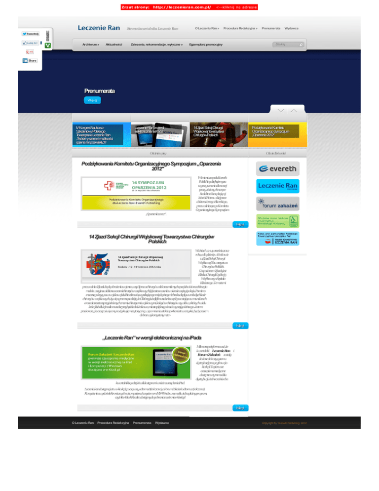 Zrzut strony: http://leczenieran.com.pl/ Strona kwartalnika Leczenie Ran <--kliknij na adresie O Leczeniu Ran » Procedura Redakcyjna » Prenumerata Wydawca Tweetnij Lubię to! Liczba osób, które to lubią: 4. Archiwum » Aktualności Zalecenia, rekomendacje, wytyczne » Szukaj.. Egzemplarz promocyjny Share 0 Prenumerata Więcej 11 22 IVKongresNaukowoSzkoleniowyPolskiego TowarzystwaLeczeniaRan „Twórzmyszanseimożliwości gojeniaranprzewlekłych” „LeczenieRan”wwersji elektronicznejnaiPada 33 44 14ZjazdSekcjiChirurgii WojskowejTowarzystwa ChirurgówPolskich PodziękowaniaKomitetu OrganizacyjnegoSympozjum „Oparzenia2012″ Ostatniewpisy Odwiedźrównież Podziękowania Komitetu Organizacyjnego Sympozjum „Oparzenia 2012″ WimieniuzespołuEvereth Publishingdziękujemyza wyrazyuznaniadlanaszej pracy,złożonychnaręce RedaktorZarządzającej MarioliPiotrowskiejprzez doktoraJerzegoSikorskiego, przewodniczącegoKomitetu OrganizacyjnegoSympozjum „Oparzenia2012″. Więcej 14 Zjazd Sekcji Chirurgii Wojskowej Towarzystwa Chirurgów Polskich Wdniach12-14września2012 roku,odbędziesięwKrakowie 14ZjazdSekcjiChirurgii WojskowejTowarzystwa ChirurgówPolskich. GospodarzemZjazdujest KlinikaChirurgiiOgólnej5 WojskowegoSzpitala Klinicznego.Tematami przewodnimiZjazdubędąobrażeniawojenne,współpracachirurgówzlekarzamiinnychspecjalnościorazchirurgia małoinwazyjnawidzianaoczamichirurgówwojskowychijejzastosowaniewokresiewojnyipokoju.Pomimo znacznegokryzysuwwojskowejsłużbiezdrowia,wynikającegomiędzyinnymizbrakudopływumłodychkadr chirurgówwojskowych,żywięogromnąnadzieję,żeCiktórzyjużzdjęlimunduritaczęśćpozostającawmundurach orazcałaresztazaprzyjaźnionychznami,chirurgamiwojskowymi,kolegówchirurgówcywilów,zktórychwielu krócejlubdłużejnosiłomundurprzybędziedoKrakowa,miastapięknegoinadzwyczajgościnnego.Jestem przekonany,żeczaspoświęconynadyskusjęmerytoryczną,wspomnieniaatakżespotkaniatowarzyskie,będączasem dobrzewykorzystanym.te> Więcej „Leczenie Ran” w wersji elektronicznej na iPada Miłonampoinformować,że kwartalniki LeczenieRan i ForumZakażeń zostały dodanedobazysystemu dystrybucjiprasycyfrowejekiosk.pl.Topierwsze czasopismamedyczne dostępnewtymmodelu dystrybucji.Jednocześnieoba kwartalnikisąodtejchwilidostępnerównieżnaurządzeniaiPad. LeczenieRandostępnejestwe-kiosk.pl,począwszyodtomu8(rok2010),aForumZakażeńodtomu1(rok2010). KorzystaniezwydańelektronicznychnakomputerachzsystememMS-Windowsumożliwiabezpłatnyprogram, czytnike-KioskReader,dostępnydopobranianastroniee-kiosk.pl Więcej O Leczeniu Ran Procedura Redakcyjna Prenumerata Wydawca Copyright by Evereth Publishing, 2012