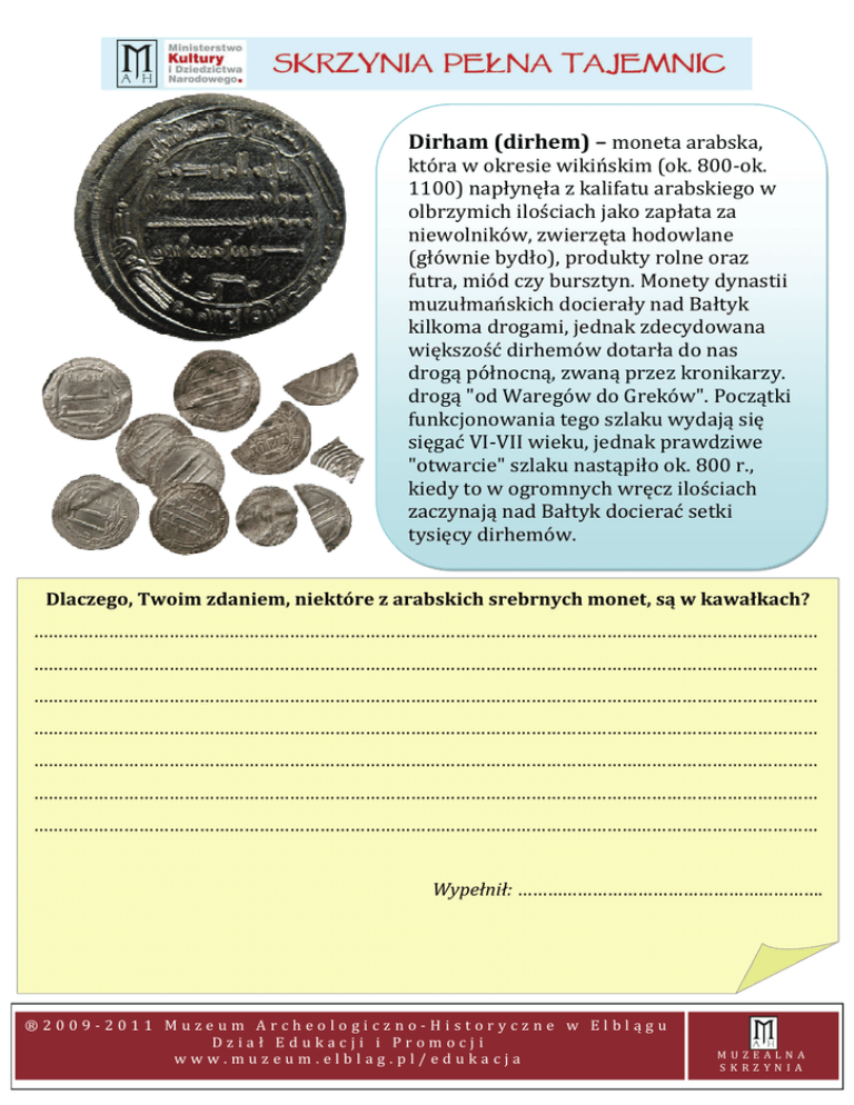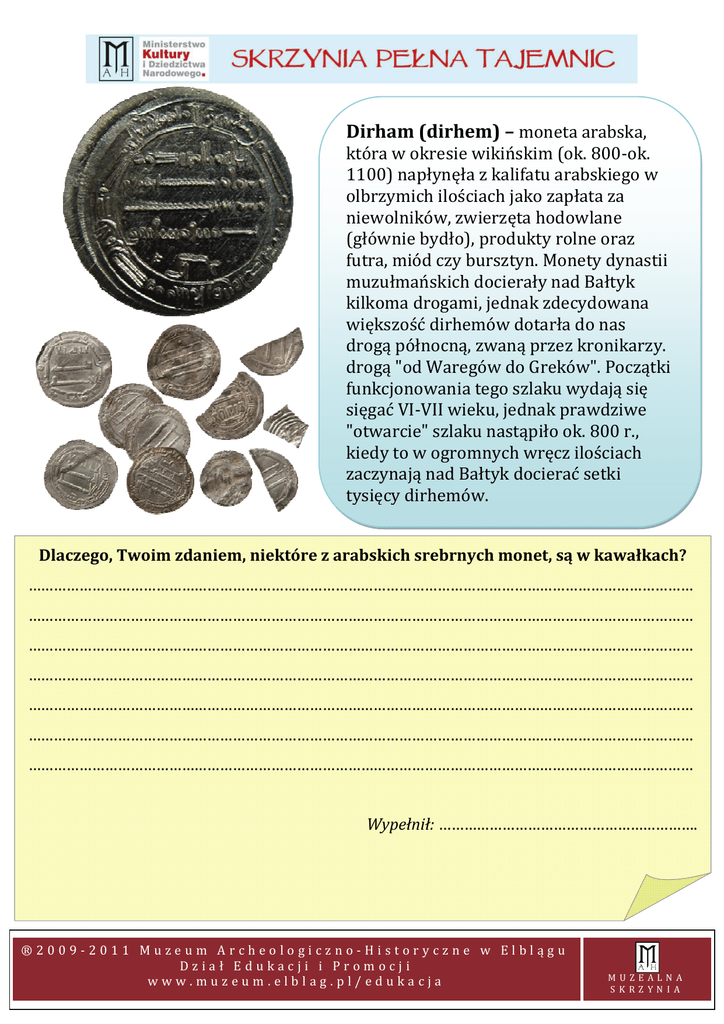 Dirham (dirhem) – moneta arabska, która w okresie wikińskim (ok. 800‐ok. 1100) napłynęła z kalifatu arabskiego w olbrzymich ilościach jako zapłata za niewolników, zwierzęta hodowlane (głównie bydło), produkty rolne oraz futra, miód czy bursztyn. Monety dynastii muzułmańskich docierały nad Bałtyk kilkoma drogami, jednak zdecydowana większość dirhemów dotarła do nas drogą północną, zwaną przez kronikarzy. drogą "od Waregów do Greków". Początki funkcjonowania tego szlaku wydają się sięgać VI‐VII wieku, jednak prawdziwe "otwarcie" szlaku nastąpiło ok. 800 r., kiedy to w ogromnych wręcz ilościach zaczynają nad Bałtyk docierać setki tysięcy dirhemów. Dlaczego, Twoim zdaniem, niektóre z arabskich srebrnych monet, są w kawałkach? ………………………………………………………………………………………………………………………………………… ………………………………………………………………………………………………………………………………………… ………………………………………………………………………………………………………………………………………… ………………………………………………………………………………………………………………………………………… ………………………………………………………………………………………………………………………………………… ………………………………………………………………………………………………………………………………………… ………………………………………………………………………………………………………………………………………… Wypełnił: ……………………………………………………. ®2009‐2011 Muzeum Archeologiczno‐Historyczne w Elblągu Dział Edukacji i Promocji www.muzeum.elblag.pl/edukacja MUZEALNA SKRZYNIA