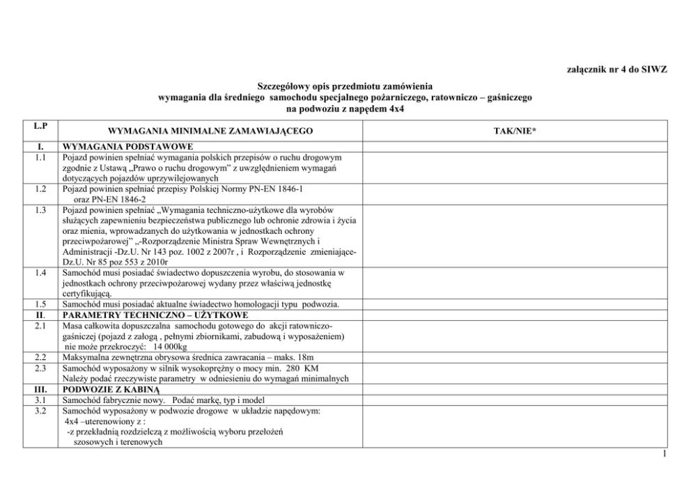 załącznik nr 4 do SIWZ Szczegółowy opis przedmiotu zamówienia wymagania dla średniego samochodu specjalnego pożarniczego, ratowniczo – gaśniczego na podwoziu z napędem 4x4 L.P I. 1.1 1.2 1.3 1.4 1.5 II. 2.1 2.2 2.3 III. 3.1 3.2 WYMAGANIA MINIMALNE ZAMAWIAJĄCEGO TAK/NIE* WYMAGANIA PODSTAWOWE Pojazd powinien spełniać wymagania polskich przepisów o ruchu drogowym zgodnie z Ustawą „Prawo o ruchu drogowym” z uwzględnieniem wymagań dotyczących pojazdów uprzywilejowanych Pojazd powinien spełniać przepisy Polskiej Normy PN-EN 1846-1 oraz PN-EN 1846-2 Pojazd powinien spełniać „Wymagania techniczno-użytkowe dla wyrobów służących zapewnieniu bezpieczeństwa publicznego lub ochronie zdrowia i życia oraz mienia, wprowadzanych do użytkowania w jednostkach ochrony przeciwpożarowej” „-Rozporządzenie Ministra Spraw Wewnętrznych i Administracji -Dz.U. Nr 143 poz. 1002 z 2007r , i Rozporządzenie zmieniająceDz.U. Nr 85 poz 553 z 2010r Samochód musi posiadać świadectwo dopuszczenia wyrobu, do stosowania w jednostkach ochrony przeciwpożarowej wydany przez właściwą jednostkę certyfikującą. Samochód musi posiadać aktualne świadectwo homologacji typu podwozia. PARAMETRY TECHNICZNO – UŻYTKOWE Masa całkowita dopuszczalna samochodu gotowego do akcji ratowniczogaśniczej (pojazd z załogą , pełnymi zbiornikami, zabudową i wyposażeniem) nie może przekroczyć: 14 000kg Maksymalna zewnętrzna obrysowa średnica zawracania – maks. 18m Samochód wyposażony w silnik wysokoprężny o mocy min. 280 KM Należy podać rzeczywiste parametry w odniesieniu do wymagań minimalnych PODWOZIE Z KABINĄ Samochód fabrycznie nowy. Podać markę, typ i model Samochód wyposażony w podwozie drogowe w układzie napędowym: 4x4 –uterenowiony z : -z przekładnią rozdzielczą z możliwością wyboru przełożeń szosowych i terenowych 1 L.P 3.3 3.4 3.5 3.6 WYMAGANIA MINIMALNE ZAMAWIAJĄCEGO TAK/NIE* -blokadą mechanizmu różnicowego tylnego mostu -z blokadą mechanizmu międzyosiowego -odłączany napęd osi przedniej -średnica osadzenia opon 22,5” - na osi przedniej koła pojedyncze , na osi tylnej koła podwójne. Samochód wyposażony w: -system -ABS- z możliwością odłączenia podczas jazdy w terenie Samochód wyposażony w silnik o zapłonie samoczynnym , posiadający aktualne normy ochrony środowiska (czystości spalin) spełniający normę emisji spalinmin. Euro 5, w technologii bez dodatkowych płynów w układzie spalinowym Zawieszenie osi przedniej: mechaniczne Zawieszenie osi tylnej: pneumatyczne Kabina fabrycznie jednomodułowa czterodrzwiowa, zapewniająca dostęp do silnika, w układzie miejsc 1+1+4 (siedzenia przodem do kierunku jazdy), Kabina wyposażona w : -klimatyzację - indywidualne oświetlenie do czytania mapy dla pozycji dowódcy - niezależny układ ogrzewania , umożliwiający ogrzewanie kabiny przy wyłączonym silniku -reflektor pogorzeliskowy na zewnątrz kabiny z gniazdem elektrycznym z prawej strony -poręcz do trzymania w tylnej części kabiny -zewnętrzną osłonę przeciwsłoneczną z przodu dachu kabiny -elektrycznie sterowane szyby po stronie kierowcy i dowódcy -elektrycznie sterowane lusterka po stronie kierowcy i dowódcy -lusterka zewnętrzne, elektrycznie podgrzewane(główne i szerokokątne) -lusterko rampowe-krawężnikowe z prawej strony -lusterko rampowe-dojazdowe, przednie -wywietrznik dachowy -lampy przeciwmgielne z przodu pojazdu Kabina wyposażona dodatkowo: w uchwyty na 2 aparaty oddechowe, umieszczone po jednym obok siedzenia kierowcy i dowódcy : -odblokowanie każdego aparatu indywidualnie -dźwignia odblokowująca o konstrukcji uniemożliwiającej przypadkowe 2 L.P 3.7 3.8 3.9 WYMAGANIA MINIMALNE ZAMAWIAJĄCEGO TAK/NIE* odblokowanie np. w czasie hamowania pojazdu -uchwyty na aparaty powietrzne nie powinny ograniczać przestrzeni załogi -schowek pod siedzeniami w tylnej części kabiny -tylne zawieszenie kabiny –pneumatyczne Fotele wyposażone w bezwładnościowe pasy bezpieczeństwa. Siedzenia pokryte materiałem łatwo zmywalnym, odpornym na ścieranie. Fotele wyposażone w zagłówki. Fotel dla kierowcy z regulacją wysokości, odległości i pochylenia oparcia W kabinie kierowcy zamontowane następujące urządzenia: - radiotelefon samochodowy o parametrach: częstotliwość VHF 136-174 MHz, moc 1÷25 W, odstęp międzykanałowy 12,5 kHz dostosowany do użytkowania w sieci MSWiA ,min 125 kanałów, wyświetlacz alfanumeryczny min 14 znaków. Obrotowy potencjometr siły głosu. -radio z odtwarzaczem CD -podest do ładowarek radiostacji przenośnych i latarek z wyłącznikiem, W kabinie kierowcy zabudowany panel informacyjny ,z system informacyjnosterującym ,komunikujący się z komputerem pojazdu oraz sterujący elektroniką zabudowy i wyposażenia za pomocą magistrali CAN. Dostępny dla kierowcy i dowódcy , wyposażony w monitor , min 10” z funkcjami: włączania, wyłączania, sterowania i stanu urządzeń , zawierający: -wyświetlanie na ekranie ,informacji graficzno-świetlnej: -aktualne ilości poziomu wody w zbiorniku i poziomu środka pianotwórczego w zbiorniku -informacja o załączonej autopompie -aktualne wartości ciśnień na linii niskiego i wysokiego ciśnienia -informacje o otwartych i zamkniętych poszczególnych żaluzjach oraz o otwarciu i zamknięciu poszczególnych podestów -informacja o podłączonym gnieździe ładowania -informacja o załączonym oświetleniu zewnętrznym i wewnętrznym -informacja o aktualnym stanie napięcia na akumulatorze -informacja o wysunięciu masztu -obraz przedstawiający pozycję masztu oświetleniowego względem pojazdu (kąt najaśnic masztu, oraz kąt obrotu) -raport z akcji” z wyszczególnieniem takich informacji jak: ostatnie załączenieautopompy-data/godzina ; czas pracy autopompy ; informacje o zużytych zasobach wody i środka pianotwórczego ; zużycia paliwa podczas pracy 3 L.P WYMAGANIA MINIMALNE ZAMAWIAJĄCEGO TAK/NIE* autopomp