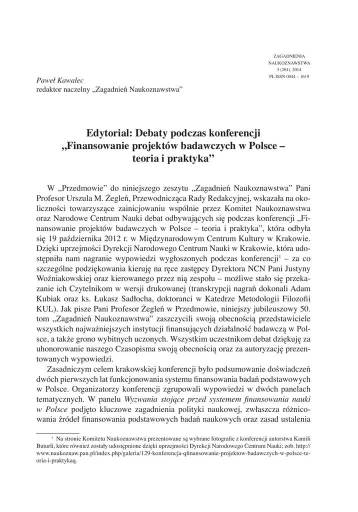 175 Paweł Kawalec redaktor naczelny „Zagadnień Naukoznawstwa” ZAGADNIENIA NAUKOZNAWSTWA 3 (201), 2014 PL ISSN 0044 – 1619 Edytorial: Debaty podczas konferencji „Finansowanie projektów badawczych w Polsce – teoria i praktyka” W „Przedmowie” do niniejszego zeszytu „Zagadnień Naukoznawstwa” Pani Profesor Urszula M. Żegleń, Przewodnicząca Rady Redakcyjnej, wskazała na okoliczności towarzyszące zainicjowaniu wspólnie przez Komitet Naukoznawstwa oraz Narodowe Centrum Nauki debat odbywających się podczas konferencji „Finansowanie projektów badawczych w Polsce – teoria i praktyka”, która odbyła się 19 października 2012 r. w Międzynarodowym Centrum Kultury w Krakowie. Dzięki uprzejmości Dyrekcji Narodowego Centrum Nauki w Krakowie, która udostępniła nam nagranie wypowiedzi wygłoszonych podczas konferencji1 – za co szczególne podziękowania kieruję na ręce zastępcy Dyrektora NCN Pani Justyny Woźniakowskiej oraz kierowanego przez nią zespołu – możliwe stało się przekazanie ich Czytelnikom w wersji drukowanej (transkrypcji nagrań dokonali Adam Kubiak oraz ks. Łukasz Sadłocha, doktoranci w Katedrze Metodologii Filozofii KUL). Jak pisze Pani Profesor Żegleń w Przedmowie, niniejszy jubileuszowy 50. tom „Zagadnień Naukoznawstwa” zaszczycili swoją obecnością przedstawiciele wszystkich najważniejszych instytucji finansujących działalność badawczą w Polsce, a także grono wybitnych uczonych. Wszystkim uczestnikom debat dziękuję za uhonorowanie naszego Czasopisma swoją obecnością oraz za autoryzację prezentowanych wypowiedzi. Zasadniczym celem krakowskiej konferencji było podsumowanie doświadczeń dwóch pierwszych lat funkcjonowania systemu finansowania badań podstawowych w Polsce. Organizatorzy konferencji zgrupowali wypowiedzi w dwóch panelach tematycznych. W panelu Wyzwania stojące przed systemem finansowania nauki w Polsce podjęto kluczowe zagadnienia polityki naukowej, zwłaszcza różnicowania źródeł finansowania podstawowych badań naukowych oraz zasad ustalenia 1 Na stronie Komitetu Naukoznawstwa prezentowane są wybrane fotografie z konferencji autorstwa Kamili Buturli, które również zostały udostępnione dzięki uprzejmości Dyrekcji Narodowego Centrum Nauki; zob. http:// www.naukoznaw.pan.pl/index.php/galeria/129-konferencja-qfinansowanie-projektow-badawczych-w-polsce-teoria-i-praktykaq. 176 paweł kawalec optymalnej równowagi między finansowaniem statutowym a grantowym w kontekście europejskiej polityki naukowej. W panelu „Peer review” – jak zapewnić trafność selekcji najlepszych projektów badawczych? przedmiotem dyskusji były zagadnienia związane z organizacją procesu wyboru wniosków, która pozwoliłaby wyłonić obiektywnie najlepsze z nich oraz stymulowała umiędzynarodowienie badań prowadzonych w Polsce. Wskazane w czasie dyskusji ograniczenia czysto ilościowych kryteriów oceny uzasadniają celowość podejść mieszanych w badaniach naukoznawczych, pozwalających na bardziej kompleksowe i zintegrowane analizy (Kawalec P., 2014, Metody mieszane w kontekście procesu badawczego w naukoznawstwie, „Zagadnienia Naukoznawstwa” 50: 3-22). Podsumowaniem dyskusji panelowych jest wypowiedź dr Doroty Kiebzak-Mandery, koordynatorki dyscyplin w dziale Nauk Humanistycznych, Społecznych i o Sztuce NCN „Podsumowanie debat z aktualnej perspektywy koordynatorki dyscyplin Narodowego Centrum Nauki”, która wyodrębnia podjęte podczas rozmów tematy z perspektywy doświadczeń dwóch lat funkcjonowania NCN. Oddając do ręki Czytelników niniejszy tom, mamy nadzieję, że dostarcza on cennego obrazu początkowych etapów funkcjonowania Narodowego Centrum Nauki jako najważniejszej instytucji w Polsce finansującej badania podstawowe, ale również pokazuje pozytywne efekty zainicjowanej przez Ministerstwo Nauki i Szkolnictwa Wyższego reformy nauki i szkolnictwa wyższego w Polsce.