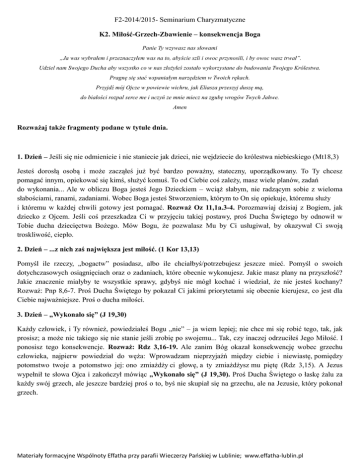 F2-2014/2015- Seminarium Charyzmatyczne K2. Miłość-Grzech-Zbawienie – konsekwencja Boga Panie Ty wzywasz nas słowami „Ja was wybrałem i przeznaczyłem was na to, abyście szli i owoc przynosili, i by owoc wasz trwał”. Udziel nam Swojego Ducha aby wszystko co w nas złożyłeś zostało wykorzystane do budowania Twojego Królestwa. Pragnę się stać wspaniałym narzędziem w Twoich rękach. Przyjdź mój Ojcze w powiewie wichru, jak Eliasza przeszyj duszę mą, do białości rozpal serce me i uczyń ze mnie miecz na zgubę wrogów Twych Jahwe. Amen Rozważaj także fragmenty podane w tytule dnia. 1. Dzień – Jeśli się nie odmienicie i nie staniecie jak dzieci, nie wejdziecie do królestwa niebieskiego (Mt18,3) Jesteś dorosłą osobą i może zacząłeś już być bardzo poważny, stateczny, uporządkowany. To Ty chcesz pomagać innym, opiekować się kimś, służyć komuś. To od Ciebie coś zależy, masz wiele planów, zadań do wykonania... Ale w obliczu Boga jesteś Jego Dzieckiem – wciąż słabym, nie radzącym sobie z wieloma słabościami, ranami, zadaniami. Wobec Boga jesteś Stworzeniem, którym to On się opiekuje, któremu służy i któremu w każdej chwili gotowy jest pomagać. Rozważ Oz 11,1a.3-4. Porozmawiaj dzisiaj z Bogiem, jak dziecko z Ojcem. Jeśli coś przeszkadza Ci w przyjęciu takiej postawy, proś Ducha Świętego by odnowił w Tobie ducha dziecięctwa Bożego. Mów Bogu, że pozwalasz Mu by Ci usługiwał, by okazywał Ci swoją troskliwość, ciepło. 2. Dzień – ...z nich zaś największa jest miłość. (1 Kor 13,13) Pomyśl ile rzeczy, „bogactw” posiadasz, albo ile chciałbyś/potrzebujesz jeszcze mieć. Pomyśl o swoich dotychczasowych osiągnięciach oraz o zadaniach, które obecnie wykonujesz. Jakie masz plany na przyszłość? Jakie znaczenie miałyby te wszystkie sprawy, gdybyś nie mógł kochać i wiedział, że nie jesteś kochany? Rozważ: Pnp 8,6-7. Proś Ducha Świętego by pokazał Ci jakimi priorytetami się obecnie kierujesz, co jest dla Ciebie najważniejsze. Proś o ducha miłości. 3. Dzień – „Wykonało się” (J 19,30) Każdy człowiek, i Ty również, powiedziałeś Bogu „nie” – ja wiem lepiej; nie chce mi się robić tego, tak, jak prosisz; a może nic takiego się nie stanie jeśli zrobię po swojemu... Tak, czy inaczej odrzuciłeś Jego Miłość. I ponosisz tego konsekwencje. Rozważ: Rdz 3,16-19. Ale zanim Bóg okazał konsekwencję wobec grzechu człowieka, najpierw powiedział do węża: Wprowadzam nieprzyjaźń między ciebie i niewiastę, pomiędzy potomstwo twoje a potomstwo jej: ono zmiażdży ci głowę, a ty zmiażdżysz mu piętę (Rdz 3,15). A Jezus wypełnił te słowa Ojca i zakończył mówiąc „Wykonało się” (J 19,30). Proś Ducha Świętego o łaskę żalu za każdy swój grzech, ale jeszcze bardziej proś o to, byś nie skupiał się na grzechu, ale na Jezusie, który pokonał grzech. Materiały formacyjne Wspólnoty Effatha przy parafii Wieczerzy Pańskiej w Lublinie; www.effatha-lublin.pl 4. Dzień – Błogosławieni czystego serca, albowiem oni Boga oglądać będą. (Mt 5,8) Zapewne wiesz, że Bóg Cię kocha, ale mimo to grzeszysz. Nie jesteś jedyny. Nie brak Ci głupoty, uporu, słabości, złości... (możesz dodać swoje spostrzeżenia). Ten grzech przynosi konkretne konsekwencje (czy potrafisz je zauważyć/nazwać?) Ale w głębi serca jesteś dobry, chcesz być dobry, chcesz być blisko Boga, więc modlisz się, wykonujesz dobre uczynki, podejmujesz dobre postanowienia, obiecujesz, że już nigdy więcej czegoś nie zrobisz... A co na to Pan Bóg? Na czym Jemu najbardziej zależy? Rozważ: Iz 1,1-20. Proś Ducha Świętego o czyste serce, o miłość ku Bogu. 5. Dzień – Zbawienie przyszło przez Krzyż, ogromna to tajemnica... Odpraw dzisiaj drogę krzyżową i zapytaj Jezusa dlaczego się na to wszystko zgodził? 6. Dzień - Albowiem Bóg nie posłał swego Syna na świat po to, aby świat potępił, ale po to, by świat został przez Niego zbawiony. (J 3,17) Bóg Ciebie kocha – wierzysz w to? Jeżeli grzeszysz Bóg nadal Cię kocha, wierzysz w to? Ale grzesząc, nie idziesz tą drogą, którą wyznaczył Ci Bóg, byś do Niego doszedł. Czy masz świadomość, że każdy grzech (mały, duży, powszedni, śmiertelny, inny niż zwykle, czy powtarzający się od wielu lat) oddala Cię od Boga i Jego Królestwa? Ale Bóg Cię kocha, dlatego pragnie Twojego powrotu. Ofiarował Ci życie swojego Syna byś do Niego powrócił. Co zrobisz z tym Darem? Powiesz, że jesteś niegodny? Będziesz chciał zasłużyć, odpracować jakoś? Rozważ: Ez 34,11-16. Proś Ducha Świętego o łaskę zaufania Ojcowskiej Miłości i przemianę swojego serca ze względu na tę Miłość, a nie strach, czy ślepe posłuszeństwo. Materiały formacyjne Wspólnoty Effatha przy parafii Wieczerzy Pańskiej w Lublinie; www.effatha-lublin.pl