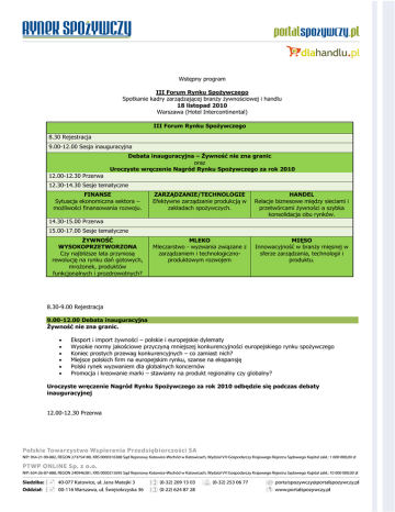 Wstępny program III Forum Rynku Spożywczego Spotkanie kadry zarządzającej branży żywnościowej i handlu 18 listopad 2010 Warszawa (Hotel Intercontinental) III Forum Rynku Spożywczego 8.30 Rejestracja 9.00-12.00 Sesja inauguracyjna Debata inauguracyjna – Żywność nie zna granic oraz Uroczyste wręczenie Nagród Rynku Spożywczego za rok 2010 12.00-12.30 Przerwa 12.30-14.30 Sesje tematyczne FINANSE Sytuacja ekonomiczna sektora – możliwości finansowania rozwoju. ZARZĄDZANIE/TECHNOLOGIE Efektywne zarządzanie produkcją w zakładach spożywczych. HANDEL Relacje biznesowe między sieciami i przetwórcami żywności a szybka konsolidacja obu rynków. MLEKO Mleczarstwo - wyzwania związane z zarządzaniem i technologicznoproduktowym rozwojem MIĘSO Innowacyjność w branży mięsnej w sferze zarządzania, technologii i produktu. 14.30-15.00 Przerwa 15.00-17.00 Sesje tematyczne ŻYWNOŚĆ WYSOKOPRZETWORZONA Czy najbliższe lata przyniosą rewolucję na rynku dań gotowych, mrożonek, produktów funkcjonalnych i prozdrowotnych? 8.30-9.00 Rejestracja 9.00-12.00 Debata inauguracyjna Żywność nie zna granic. Eksport i import żywności – polskie i europejskie dylematy Wysokie normy jakościowe przyczyną mniejszej konkurencyjności europejskiego rynku spożywczego Koniec prostych przewag konkurencyjnych – co zamiast nich? Miejsce polskich firm na europejskim rynku, szanse na ekspansję Polski rynek wyzwaniem dla globalnych koncernów Promocja i kreowanie marki – stawiamy na produkt regionalny czy globalny? Uroczyste wręczenie Nagród Rynku Spożywczego za rok 2010 odbędzie się podczas debaty inauguracyjnej 12.00-12.30 Przerwa 12.30-14.30 i 15.00-17.00 Sesje tematyczne 12.30-14.30 FINANSE Sytuacja ekonomiczna sektora – możliwości finansowania rozwoju. Kondycja branży spożywczej a poziom wykorzystania środków unijnych Innowacje, efektywność, jakość a możliwości finansowania nowych projektów Bezpieczeństwo transakcji finansowych Finansowanie rozwoju firm spożywczych na rynkach zagranicznych 12.30-14.30 ZARZĄDZANIE/TECHNOLOGIE Efektywne zarządzanie produkcją w zakładach spożywczych. Inwestycje w oszczędności – obszary niezbędnych działań na rzecz rozwoju firmy Efektywne planowanie i optymalizacja procesów technologicznych Budowanie przewagi konkurencyjnej poprzez wdrażanie i wykorzystanie systemów informatycznych Automatyzacja procesów produkcji i pakowania Efektywność energetyczna – efektywne wykorzystanie mediów energetycznych (audyt, planowanie zużycia) Logistyka magazynowa - zarządzanie zasobami i przepływem towarów 12.30-14.30 HANDEL Relacje biznesowe między sieciami i przetwórcami żywności a szybka konsolidacja obu rynków. Zagraniczne sieci motorem modernizacji polskiego handlu i przemysłu spożywczego Konsolidacja przetwórców jako element wyrównania szans w relacjach z detalistami Marki własne sieci handlowych – przyszłość czy zagrożenie dla przemysłu żywnościowego Czy nowa ustawa mająca regulować relacje między sieciami a przetwórcami żywności spełni pokładane oczekiwania. Komentarz dystrybutorów i przetwórców do założeń projektu ustawy przygotowanego przez Radę Gospodarki Żywnościowej 14.30-15.00 Przerwa 15.00-17.00 ŻYWNOŚĆ WYSOKOPRZETWORZONA Czy najbliższe lata przyniosą rewolucję na rynku dań gotowych, mrożonek, produktów funkcjonalnych i prozdrowotnych? Wzrost udziału wysokoprzetworzonej żywności w rynku – światowy trend w polskich realiach Dania gotowe, żywność mrożona, przetwory warzywno-owocowe – kierunki rozwoju rynku, nowe nawyki konsumenckie Innowacje w zakresie receptur, produkty i dania z innych stref kulturowych Nowe strategie rynkowe, szukanie przewag konkurencyjnych, poszerzanie ofert producentów i przetwórców, nisze rynkowe Perspektywy rozwoju żywności funkcjonalnej i prozdrowotnej w Polsce Żywność wysoko przetworzona wyzwaniem dla producentów opakowań i dodatków 15.00-17.00 MLEKO Mleczarstwo - wyzwania związane z zarządzaniem i technologiczno-produktowym rozwojem. Globalni gracze a polskie firmy – specyfika działalności zaagranicznych koncernów Co sprawi, że jedni wygrają, a inni wypadną z rynku w konkurencyjnym wyścigu (wielkość firm, jakość, unikalność produktów, inne)? Strategie rozwoju - na jaki rodzaj produktów stawiać (galanteria mleczna, produkty tanie, „dla mas”, produkty ekologiczne i funkcjonalne) Czy jest szansa wylansowania polskich marek za granicą? Innowacyjne rozwiązania w obszarze marketingu i pakowania produktów mlecznych Dystrybucja - własna czy outsourcing, sieci a handel tradycyjny 15.00-17.00 MIĘSO Innowacyjność w branży mięsnej w sferze zarządzania, technologii i produktu. Unowocześnianie przemysłu mięsnego - warunki konieczne, wymagania konkurencyjności Inicjatywy mające zwiększyć innowacyjność branży - mięsne klastry Nowe podejście do promocji mięsa Narastająca konkurencja zagraniczna – jak jej sprostać? Nowe strategie rynkowe, szukanie przewag konkurencyjnych (nisze rynkowe, wędliny funkcjonalne, inne) Poprawa walorów wyrobów mięsnych i wędliniarskich, wpływ na strategie produktowe firm - dodatki do żywności