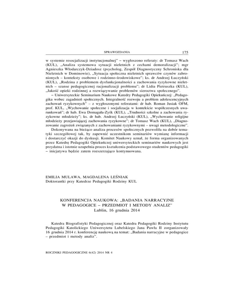 SPRAWOZDANIA 175 w systemie resocjalizacji instytucjonalnej” − wygłoszono referaty: dr Tomasz Wach (KUL), „Analiza systemowa sytuacji nieletnich z cechami demoralizacji”; mgr Agnieszka Włodarczyk-Dziadosz (psycholog, Zespół Diagnostyczny Schroniska dla Nieletnich w Dominowie), „Sytuacja społeczna nieletnich sprawców czynów zabronionych – konteksty osobowe i rodzinno-środowiskowe”; ks. dr Andrzej Łuczyński (KUL), „Rodzina z problemem dysfunkcjonalności a zachowania ryzykowne nieletnich – szanse pedagogicznej racjonalizacji problemu”; dr Lidia Pietruszka (KUL), „Jakość opieki rodzinnej a rozwiazywanie ˛ problemów sieroctwa społecznego”. − Uniwersyteckie Seminarium Naukowe Katedry Pedagogiki Opiekuńczej: „Pedagogika wobec zagadnień społecznych. Integralność rozwoju a problem adolescencyjnych zachowań ryzykownych” – z wygłoszonymi referatami: dr hab. Roman Jusiak OFM, prof. KUL, „Wychowanie społeczne i socjalizacja w kontekście współczesnych uwarunkowań”; dr hab. Ewa Domagała-Zyśk (KUL), „Trudności szkolne a zachowania ryzykowne młodzieży”; ks. dr hab. Andrzej Łuczyński (KUL), „Wychowanie religijne młodzieży przejawiajacej ˛ zachowania ryzykowne”; dr Tomasz Wach (KUL), „Diagnozowanie zagrożeń zwiazanych ˛ z zachowaniami ryzykownymi – uwagi metodologiczne”. Dokonywana na bieżaco ˛ analiza procesów społecznych pozwoliła na dobór tematyki szczegółowej tak, by zapewnić uczestnikom seminariów wymiane˛ informacji i dostarczyć okazji do dyskusji. Komitet Naukowy uznał, że forma organizowanych przez Katedre˛ Pedagogiki Opiekuńczej uniwersyteckich seminariów naukowych jest przydatna i istotnie uzupełnia proces kształcenia podstawowego studentów pedagogiki − inicjatywa be˛ dzie zatem rozszerzajaco ˛ kontynuowana. EMILIA MULAWA, MAGDALENA LEŚNIAK Doktorantki przy Katedrze Pedagogiki Rodziny KUL KONFERENCJA NAUKOWA: „BADANIA NARRACYJNE W PEDAGOGICE − PRZEDMIOT I METODY ANALIZ” Lublin, 16 grudnia 2014 Katedra Biografistyki Pedagogicznej oraz Katedra Pedagogiki Rodziny Instytutu Pedagogiki Katolickiego Uniwersytetu Lubelskiego Jana Pawła II zorganizowały 16 grudnia 2014 r. konferencje˛ naukowa˛ na temat: „Badania narracyjne w pedagogice – przedmiot i metody analiz”. ROCZNIKI PEDAGOGICZNE 6(42) 2014 NR 4 176 SPRAWOZDANIA Zagadnienia poruszone podczas konferencji skupiały sie˛ na kluczowych przesłankach dotyczacych ˛ badań narracyjnych prowadzonych w obszarze pedagogiki, z uwzgle˛ dnieniem ich podstawowych i ważnych postulatów: historyczność, kontekstowość i indywidualizm. Głównym celem było podje˛ cie refleksji i dyskusji nad wykorzystaniem badań narracyjnych w różnych subdyscyplinach pedagogiki. Organizatorzy konferencji wyodre˛ bnili naste˛ pujace ˛ obszary problemowe: 1. Badania narracyjne w subdyscyplinach pedagogiki, 2. Badania narracyjne w praktyce pedagogicznej, 3. Metoda badań biograficznych i narracje autobiograficzne w pedagogice, 4. Metoda biograficzna w analizie zdarzeń teraźniejszych i przeszłych, 5. Wywiad narracyjny jako sposób gromadzenia i analizy danych w badaniach empirycznych1. Konferencje˛ otworzył ks. prof. dr hab. Marian Nowak. We wprowadzeniu podkreślił użyteczność podejmowanej na konferencji dyskusji nad merytoryczna˛ i metodologiczna˛ wartościa˛ jakościowej metodologii w pedagogice. Zwrócił uwage˛ na potrzebe˛ rozróżnienia i prowadzenia refleksji nad badaniami narracyjnymi w odniesieniu do narracji naukowych, narracji praktycznych i narracji ideologicznych. Krótkie słowo wste˛ pne wygłosili także kierownicy katedr organizujacych ˛ konferencje˛ : dr hab. Danuta Opozda i dr hab. Ryszard Skrzyniarz, prof. KUL. Obrady zostały podzielone na dwie sesje. W pierwszej poruszono metodologiczne i subdyscyplinarne konteksty badań narracyjnych. Natomiast druga cze˛ ść dotyczyła praktycznego zastosowania narracji w badaniach pedagogicznych. Wystapienia ˛ rozpocze˛ ły mgr Natalia Savchyn i mgr Monika Tylka, przedstawiajac ˛ wste˛ pnie narracyjne możliwości współczesnej pedagogiki. Podały także przykłady przeprowadzonych badań jakościowych. Kolejnym prelegentem był ks. prof. dr hab. Edward Walewander, który podkreślił znaczenie biografistyki w badaniach nad regionalizmem. Zaznaczył on, że monografie małych jednostek administracyjnych pozwalaja˛ zachować pamie˛ ć zarówno o ludziach (cze˛ sto bohaterach, osobach o wielkich talentach), jak i zdarzeniach historycznych, które bez takich badań przeszłyby niezauważone lub odeszłyby w niepamie˛ ć. Uwrażliwił słuchaczy na to, że biografistyka jest dziś szczególnie cenna, z uwagi na widoczne ataki na ludzi zasłużonych zarówno dla Polski, jak i Kościoła. Siostra dr hab. Maria Opiela przedstawiła analize˛ hermeneutyczna˛ w rekonstrukcji pedagogiki przedszkolnej w systemie Edmunda Bojanowskiego. Niekwestionowana˛ zaleta˛ wystapienia ˛ była przygotowana przez prelegentke˛ prezentacja multimedialna, która w bardzo obrazowy sposób pokazała, na czym polega nie tylko omawiany przez nia˛ system, ale także jak w prowadzonych analizach nad systemem wychowania można i należy wykorzystać koło hermeneutyczne. Naste˛ pnie głos zabrała dr hab. Ewa Domagała-Zyśk, która swoje wystapienie ˛ poświe˛ ciła zagadnieniu badań w pedagogice specjalnej. Zdaniem autorki wystapienia, ˛ prowadzenie badań narracyjnych z osobami z niepełnosprawnościa˛ za pomoca˛ modelu badań uczestniczacych ˛ (participatory research) pozwala na poznanie sytuacji życiowej osoby i jej rodziny. Pomaga także w określeniu potrzeb tych osób i sposobów ich zaspokojenia w wymiarze indywidualnym i społecznym. 1 Z ogólnej informacji podanej przez organizatorów konferencji SPRAWOZDANIA 177 Na konferencji został podje˛ ty temat dotyczacy ˛ samobójczej śmierci rodzica i propozycji badań jakościowych z osieroconymi dziećmi. Mgr Emilia M