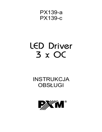 PX139-a PX139-c LED Driver 3 x OC INSTRUKCJA OBSŁUGI R SPIS TREŚCI 1. Opis ogólny.......................................................................................................................... 1 2. Warunki bezpieczeństwa..................................................................................................... 1 3. Opis złączy i elementów sterowania................................................................................... 2 4. Oznaczenia wyświetlanych komunikatów........................................................................... 2 5. Ustawianie adresu DMX...................................................................................................... 3 6. Funkcja FLP......................................................................................................................... 3 7. Funkcja MASTER / SLAVE................................................................................................. 4 8. Balans bieli.......................................................................................................................... 5 9. Tryb kolorów........................................................................................................................ 5 10. Ustawienia indywidualne..................................................................................................... 5 11. Reakcja na brak sygnału DMX............................................................................................ 6 12. Opis programów.................................................................................................................. 7 13. Częstotliwość sterowania jasnością.................................................................................... 8 14. Korekta częstotliwości sterowania...................................................................................... 8 15. Schemat podłączeń............................................................................................................. 8 15.1 Podłączenie 6-przewodowe.............................................................................. 9 15.2 Podłączenie 4-przewodowe.............................................................................. 9 16. Programowanie................................................................................................................... 10 17. Protokół PxLink................................................................................................................... 11 18. Wymiary............................................................................................................................... 11 19. Specyfikacja techniczna...................................................................................................... 11 20. Deklaracja zgodności.......................................................................................................... 12 Producent zastrzega sobie możliwość wprowadzania zmian w funkcjonowaniu i obsłudze sterownika, mających na celu ulepszenie wyrobu. PXM s.c. tel.: (0 12) 626 46 92 ul. Przemysłowa 12 fax: (0 12) 626 46 94 E-mail: [email protected] 30-701 Kraków Internet: www.pxm.pl 1. OPIS OGÓLNY Moduł PX139 jest przeznaczony do sterowania diodami LED. Wbudowany odbiornik DMX umożliwia wysterowanie 3 kanałów (R, G, B) bezpośrednio protokołem DMX. Szeroki zakres napięcia zasilającego i wysoka obciążalność prądowa wyjść umożliwiają wysterowanie dużych ilości diod LED. PX139 może być zarówno sterowany sygnałem DMX, jak i działać samodzielnie. W takim przypadku użytkownik ma do dyspozycji w pełni programowalna scenę i 19 fabrycznie zaprogramowanych sekwencji dla których może dodatkowo dowolnie zmieniać prędkość odtwarzania i płynność zmiany kroków. Driver posiada wbudowany system dostrajania częstotliwości sygnału sterującego (technologia "flicker free"), co czyni go szczególnie przydatnym w zastosowaniach dla przemysłu telewizyjnego. Ponieważ diody LED z serii RGB często różnią się dosyć znacznie parametrami, może to spowodować problemy w otrzymaniu białego koloru (wysterowanie wszystkich kanałów na 100%). Dlatego PX139 został wyposażony w niezwykle przydatną funkcję tzw. balansu bieli. Dzięki niej można dobrać dla każdego zestawu diod LED tak skorygowane sterowanie poszczególnymi kolorami przez moduł, aby przy pełnym wysterowaniu osiągnąć kolor biały. Co więcej, funkcja ta pozwala także korygować również temperaturę barwy białego koloru. Driver PX139 produkowany jest w dwóch wersjach: common anode (PX139-a) - umożliwia podłączenie diod na wspólnej anodzie oraz common cathode (PX139-c), dający możliwość podłączenia na wspólnej katodzie. 2. WARUNKI BEZPIECZEŃSTWA PX139 jest urządzeniem zasilanym napięciem bezpiecznym 24 V, jednak podczas jego instalacji i użytkowania należy bezwzględnie przestrzegać podanych poniżej reguł: 1. Urządzenie może być podłączone wyłącznie do zasilania 7 - 24 V DC (napięcie stabilizowane) o obciążalności zgodnej z danymi technicznymi. 2. Należy chronić wszystkie przewody przed uszkodzeniami mechanicznymi i termicznymi. 3. W przypadku uszkodzenia któregokolwiek z przewodów należy zastąpić go przewodem o takich samych danych technicznych i atestach. 4. Do podłączenia sygnału DMX stosować wyłącznie przewód ekranowany. 5. Wszelkie naprawy jak i podłączenia wyjść czy sygnału DMX mogą być wykonywane wyłącznie przy odłączonym zasilaniu. 6. Należy bezwzględnie chronić PX139 przed kontaktem z wodą i innymi płynami. 7. Unikać gwałtownych wstrząsów, a w szczególności upadków. 8. Nie włączać urządzeniach w pomieszczeniach o wilgotności powyżej 90%. 9. Urządzenia nie należy używać w pomieszczeniach o temperaturze niższej niż +2oC lub wyższej niż + 40oC. 10. Do czyszczenia używać wyłącznie lekko wilgotnej ściereczki. 1 3. OPIS ZŁ