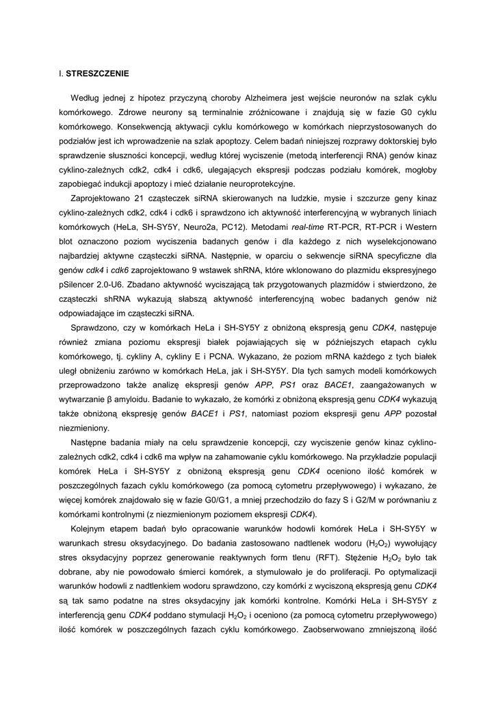 I. STRESZCZENIE Według jednej z hipotez przyczyną choroby Alzheimera jest wejście neuronów na szlak cyklu komórkowego. Zdrowe neurony są terminalnie zróżnicowane i znajdują się w fazie G0 cyklu komórkowego. Konsekwencją aktywacji cyklu komórkowego w komórkach nieprzystosowanych do podziałów jest ich wprowadzenie na szlak apoptozy. Celem badań niniejszej rozprawy doktorskiej było sprawdzenie słuszności koncepcji, według której wyciszenie (metodą interferencji RNA) genów kinaz cyklino-zależnych cdk2, cdk4 i cdk6, ulegających ekspresji podczas podziału komórek, mogłoby zapobiegać indukcji apoptozy i mieć działanie neuroprotekcyjne. Zaprojektowano 21 cząsteczek siRNA skierowanych na ludzkie, mysie i szczurze geny kinaz cyklino-zależnych cdk2, cdk4 i cdk6 i sprawdzono ich aktywność interferencyjną w wybranych liniach komórkowych (HeLa, SH-SY5Y, Neuro2a, PC12). Metodami real-time RT-PCR, RT-PCR i Western blot oznaczono poziom wyciszenia badanych genów i dla każdego z nich wyselekcjonowano najbardziej aktywne cząsteczki siRNA. Następnie, w oparciu o sekwencje siRNA specyficzne dla genów cdk4 i cdk6 zaprojektowano 9 wstawek shRNA, które wklonowano do plazmidu ekspresyjnego pSilencer 2.0-U6. Zbadano aktywność wyciszającą tak przygotowanych plazmidów i stwierdzono, że cząsteczki shRNA wykazują słabszą aktywność interferencyjną wobec badanych genów niż odpowiadające im cząsteczki siRNA. Sprawdzono, czy w komórkach HeLa i SH-SY5Y z obniżoną ekspresją genu CDK4, następuje również zmiana poziomu ekspresji białek pojawiających się w późniejszych etapach cyklu komórkowego, tj. cykliny A, cykliny E i PCNA. Wykazano, że poziom mRNA każdego z tych białek uległ obniżeniu zarówno w komórkach HeLa, jak i SH-SY5Y. Dla tych samych modeli komórkowych przeprowadzono także analizę ekspresji genów APP, PS1 oraz BACE1, zaangażowanych w wytwarzanie β amyloidu. Badanie to wykazało, że komórki z obniżoną ekspresją genu CDK4 wykazują także obniżoną ekspresję genów BACE1 i PS1, natomiast poziom ekspresji genu APP pozostał niezmieniony. Następne badania miały na celu sprawdzenie koncepcji, czy wyciszenie genów kinaz cyklinozależnych cdk2, cdk4 i cdk6 ma wpływ na zahamowanie cyklu komórkowego. Na przykładzie populacji komórek HeLa i SH-SY5Y z obniżoną ekspresją genu CDK4 oceniono ilość komórek w poszczególnych fazach cyklu komórkowego (za pomocą cytometru przepływowego) i wykazano, że więcej komórek znajdowało się w fazie G0/G1, a mniej przechodziło do fazy S i G2/M w porównaniu z komórkami kontrolnymi (z niezmienionym poziomem ekspresji CDK4). Kolejnym etapem badań było opracowanie warunków hodowli komórek HeLa i SH-SY5Y w warunkach stresu oksydacyjnego. Do badania zastosowano nadtlenek wodoru (H2O2) wywołujący stres oksydacyjny poprzez generowanie reaktywnych form tlenu (RFT). Stężenie H2O2 było tak dobrane, aby nie powodowało śmierci komórek, a stymulowało je do proliferacji. Po optymalizacji warunków hodowli z nadtlenkiem wodoru sprawdzono, czy komórki z wyciszoną ekspresją genu CDK4 są tak samo podatne na stres oksydacyjny jak komórki kontrolne. Komórki HeLa i SH-SY5Y z interferencją genu CDK4 poddano stymulacji H2O2 i oceniono (za pomocą cytometru przepływowego) ilość komórek w poszczególnych fazach cyklu komórkowego. Zaobserwowano zmniejszoną ilość komórek w fazie S i G2/M, i zwiększoną ilość komórek w fazie G0/G1, w porównaniu z kontrolą. Ponadto, nieznacznie zmniejszyła się ilość komórek apoptotycznych. Przeprowadzono ocenę stopnia indukcji apoptozy wywołanej działaniem nadtlenku wodoru w komórkach Neuro2a z obniżoną ekspresją genu cdk4 lub równocześnie trzech genów cdk2, cdk4 i cdk6. W badaniach tych określono aktywność kaspazy 3 i 7, która okazała się niższa w komórkach badanych niż w komórkach transfekowanych kontrolnym siRNA. Wynik ten wskazuje, że wyciszenie genów kinaz cyklino-zależnych, a w szczególności kinazy cdk4, działa ochronnie na komórki w przypadku zaistnienia stresu oksydacyjnego. W kolejnym etapie badań w komórkach HeLa i SH-SY5Y uzyskano nadekspresję inhibitorów kinaz cyklino-zależnych p16(INK4a), p18(INK4c), p21(CDKN1A, WAF1) z plazmidów ekspresyjnych pVax1 i pEGFP-C1 z wklonowanymi wstawkami kodującymi pożądane transgeny. Analiza zmian faz cyklu komórkowego (za pomocą cytometru przepływowego) wykazała, że nadekspresja inhibitorów kinaz cyklino-zależnych z użyciem pVax1 nieznacznie wpływa na zmiany w populacji komórek w poszczególnych fazach cyklu komórkowego, aczkolwiek w zdecydowanej większości zmiany te wskazywały zwiększony procent populacji komórek w fazie G0/G1, a zmniejszony w fazach S i G2/M, w porównaniu do komórek kontrolnych, transfekowanych pustym plazmidem. Nadekspresja inhibitorów kinaz cyklino-zależnych w plazmidzie pEGFP-C1 tylko nieznacznie wpływała na zmiany w populacji komórek w poszczególnych fazach cyklu komórkowego. W ostatniej części pracy porównano właściwości dwóch dokomórkowych nośników kwasów nukleinowych, neurospecyficznego peptydu RVG-9R i nośnika lipidowego Lipofectamine 2000. Stwierdzono, iż peptyd RVG-9R wydajnie wprowadza siRNA do komórek neuronalnych, czego dowodem było wyciszenie docelowego genu cdk4. Peptyd ten, jak wcześniej wykazano, specyficznie łączy się receptorami nikotynowymi obecnymi w błonie komórek o charakterze neuronalnym, takich jak komórki Neuro2a. W nieneuronalnych komórkach HeLa, w których receptory nikotynowe nie występują, peptyd RVG-9R nie wprowadzał siRNA, czego wynikiem był brak wyciszenia genu cdk4. Drugi badany nośnik kwasów nukleinowych, Lipofectamine 2000, nie działał neuroselektywnie i wydajnie wprowadzał siRNA do obu typów komórek, czego wynikiem było wyciszenie ekspresji docelowego genu cdk4.