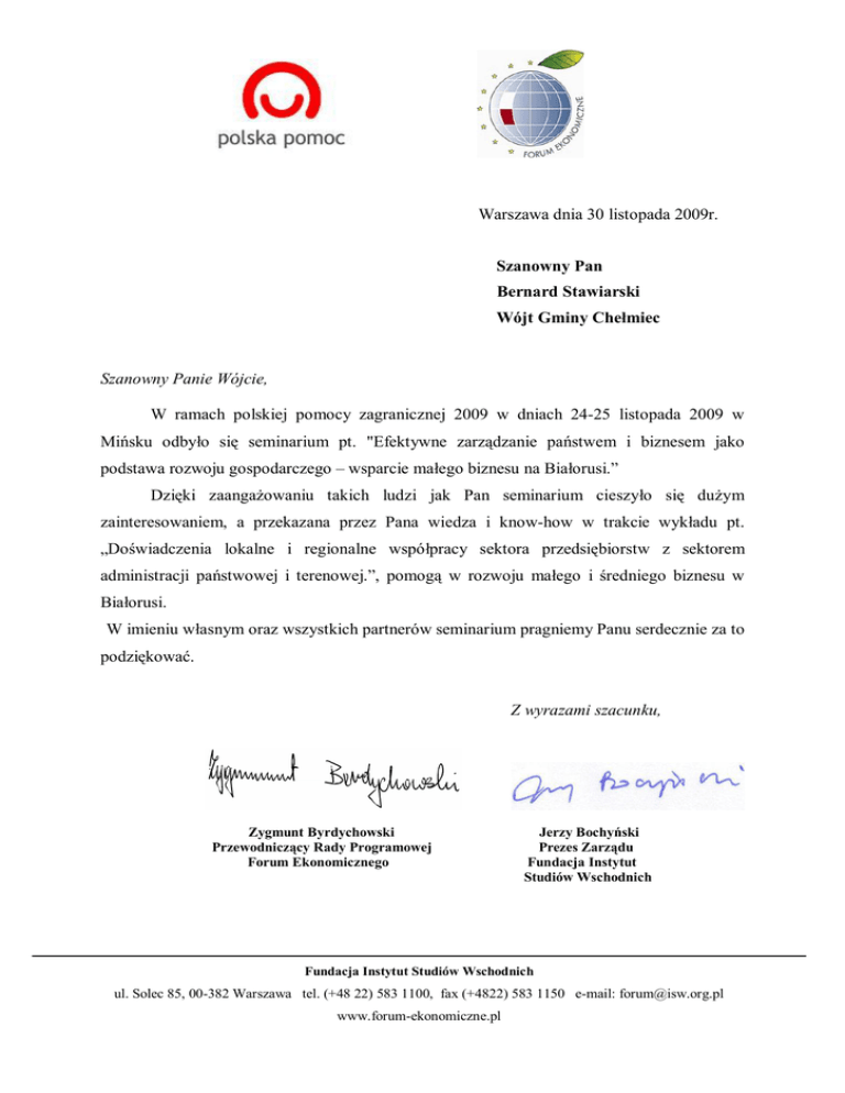 Warszawa dnia 30 listopada 2009r. Szanowny Pan Bernard Stawiarski Wójt Gminy Chełmiec Szanowny Panie Wójcie, W ramach polskiej pomocy zagranicznej 2009 w dniach 24-25 listopada 2009 w Mińsku odbyło się seminarium pt. "Efektywne zarządzanie państwem i biznesem jako podstawa rozwoju gospodarczego – wsparcie małego biznesu na Białorusi.” Dzięki zaangażowaniu takich ludzi jak Pan seminarium cieszyło się dużym zainteresowaniem, a przekazana przez Pana wiedza i know-how w trakcie wykładu pt. „Doświadczenia lokalne i regionalne współpracy sektora przedsiębiorstw z sektorem administracji państwowej i terenowej.”, pomogą w rozwoju małego i średniego biznesu w Białorusi. W imieniu własnym oraz wszystkich partnerów seminarium pragniemy Panu serdecznie za to podziękować. Z wyrazami szacunku, Zygmunt Byrdychowski Przewodniczący Rady Programowej Forum Ekonomicznego Jerzy Bochyński Prezes Zarządu Fundacja Instytut Studiów Wschodnich Fundacja Instytut Studiów Wschodnich ul. Solec 85, 00-382 Warszawa tel. (+48 22) 583 1100, fax (+4822) 583 1150 e-mail: [email protected] www.forum-ekonomiczne.pl