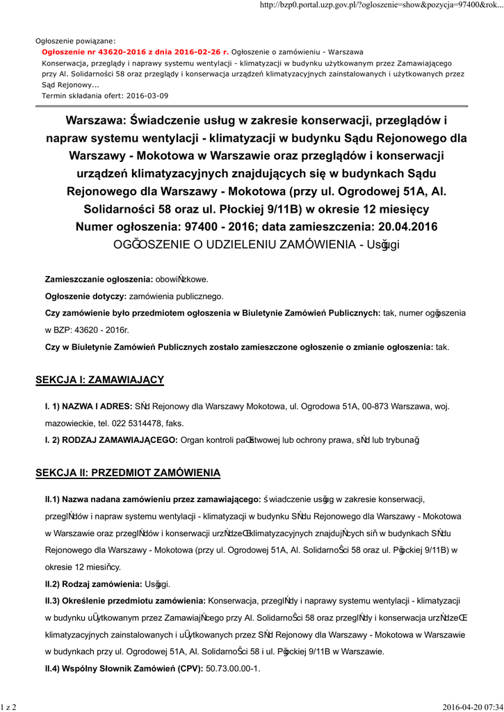 1z2 http://bzp0.portal.uzp.gov.pl/?ogloszenie=show&pozycja=97400&rok... Ogłoszenie powiązane: Ogłoszenie nr 43620-2016 z dnia 2016-02-26 r. Ogłoszenie o zamówieniu - Warszawa Konserwacja, przeglądy i naprawy systemu wentylacji - klimatyzacji w budynku użytkowanym przez Zamawiającego przy Al. Solidarności 58 oraz przeglądy i konserwacja urządzeń klimatyzacyjnych zainstalowanych i użytkowanych przez Sąd Rejonowy... Termin składania ofert: 2016-03-09 Warszawa: Świadczenie usług w zakresie konserwacji, przeglądów i napraw systemu wentylacji - klimatyzacji w budynku Sądu Rejonowego dla Warszawy - Mokotowa w Warszawie oraz przeglądów i konserwacji urządzeń klimatyzacyjnych znajdujących się w budynkach Sądu Rejonowego dla Warszawy - Mokotowa (przy ul. Ogrodowej 51A, Al. Solidarności 58 oraz ul. Płockiej 9/11B) w okresie 12 miesięcy Numer ogłoszenia: 97400 - 2016; data zamieszczenia: 20.04.2016 OGŁOSZENIE O UDZIELENIU ZAMÓWIENIA - Usługi Zamieszczanie ogłoszenia: obowiązkowe. Ogłoszenie dotyczy: zamówienia publicznego. Czy zamówienie było przedmiotem ogłoszenia w Biuletynie Zamówień Publicznych: tak, numer ogłoszenia w BZP: 43620 - 2016r. Czy w Biuletynie Zamówień Publicznych zostało zamieszczone ogłoszenie o zmianie ogłoszenia: tak. SEKCJA I: ZAMAWIAJĄCY I. 1) NAZWA I ADRES: Sąd Rejonowy dla Warszawy Mokotowa, ul. Ogrodowa 51A, 00-873 Warszawa, woj. mazowieckie, tel. 022 5314478, faks. I. 2) RODZAJ ZAMAWIAJĄCEGO: Organ kontroli państwowej lub ochrony prawa, sąd lub trybunał. SEKCJA II: PRZEDMIOT ZAMÓWIENIA II.1) Nazwa nadana zamówieniu przez zamawiającego: Świadczenie usług w zakresie konserwacji, przeglądów i napraw systemu wentylacji - klimatyzacji w budynku Sądu Rejonowego dla Warszawy - Mokotowa w Warszawie oraz przeglądów i konserwacji urządzeń klimatyzacyjnych znajdujących się w budynkach Sądu Rejonowego dla Warszawy - Mokotowa (przy ul. Ogrodowej 51A, Al. Solidarności 58 oraz ul. Płockiej 9/11B) w okresie 12 miesięcy. II.2) Rodzaj zamówienia: Usługi. II.3) Określenie przedmiotu zamówienia: Konserwacja, przeglądy i naprawy systemu wentylacji - klimatyzacji w budynku użytkowanym przez Zamawiającego przy Al. Solidarności 58 oraz przeglądy i konserwacja urządzeń klimatyzacyjnych zainstalowanych i użytkowanych przez Sąd Rejonowy dla Warszawy - Mokotowa w Warszawie w budynkach przy ul. Ogrodowej 51A, Al. Solidarności 58 i ul. Płockiej 9/11B w Warszawie. II.4) Wspólny Słownik Zamówień (CPV): 50.73.00.00-1. 2016-04-20 07:34 2z2 http://bzp0.portal.uzp.gov.pl/?ogloszenie=show&pozycja=97400&rok... SEKCJA III: PROCEDURA III.1) TRYB UDZIELENIA ZAMÓWIENIA: Przetarg nieograniczony III.2) INFORMACJE ADMINISTRACYJNE Zamówienie dotyczy projektu/programu finansowanego ze środków Unii Europejskiej: nie SEKCJA IV: UDZIELENIE ZAMÓWIENIA IV.1) DATA UDZIELENIA ZAMÓWIENIA: 31.03.2016. IV.2) LICZBA OTRZYMANYCH OFERT: 6. IV.3) LICZBA ODRZUCONYCH OFERT: 3. IV.4) NAZWA I ADRES WYKONAWCY, KTÓREMU UDZIELONO ZAMÓWIENIA: Comfortclima Serwis Janusz Kowalski, ul. Zgoda 15/5, 05-300 Mińsk Mazowiecki, kraj/woj. mazowieckie. IV.5) Szacunkowa wartość zamówienia (bez VAT): 160000,00 PLN. IV.6) INFORMACJA O CENIE WYBRANEJ OFERTY ORAZ O OFERTACH Z NAJNIŻSZĄ I NAJWYŻSZĄ CENĄ Cena wybranej oferty: 87871,20 Oferta z najniższą ceną: 87871,20 / Oferta z najwyższą ceną: 134094,50 Waluta: PLN . 2016-04-20 07:34
