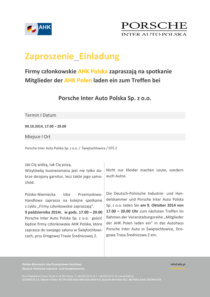 Zaproszenie_Einladung Firmy członkowskie AHK Polska zapraszają na spotkanie Mitglieder der AHK Polen laden ein zum Treffen bei Porsche Inter Auto Polska Sp. z o.o. Termin I Datum 09.10.2014, 17.00 – 20.00 Miejsce I Ort Porsche Inter Auto Polska Sp. z o.o. / Świętochłowice / DTŚ 2 Jak Cię widzą, tak Cię piszą. Wizytówką businessmana jest nie tylko do- Nicht nur Kleider machen Leute, sondern brze skrojony garnitur, lecz także jego samo- auch Autos. chód. Polsko-Niemiecka Izba PrzemysłowoHandlowa zaprasza na kolejne spotkanie z cyklu „Firmy członkowskie zapraszają”. 9 października 2014r. w godz. 17.00 – 20.00 Porsche Inter Auto Polska Sp. z o.o. gościć będzie firmy członkowskie AHK Polska, które zaprasza do swojego salonu w Świętochłowicach, przy Drogowej Trasie Średnicowej 2. Die Deutsch-Polnische Industrie- und Handelskammer und Porsche Inter Auto Polska Sp. z o.o. laden Sie am 9. Oktober 2014 von 17.00 – 20.00 Uhr zum nächsten Treffen im Rahmen der Veranstaltungsreihe „Mitglieder der AHK Polen laden ein“ in das Autohaus Porsche Inter Auto in Świętochłowice, Drogowa Trasa Średnicowa 2 ein. W trakcie spotkania będzie można przymie- Während des Treffens werden Sie die Gelerzyć się do wybranych modeli samochodów z genheit haben, die ausgewählten Modelle grupy Volkswagen podczas jazd testowych. der Volkswagen-Gruppe im Rahmen einer Probefahrt auszuprobieren. Ponadto na naszych Gości czekać będzie loteria wizytówkowa, w której rozlosowane będą atrakcyjne nagrody oraz weekend z samochodem. Prosimy pamiętać o wizytówkach! Darüber hinaus wartet auf unsere Gäste eine Visitenkartenlotterie, bei der attraktive Preise und ein Auto-Wochenende verlost werden. Bitte vergessen Sie Ihre Visitenkarten nicht! Udział w spotkaniu jest bezpłatny. Die Teilnahme ist kostenfrei. Prosimy o potwierdzenie Państwa udziału na Bitte teilen Sie uns Ihr Erscheinen per E-Mail załączonym formularzu mailem na adres: auf dem beigefügten Formular an die [email protected] do dnia 30.09.2014r. se [email protected] bis zum 30.09.2014 mit. Ilość miejsc ograniczona – decyduje kolej- Die Teilnehmerzahl ist begrenzt – die Reiność zgłoszeń. henfolge ist ausschlaggebend. Kontakt AHK Polska / AHK Polen Biuro Regionalne / Regionalbüro E-Mail: [email protected] Tel. 32 232 15 10 Potwierdzenie udziału Anmeldung Firmy członkowskie AHK Polska zapraszają Mitglieder der AHK Polen laden ein zum na spotkanie w Treffen bei Porsche Inter Auto Polska Sp. z o.o. Potwierdzenie udziału prosimy przesłać do dnia 30.09.2014 mailem na adres: Bitte senden Sie Ihre Anmeldung bis zum 30.09.2014 per E-Mail an: [email protected] Imię i Nazwisko / Vor- und Nachname …………………………………………………………………………………………………………………………………………………..…..……… Stanowisko / Position ..………………………………………………………………………………………………………………………………………….………………… Firma / Instytucja / Institution ...…………………………………………………………………….……………………………………………………………………………………… Ulica i numer / Straße, Nummer …………………………………………………………………………………………………………………………………………………………….… Kod i miejscowość / PLZ, Ort ………………………………………………………………………NIP / Ust-Id.…..……………………………………………………….………. Tel. ………………………………………………….….…….… Mail ………….………………….…….…………………………………..…… Udział w spotkaniu jest bezpłatny, jednak w przypadku rezygnacji z uczestnictwa po 30.09.2014 organizatorzy zastrzegają sobie prawo obciążenia uczestnika kosztami udziału w wysokości 100 PLN + 23% VAT od osoby niezależnie od członkostwa w AHK Polska/. Die Teilnahme ist kostenlos. Im Falle einer Stornierung Ihrer Teilnahme nach dem 30.09.2014 behalten wir uns jedoch das Recht vor, eine Rechnung für die Teilnahmekosten in Höhe von 100 PLN + 23% VAT pro Person unabhängig von der Mitgliedschaft bei der AHK Polen auszustellen. Data i podpis / Datum und Unterschrift ………………………………………………..…………………..…………………………