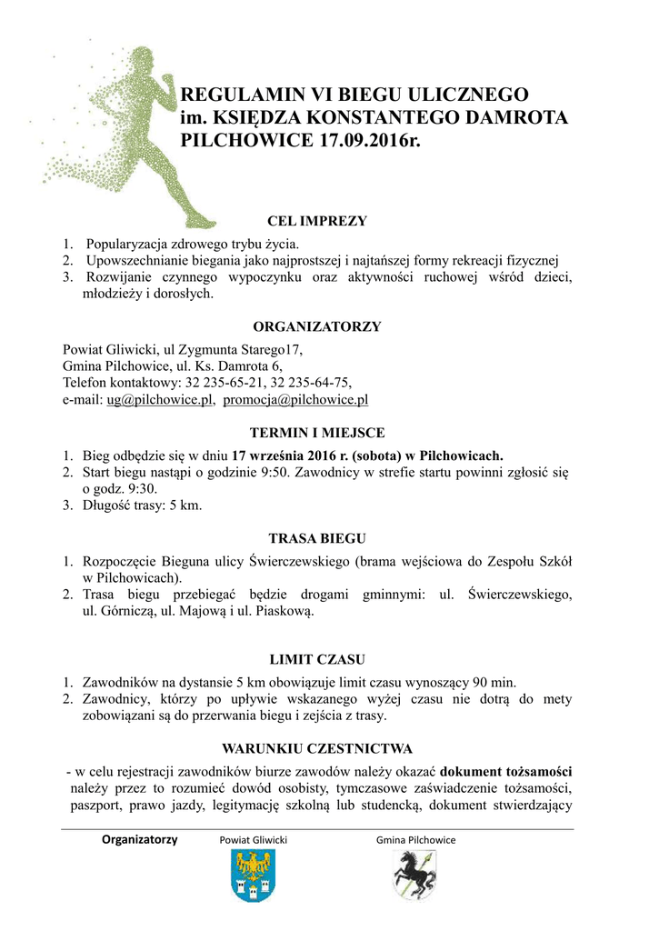REGULAMIN VI BIEGU ULICZNEGO im. KSIĘDZA KONSTANTEGO DAMROTA PILCHOWICE 17.09.2016r. CEL IMPREZY 1. Popularyzacja zdrowego trybu życia. 2. Upowszechnianie biegania jako najprostszej i najtańszej formy rekreacji fizycznej 3. Rozwijanie czynnego wypoczynku oraz aktywności ruchowej wśród dzieci, młodzieży i dorosłych. ORGANIZATORZY Powiat Gliwicki, ul Zygmunta Starego17, Gmina Pilchowice, ul. Ks. Damrota 6, Telefon kontaktowy: 32 235-65-21, 32 235-64-75, e-mail: [email protected], [email protected] TERMIN I MIEJSCE 1. Bieg odbędzie się w dniu 17 września 2016 r. (sobota) w Pilchowicach. 2. Start biegu nastąpi o godzinie 9:50. Zawodnicy w strefie startu powinni zgłosić się o godz. 9:30. 3. Długość trasy: 5 km. TRASA BIEGU 1. Rozpoczęcie Bieguna ulicy Świerczewskiego (brama wejściowa do Zespołu Szkół w Pilchowicach). 2. Trasa biegu przebiegać będzie drogami gminnymi: ul. Świerczewskiego, ul. Górniczą, ul. Majową i ul. Piaskową. LIMIT CZASU 1. Zawodników na dystansie 5 km obowiązuje limit czasu wynoszący 90 min. 2. Zawodnicy, którzy po upływie wskazanego wyżej czasu nie dotrą do mety zobowiązani są do przerwania biegu i zejścia z trasy. WARUNKIU CZESTNICTWA - w celu rejestracji zawodników biurze zawodów należy okazać dokument tożsamości należy przez to rozumieć dowód osobisty, tymczasowe zaświadczenie tożsamości, paszport, prawo jazdy, legitymację szkolną lub studencką, dokument stwierdzający Organizatorzy Powiat Gliwicki Gmina Pilchowice tożsamość cudzoziemca albo inny dokument potwierdzający tożsamość. - zawodnik do 18 lat powinien posiadać zgodę rodziców/opiekunów prawnych na start oraz pisemne oświadczenie rodziców/opiekunów prawnych o braku przeciwwskazań zdrowotnych do udziału w zawodach (oświadczenie załącznik nr 1 do regulaminu dostępny w biurze zawodów i na stronie internetowej organizatorów), - zawodnik powyżej 18 lat powinien posiadać pisemne oświadczenie o braku przeciwwskazań zdrowotnych do udziału w zawodach (oświadczenie załącznik nr 2 do regulaminu dostępny w biurze zawodów i na stronie internetowej organizatorów), - zawodnicy ubezpieczają się we własnym zakresie. ZGŁOSZENIA 1. Zgłoszenia internetowe za pośrednictwem strony: http://timekeeper.pl/bieg/?bieg_id=153 do dnia 11 września 2016r. 2. Po tym terminie w przypadku nie osiągnięcia założonej liczby 200 uczestników zgłoszenia będą przyjmowane w dniu zawodów od godziny 9.00 do 9.30 wyłącznie w biurze zawodów. 3.Klasyfikacje wiekowe w biegu na dystansie 5 km: - do 16 lat dziewczęta - do 16 lat chłopcy - 17-19 lat kobiety - 17-19 lat mężczyźni - 20-29 lat kobiety - 20-29 lat mężczyźni - 30-39 lat kobiety - 30-39 lat mężczyźni - 40-49 lat kobiety - 40-49 lat mężczyźni - 50-59 lat kobiety - 50-59 lat mężczyźni powyżej 60 lat kobiety powyżej 60 lat mężczyźni PROGRAM BIEGU - od godz. 9.00 do godz. 9.45 – wydawanie numerów startowych, - godz. 9.50 -11.20- bieg główny /5 km/, - około godz. 11.00 - dekoracja zwycięzców. Organizatorzy Powiat Gliwicki Gmina Pilchowice NAGRODY 1. Każdy zawodnik, który ukończy bieg w wyznaczonym limicie czasu otrzyma na mecie pamiątkowy medal. 2. Zwycięzcy w kategoriach wiekowych otrzymują dyplomy. 3. Trzech pierwszych zawodników, osobno w kategorii kobiet i mężczyzn otrzyma puchary. POSTANOWIENIA KOŃCOWE 1. Bieg odbędzie się bez względu na warunki atmosferyczne, 2. Organizatorzy przewidują limit 200 startujących zawodników, 3. Organizatorzy zapewnią pomoc medyczną oraz zabezpieczenie imprezy sportowej poprzez ogół skoordynowanych działań podejmowanych w celu zapewnienia bezpieczeństwa i porządku publicznego, 4. Za rzeczy pozostawione lub zagubione w dniu zawodów organizatorzy nie ponoszą odpowiedzialności, 5. Organizatorzy zastrzegą sobie prawo do zmian treści regulaminu, a o wszystkich zmianach informować będą za pośrednictwem stron www.pilchowice.pl, www.starostwo.gliwice.pl 6. Interpretacja powyższego regulaminu należeć będzie do organizatorów i sędziego głównego. PATRONAT HONOROWY PATRONAT MEDIALNY Organizatorzy Powiat Gliwicki Gmina Pilchowice Załącznik Nr 1 do Regulaminu VI Biegu Ulicznego im. Księdza Konstantego Damrota OŚWIADCZENIE Oświadczam, iż stan mojego zdrowia ................................................................................................................ (imię i nazwisko) pozwala na udział w VI Biegu Ulicznego im. Księdza Konstantego Damrota. ......................................................................... data i podpis Zgodnie z ustawą z dni z 29 sierpnia 1997 r. o ochronie danych osobowych tj. (DZ. U. z 2015 r., poz. 2135, z późn.zm.) wyrażam zgodę na przetwarzanie danych osobowych przez Organizatora oraz wyrażam zgodę na wykonywanie i upowszechnianie zdjęć, materiałów filmowych z moim wizerunkiem w mediach w związku z organizacją zawodów sportowych pn. „VI Bieg Uliczny im. Księdza Konstantego Damrota”. ......................................................................... data i podpis *właściwe podkreślić Organizatorzy Powiat Gliwicki Gmina Pilchowice Załącznik Nr 2 do Regulaminu VI Biegu Ulicznego im. Księdza Konstantego Damrota ZGODA RODZICÓW I OPIEKUNÓW PRAWNYCHI NA UDZIAŁ DZIECKA W ZAWODACH SPORTOWYCH ...................................................................................................................... (imię i nazwisko rodzica/opiekuna) (telefon kontaktowy rodzica / opiekuna) Wyrażam zgodę na udział dziecka ................................................................................................................ (imię i nazwisko) w VI Biegu Ulicznego im. Księdza Konstantego Damrota OŚWIADCZENIE ** Oświadczam, iż stan zdrowia mojego syna /córki* ................................................................................................................ (imię i nazwisko) pozwala na udział w VI Biegu Ulic