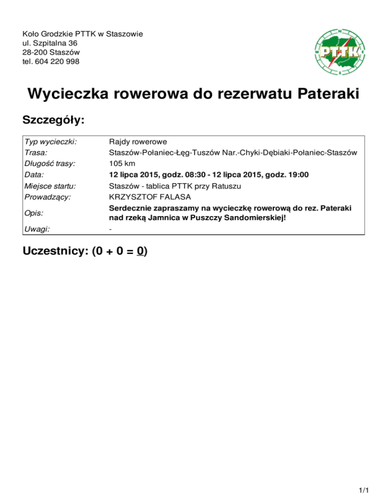 Koło Grodzkie PTTK w Staszowie ul. Szpitalna 36 28-200 Staszów tel. 604 220 998 Wycieczka rowerowa do rezerwatu Pateraki Szczegóły: Typ wycieczki: Trasa: Długość trasy: Data: Rajdy rowerowe Staszów-Połaniec-Łęg-Tuszów Nar.-Chyki-Dębiaki-Połaniec-Staszów 105 km 12 lipca 2015, godz. 08:30 - 12 lipca 2015, godz. 19:00 Miejsce startu: Prowadzący: Staszów - tablica PTTK przy Ratuszu KRZYSZTOF FALASA Serdecznie zapraszamy na wycieczkę rowerową do rez. Pateraki nad rzeką Jamnica w Puszczy Sandomierskiej! Opis: Uwagi: - Uczestnicy: (0 + 0 = 0) 1/1