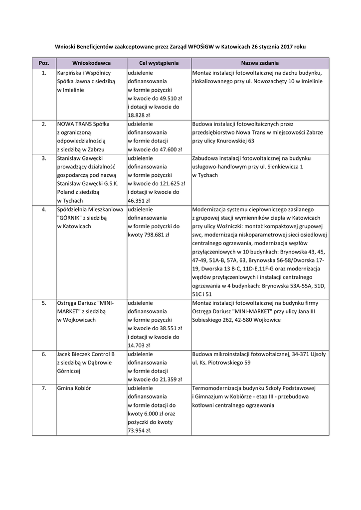 Wnioski Beneficjentów zaakceptowane przez Zarząd WFOŚiGW w Katowicach 26 stycznia 2017 roku Poz. 1. 2. 3. 4. Wnioskodawca Cel wystąpienia Karpińska i Wspólnicy Spółka Jawna z siedzibą w Imielinie udzielenie dofinansowania w formie pożyczki w kwocie do 49.510 zł i dotacji w kwocie do 18.828 zł NOWA TRANS Spółka udzielenie z ograniczoną dofinansowania odpowiedzialnością w formie dotacji z siedzibą w Zabrzu w kwocie do 47.600 zł Stanisław Gawęcki udzielenie prowadzący działalność dofinansowania gospodarczą pod nazwą w formie pożyczki Stanisław Gawęcki G.S.K. w kwocie do 121.625 zł Poland z siedzibą i dotacji w kwocie do w Tychach 46.351 zł Spółdzielnia Mieszkaniowa udzielenie "GÓRNIK" z siedzibą dofinansowania w Katowicach w formie pożyczki do kwoty 798.681 zł 5. Ostręga Dariusz "MINIMARKET" z siedzibą w Wojkowicach 6. Jacek Bieczek Control B z siedzibą w Dąbrowie Górniczej 7. Gmina Kobiór udzielenie dofinansowania w formie pożyczki w kwocie do 38.551 zł i dotacji w kwocie do 14.703 zł udzielenie dofinansowania w formie dotacji w kwocie do 21.359 zł udzielenie dofinansowania w formie dotacji do kwoty 6.000 zł oraz pożyczki do kwoty 73.954 zł. Nazwa zadania Montaż instalacji fotowoltaicznej na dachu budynku, zlokalizowanego przy ul. Nowozachęty 10 w Imielinie Budowa instalacji fotowoltaicznych przez przedsiębiorstwo Nowa Trans w miejscowości Zabrze przy ulicy Knurowskiej 63 Zabudowa instalacji fotowoltaicznej na budynku usługowo-handlowym przy ul. Sienkiewicza 1 w Tychach Modernizacja systemu ciepłowniczego zasilanego z grupowej stacji wymienników ciepła w Katowicach przy ulicy Woźniczki: montaż kompaktowej grupowej swc, modernizacja niskoparametrowej sieci osiedlowej centralnego ogrzewania, modernizacja węzłów przyłączeniowych w 10 budynkach: Brynowska 43, 45, 47-49, 51A-B, 57A, 63, Brynowska 56-58/Dworska 1719, Dworska 13 B-C, 11D-E,11F-G oraz modernizacja węzłów przyłączeniowych i instalacji centralnego ogrzewania w 4 budynkach: Brynowska 53A-55A, 51D, 51C i 51 Montaż instalacji fotowoltaicznej na budynku firmy Ostręga Dariusz "MINI-MARKET" przy ulicy Jana III Sobieskiego 262, 42-580 Wojkowice Budowa mikroinstalacji fotowoltaicznej, 34-371 Ujsoły ul. Ks. Piotrowskiego 59 Termomodernizacja budynku Szkoły Podstawowej i Gimnazjum w Kobiórze - etap III - przebudowa kotłowni centralnego ogrzewania Poz. 8. 9. 10. Wnioskodawca Michał Scholz prowadzący działalność gospodarczą pod nazwą „Michał Scholz „RONDO II” z siedzibą w Katowicach Śląska Izba Rolnicza w Katowicach Biprotrans-Kuliński Sp. z o.o. z siedzibą w Częstochowie Cel wystąpienia Nazwa zadania udzielenie dofinansowania w formie dotacji do kwoty 12.889 zł Montaż instalacji fotowoltaicznej na budynku firmy Rondo II Michał Scholz przy ul. Boya-Żeleńskiego 108 w Katowicach udzielenie dofinansowania w formie dotacji do kwoty 800.000 zł udzielenie dofinansowania w formie dotacji w kwocie do 11.800 zł Wapnowanie gleb kwaśnych i bardzo kwaśnych na terenie województwa śląskiego w roku 2017 Budowa elektrowni fotowoltaicznej o mocy 12,5 kWp na obiekcie przy ul. Kilińskiego 37 w Częstochowie