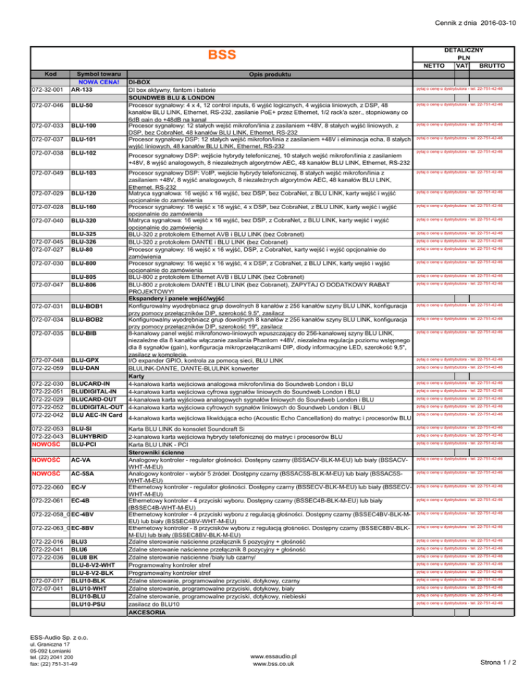 Cennik z dnia 2016-03-10 BSS Kod 072-32-001 Symbol towaru NOWA CENA! AR-133 072-07-046 BLU-50 072-07-033 BLU-100 072-07-037 BLU-101 072-07-038 BLU-102 072-07-049 BLU-103 Opis produktu DI-BOX DI box aktywny, fantom i baterie SOUNDWEB BLU & LONDON Procesor sygnałowy: 4 x 4, 12 control inputs, 6 wyjść logicznych, 4 wyjścia liniowych, z DSP, 48 kanałów BLU LINK, Ethernet, RS-232, zasilanie PoE+ przez Ethernet, 1/2 rack'a szer., stopniowany co 6dB gain do +48dB na kanał Procesor sygnałowy: 12 stałych wejść mikrofon/linia z zasilaniem +48V, 8 stałych wyjść liniowych, z DSP, bez CobraNet, 48 kanałów BLU LINK, Ethernet, RS-232 Procesor sygnałowy DSP: 12 stałych wejść mikrofon/linia z zasilaniem +48V i eliminacja echa, 8 stałych wyjść liniowych, 48 kanałów BLU LINK, Ethernet, RS-232 Procesor sygnałowy DSP: wejście hybrydy telefonicznej, 10 stałych wejść mikrofon/linia z zasilaniem +48V, 8 wyjść analogowych, 8 niezależnych algorytmów AEC, 48 kanałów BLU LINK, Ethernet, RS-232 DETALICZNY PLN NETTO VAT BRUTTO Pełny INTERNET pytaj o cenę u dystrybutora - tel. 22-751-42-46 pytaj o cenę u dystrybutora - tel. 22-751-42-46 pytaj o cenę u dystrybutora - tel. 22-751-42-46 pytaj o cenę u dystrybutora - tel. 22-751-42-46 pytaj o cenę u dystrybutora - tel. 22-751-42-46 Procesor sygnałowy DSP: VoIP, wejście hybrydy telefonicznej, 8 stałych wejść mikrofon/linia z zasilaniem +48V, 8 wyjść analogowych, 8 niezależnych algorytmów AEC, 48 kanałów BLU LINK, Ethernet, RS-232 Matryca sygnałowa: 16 wejść x 16 wyjść, bez DSP, bez CobraNet, z BLU LINK, karty wejść i wyjść BLU-120 opcjonalnie do zamówienia Procesor sygnałowy: 16 wejść x 16 wyjść, 4 x DSP, bez CobraNet, z BLU LINK, karty wejść i wyjść BLU-160 opcjonalnie do zamówienia Matryca sygnałowa: 16 wejść x 16 wyjść, bez DSP, z CobraNet, z BLU LINK, karty wejść i wyjść BLU-320 opcjonalnie do zamówienia BLU-325 BLU-320 z protokołem Ethernet AVB i BLU LINK (bez Cobranet) BLU-326 BLU-320 z protokołem DANTE i BLU LINK (bez Cobranet) Procesor sygnałowy: 16 wejść x 16 wyjść, DSP, z CobraNet, karty wejść i wyjść opcjonalnie do BLU-80 zamówienia Procesor sygnałowy: 16 wejść x 16 wyjść, 4 x DSP, z CobraNet, z BLU LINK, karty wejść i wyjść BLU-800 opcjonalnie do zamówienia BLU-805 BLU-800 z protokołem Ethernet AVB i BLU LINK (bez Cobranet) BLU-800 z protokołem DANTE i BLU LINK (bez Cobranet), ZAPYTAJ O DODATKOWY RABAT BLU-806 PROJEKTOWY! Ekspandery i panele wejść/wyjść Konfigurowalny wyodrębniacz grup dowolnych 8 kanałów z 256 kanałów szyny BLU LINK, konfiguracja BLU-BOB1 przy pomocy przełączników DIP, szerokość 9.5", zasilacz Konfigurowalny wyodrębniacz grup dowolnych 8 kanałów z 256 kanałów szyny BLU LINK, konfiguracja BLU-BOB2 przy pomocy przełączników DIP, szerokość 19", zasilacz 8-kanałowy panel wejść mikrofonowo-liniowych wpuszczający do 256-kanałowej szyny BLU LINK, BLU-BIB niezależne dla 8 kanałów włączanie zasilania Phantom +48V, niezależna regulacja poziomu wstępnego dla 8 sygnałów (gain), konfiguracja mikroprzełącznikami DIP, diody informacyjne LED, szerokość 9,5", zasilacz w komplecie. BLU-GPX I/O expander GPIO, kontrola za pomocą sieci, BLU LINK BLU-DAN BLULINK-DANTE, DANTE-BLULINK konwerter Karty BLUCARD-IN 4-kanałowa karta wejściowa analogowa mikrofon/linia do Soundweb London i BLU BLUDIGITAL-IN 4-kanałowa karta wejściowa cyfrowa sygnałów liniowych do Soundweb London i BLU BLUCARD-OUT 4-kanałowa karta wyjściowa analogowych sygnałów liniowych do Soundweb London i BLU BLUDIGITAL-OUT 4-kanałowa karta wyjściowa cyfrowych sygnałów liniowych do Soundweb London i BLU BLU AEC-IN Card 4-kanałowa karta wejściowa likwidująca echo (Acoustic Echo Cancellation) do matryc i procesorów BLU pytaj o cenę u dystrybutora - tel. 22-751-42-46 072-22-053 072-22-043 NOWOŚĆ BLU-SI BLUHYBRID BLU-PCI pytaj o cenę u dystrybutora - tel. 22-751-42-46 NOWOŚĆ AC-VA NOWOŚĆ AC-5SA 072-22-060 EC-V 072-22-061 EC-4B 072-07-029 072-07-028 072-07-040 072-07-045 072-07-027 072-07-030 072-07-047 072-07-031 072-07-034 072-07-035 072-07-048 072-22-059 072-22-030 072-22-051 072-22-029 072-22-052 072-22-042 072-22-058_072-22-062 EC-4BV 072-22-063_072-22-064 EC-8BV 072-22-016 072-22-041 072-22-036 072-07-017 072-07-041 BLU3 BLU6 BLU8 BK BLU-8-V2-WHT BLU-8-V2-BLK BLU10-BLK BLU10-WHT BLU10-BLU BLU10-PSU Karta BLU LINK do konsolet Soundcraft Si 2-kanałowa karta wejściowa hybrydy telefonicznej do matryc i procesorów BLU Karta BLU LINK - PCI Sterowniki ścienne Analogowy kontroler - regulator głośności. Dostępny czarny (BSSACV-BLK-M-EU) lub biały (BSSACVWHT-M-EU) Analogowy kontroler - wybór 5 źródeł. Dostępny czarny (BSSAC5S-BLK-M-EU) lub biały (BSSAC5SWHT-M-EU) Ethernetowy kontroler - regulator głośności. Dostępny czarny (BSSECV-BLK-M-EU) lub biały (BSSECVWHT-M-EU) Ethernetowy kontroler - 4 przyciski wyboru. Dostępny czarny (BSSEC4B-BLK-M-EU) lub biały (BSSEC4B-WHT-M-EU) Ethernetowy kontroler - 4 przyciski wyboru z regulacją głośności. Dostępny czarny (BSSEC4BV-BLK-MEU) lub biały (BSSEC4BV-WHT-M-EU) Ethernetowy kontroler - 8 przycisków wyboru z regulacją głośności. Dostępny czarny (BSSEC8BV-BLKM-EU) lub biały (BSSEC8BV-BLK-M-EU) Zdalne sterowanie naścienne przełącznik 5 pozycyjny + głośność Zdalne sterowanie naścienne przełącznik 8 pozycyjny + głośność Zdalne sterowanie naścienne /biały lub czarny/ Programowalny kontroler stref Programowalny kontroler stref Zdalne sterowanie, programowalne przyciski, dotykowy, czarny Zdalne sterowanie, programowalne przyciski, dotykowy, biały Zdalne sterowanie, programowalne przyciski, dotykowy, niebieski zasilacz do BLU10 AKCESORIA pytaj o cenę u dystrybutora - tel. 22-751-42-46 pytaj o cenę u dystrybutora - tel. 22-751-42-46 pytaj o cenę u dystrybutora - tel. 22-751-42-46 pytaj o cenę u dystrybutora - tel. 22-751-42-46 pytaj o cenę u dystrybutora -