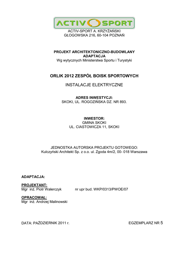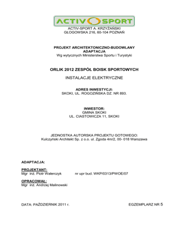 ACTIV-SPORT A. KRZYŻAŃSKI GŁOGOWSKA 216, 60-104 POZNAŃ PROJEKT ARCHITEKTONICZNO-BUDOWLANY ADAPTACJA Wg wytycznych Ministerstwa Sportu i Turystyki ORLIK 2012 ZESPÓŁ BOISK SPORTOWYCH INSTALACJE ELEKTRYCZNE ADRES INWESTYCJI: SKOKI, UL. ROGOZIŃSKA DZ. NR 893. INWESTOR: GMINA SKOKI UL. CIASTOWICZA 11, SKOKI JEDNOSTKA AUTORSKA PROJEKTU GOTOWEGO: Kulczyński Architekt Sp. z o.o. ul. Zgoda 4m/2, 00- 018 Warszawa ADAPTACJA: PROJEKTANT: Mgr inż. Piotr Walerczyk nr upr bud. WKP/0313/PWOE/07 OPRACOWAŁ: Mgr inż. Andrzej Malinowski DATA: PAŹDZIERNIK 2011 r. EGZEMPLARZ NR 5 Projekt budowlany instalacji elektrycznej zespołu boisk sportowych Orlik 2012 przy ul. Rogozińskiej dz. nr 893, w m. Skoki. SPIS TREŚCI : 1. ZAŁĄCZNIKI PROJEKTOWE 1.1. oświadczenie projektanta 1.2. kserokopia uprawnień do pełnienia samodzielnych funkcji technicznych 1.3. kserokopia aktualnego wpisu na listę członków właściwej izby samorządu zawodowego 1.4. warunki techniczne przyłączenia 2. WSTĘP 2.1. Przedmiot opracowania 2.2. Podstawa opracowania 3. OPIS TECHNICZNY 3.1. Zakres opracowania 3.2. Zasilanie elektroenergetyczne 3.3. Rozdzielnia główna RG 3.4. Instalacja zasilania opraw oświetlenia sportowego 3.5. Instalacje wewnętrzne budynku 3.6. Ochrona przeciwporażeniowa, uziemienia i ochrona przeciwprzepięciowa 3.7. Prace w pobliżu linii SN 15kV 3.8. Uwagi końcowe 4. OBLICZENIA TECHNICZNE 4.1. Obliczenia zasilania 4.2. Obliczenia oświetlenia 5. SPIS RYSUNKÓW 5.1. Mapa zasadnicza.................................................................... Rys. E1 5.2. Plan instalacji - budynek ......................................................... Rys. E2 5.3. Schemat rozdzielni RG ........................................................... Rys. E3 5.4. Schemat oświetlenia sportowego ........................................... Rys. E4 6. ZESTAWIENIE PODSTAWOWYCH MATERIAŁÓW Strona 1 Projekt budowlany instalacji elektrycznej zespołu boisk sportowych Orlik 2012 przy ul. Rogozińskiej dz. nr 893, w m. Skoki. Strona 2 OŚWIADCZENIE Zgodnie z przepisem art. 20 ust. 4 ustawy z dnia 7 lipca 1994r. Prawa budowlanego (Dz. U. nr 207 z 2003r., poz. 2016 z późniejszymi zmianami) zgodnie z art. 20 ust 4 tej ustawy oświadczam, że projekt budowlany elektryczny dotyczący: instalacji elektrycznej zespołu boisk sportowych Orlik 2012 przy ul. Rogozińskiej dz. nr 893, w m. Skoki. został sporządzony zgodnie z obowiązującymi przepisami oraz zasadami wiedzy technicznej. W załączniku przedkładam: 1. kserokopię uprawnień do pełnienia samodzielnych funkcji technicznych 2. kserokopię aktualnego wpisu na listę członków właściwej izby samorządu zawodowego podpis projektanta Projekt budowlany instalacji elektrycznej zespołu boisk sportowych Orlik 2012 przy ul. Rogozińskiej dz. nr 893, w m. Skoki. Strona 3 2. WSTĘP 2.1. Przedmiot opracowania Przedmiotem niniejszej dokumentacji jest projekt budowlany oświetlenia boiska i instalacji elektrycznej zaplecza socjalnego dla Zespołu Boisk Sportowych Orlik 2012 w m. Skoki ul. Rogozińska dz. nr 893. 2.2. Podstawa opracowania • • • • • • zlecenie inwestora projekt zagospodarowania terenu projekt architektoniczno-konstrukcyjny wytyczne branżowe obowiązujące przepisy i normy uzgodnienia niezbędne dla potrzeb projektowych 3. OPIS TECHNICZNY 3.1. Zakres opracowania • • • • • • zasilanie elektroenergetyczne rozdział energii elektrycznej instalacja oświetlenia boisk sportowych instalacje elektryczne zaplecza socjalnego ochrona od porażeń prądem elektrycznym instalacja odgromowa i uziemień Złącze kablowo-pomiarowe nie jest zakresem tego opracowania – w zakresie Enea Operator Sp. z o.o. jest projekt i wykonanie przyłącza oraz złącza kablowo-pomiarowego wraz z układem pomiarowym. 3.2. Zasilanie elektroenergetyczne Na podstawie warunków technicznych przyłączenia, w granicy działki zostanie wybudowane złącze kablowe ZKP – projekt i wykonanie w zakresie Enea Operator. W złączu zainstalowany zostanie bezpośredni układ pomiarowy oraz zabezpieczenie 63A. Moc zapotrzebowana obiektu wynosi 40kW. Z projektowanego ZKP należy wyprowadzić linię kablową YKY 4x25mm2, która będzie zasilała projektowaną rozdzielnię RG w budynku socjalnym. Szafkę RG należy zlokalizować w pomieszczeniu trenera budynku szatniowego, zgodnie z rysunkiem. Właścicielem instalacji zalicznikowej jest inwestor – Gmina Skoki. Rysunek nr E1 wskazuje wstępną lokalizację ZKP. Informację o docelowej lokalizacji należy uzyskać w Enea Operator. Ułożenie linii kablowej YKY 4x25mm2 do projektowanej szafki RG jest w zakresie niniejszego opracowania. Sposób ułożenia kabla zgodnie z pkt. 3.4. Trasę kabla wytyczyć zgodnie z rysunkiem E1. 3.3. Rozdzielnia główna RG W budynku szatniowym, należy zabudować rozdzielnię z drzwiami pełnymi zamykanymi na klucz. Wielkość rozdzielni dostosować do ilości aparatów. Rozdzielnia RG zawierać będzie rozłącznik główny, aparaty sterujące oraz zabezpieczenia różnicowoprądowe i nadmiarowe obwodów. Sterowanie oświetleniem zewnętrznym budynku będzie odbywało się automatycznie za pomocą zegara astronomicznego z możliwością przełączenia na sterowanie ręczne poprzez przełączniki załączające styczniki poszczególnych obwodów. Należy zamontować zegar astronomiczny dwukanałowy, mający możliwość dowolnego, niezależnego dla każdego kanału, nastawiania czasów załączenia i wyłączenia w funkcji zachodów Projekt budowlany instalacji elektrycznej zespołu boisk sportowych Orlik 2012 przy ul. Rogozińskiej dz. nr 893, w m. Skoki. Strona 4 i wschodów słońca. Na schemacie przedstawiono podział na grupy - sterowane kanałami zegara astronomicznego. Drugi kanał należy wykorzystać do sterowania pracą wentylacji mechanicznej. Ostateczne nastawy zegara ustalić bezpośrednio z inwestorem. Punkt PEN w rozdzielni RG należy dodatkowo uziemić (Ru≤5Ω). Oświetlenie podzi