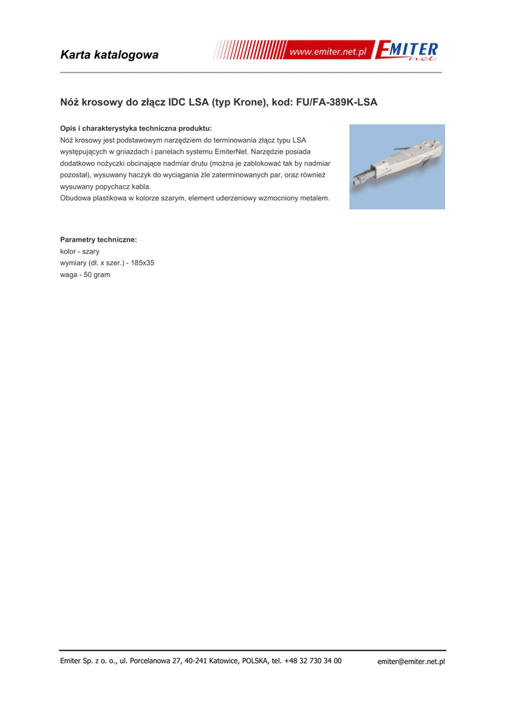 Karta katalogowa ___________________________________________________________________________ Nóż krosowy do złącz IDC LSA (typ Krone), kod: FU/FA-389K-LSA Opis i charakterystyka techniczna produktu: Nóż krosowy jest podstawowym narzędziem do terminowania złącz typu LSA występujących w gniazdach i panelach systemu EmiterNet. Narzędzie posiada dodatkowo nożyczki obcinające nadmiar drutu (można je zablokować tak by nadmiar pozostał), wysuwany haczyk do wyciągania źle zaterminowanych par, oraz również wysuwany popychacz kabla. Obudowa plastikowa w kolorze szarym, element uderzeniowy wzmocniony metalem. Parametry techniczne: kolor - szary wymiary (dł. x szer.) - 185x35 waga - 50 gram Emiter Sp. z o. o., ul. Porcelanowa 27, 40-241 Katowice, POLSKA, tel. +48 32 730 34 00 [email protected]