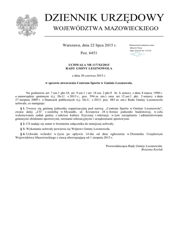 DZIENNIK URZĘDOWY WOJEWÓDZTWA MAZOWIECKIEGO Warszawa, dnia 22 lipca 2015 r. Elektronicznie podpisany przez: Sławomir Parys Data: 2015-07-22 11:57:07 Poz. 6451 UCHWAŁA NR 117/XI/2015 RADY GMINY LESZNOWOLA z dnia 30 czerwca 2015 r. w sprawie utworzenia Centrum Sportu w Gminie Lesznowola. Na podstawie art. 7 ust.1 pkt.10, art. 9 ust.1 i art. 18 ust. 2 pkt.9 lit. h ustawy z dnia 8 marca 1990 r. o samorządzie gminnym (t.j. Dz.U. z 2013 r., poz. 594 ze zm.) oraz art. 12 ust.1 pkt. 2 ustawy z dnia 27 sierpnia 2009 r. o finansach publicznych (t.j. Dz.U. z 2013, poz. 885 ze zm.) Rada Gminy Lesznowola uchwala, co następuje: § 1. Tworzy się gminną jednostkę organizacyjną pod nazwą: „Centrum Sportu w Gminie Lesznowola”, zwane dalej „CS” z siedzibą w Mysiadle, ul. Kwiatowa 28 w formie jednostki budżetowej, w celu wykonywania zadań gminy z zakresu kultury fizycznej i rekreacji, w tym zarządzanie i administrowanie gminnymi obiektami sportowymi, terenami rekreacyjnymi i urządzeniami sportowymi. § 2. CS nadaje się statut w brzmieniu załącznika do niniejszej uchwały. § 3. Wykonanie uchwały powierza się Wójtowi Gminy Lesznowola. § 4. Uchwała wchodzi w życie po upływie 14 dni od dnia ogłoszenia w Dzienniku Urzędowym Województwa Mazowieckiego z mocą obowiązującą od 1 sierpnia 2015 r. Przewodnicząca Rady Gminy Lesznowola: Bożenna Korlak Dziennik Urzędowy Województwa Mazowieckiego –2– Poz. 6451 Załącznik do Uchwały Nr 117/XI/2015 Rady Gminy Lesznowola z dnia 30 czerwca 2015 r. STATUT CENTRUM SPORTU W GMINIE LESZNOWOLA I. Postanowienia ogólne § 1. Centrum Sportu w Gminie Lesznowola zwane w dalszej części statutu „CS” działa na podstawie obowiązującego prawa, a w szczególności: 1. Ustawy z dnia 8 marca 1990 r. o samorządzie gminnym (t.j.Dz. U. z 2013 r., poz. 594 ze zm.); 2. Ustawy z dnia 27 sierpnia 2009 r. o finansach publicznych (t.j. Dz.U. z 2013 r., poz. 885 ze zm.); 3. Ustawy z dnia 25 czerwca 2010 r. o sporcie (Dz. U. Nr 127 poz. 857 z późn. zm.); 4. Niniejszego statutu. § 2. CS jest jednostką organizacyjną Gminy Lesznowola nie posiadającą osobowości prawnej, prowadzoną w formie jednostki budżetowej. § 3. Nadzór organizacyjny, merytoryczny i finansowy nad działalnością CS sprawuje Wójt i Skarbnik Gminy Lesznowola. § 4. 1. Terenem działania CS jest Gmina Lesznowola. 2. Siedziba CS mieści się w Mysiadle, ul. Kwiatowa 28. 3. CS używa pieczęci podłużnej o brzmieniu: Centrum Sportu w Gminie Lesznowola Siedziba: 05-515 Mysiadło ul. Kwiatowa 28 4. CS używa symbolu korespondencyjnego „CS”. II. Cele i zadania § 5. Celem działalności CS jest realizacja zadań Gminy Lesznowola z zakresu kultury fizycznej i rekreacji oraz zaspokajanie w tym zakresie potrzeb mieszkańców ze szczególnym uwzględnieniem potrzeb dzieci i młodzieży z terenu Gminy Lesznowola. § 6. Do zakresu działania CS należy w szczególności: 1. Administrowanie obiektami sportowymi i terenami sportowo-rekreacyjnymi znajdującymi się na terenie Gminy Lesznowola. Wykaz obiektów stanowi załącznik do niniejszego statutu; 2. Zapewnienie właściwej eksploatacji i konserwacji obiektów oraz urządzeń sportowo-rekreacyjnych; 3. Udostępnianie bazy sportowo-rekreacyjnej mieszkańcom gminy, w celu krzewienia kultury fizycznej; 4. Tworzenie oraz rozbudowa bazy sportowo-rekreacyjnej; 5. Organizowanie zajęć, zawodów oraz imprez sportowych; 6. Organizowanie imprez rekreacyjnych na rzecz mieszkańców Gminy Lesznowola; 7. Współpraca z funkcjonującymi na terenie gminy klubami sportowymi, stowarzyszeniami kultury fizycznej, fundacjami i innymi organizacjami, szczególnie organizacjami pożytku publicznego w zakresie upowszechniania kultury fizycznej; 8. Promocja gminy poprzez sport i rekreację; Dziennik Urzędowy Województwa Mazowieckiego –3– Poz. 6451 9. Wykonywanie innych zadań o charakterze sportowo-rekreacyjnym oraz zadań zleconych przez Wójta Gminy Lesznowola. III. Zarządzanie i organizacja § 7. 1. CS kieruje Dyrektor wyłoniony w drodze konkursu. 2. Dyrektora CS zatrudnia i zwalnia Wójt Gminy Lesznowola. 3. Zwierzchnikiem służbowym Dyrektora jest Wójt Gminy Lesznowola. 4. Do kompetencji Dyrektora należy w szczególności: 1) organizowanie pracy CS i reprezentowanie go na zewnątrz, 2) realizowanie i nadzorowanie statutowej działalności CS, 3) zatrudnianie i zwalnianie pracowników oraz realizowanie zadań pracodawcy wobec osób zatrudnionych, 4) opracowywanie regulaminów wewnętrznych, zarządzeń i instrukcji wewnętrznych, 5) zarządzanie i efektywne gospodarowanie powierzonym mieniem, 6) ustalanie rocznego planu działalności oraz planu finansowego jednostki, 7) ponoszenie odpowiedzialności za funkcjonowanie jednostki. § 8. 1. Strukturę organizacyjną CS przedstawia poniższy schemat: 2. Szczegółową organizację i funkcjonowanie CS określa Regulamin Organizacyjny, który opracowuje Dyrektor i przedstawia do zatwierdzenia Wójtowi Gminy Lesznowola. 3. Zasady wynagradzania i inne świadczenia wynikające ze stosunku pracy pracowników określa Regulamin Wynagradzania ustalony przez Dyrektora CS. 4. Pozostałe przepisy wewnętrzne dotyczące działalności jednostki wydaje Dyrektor w formie zarządzeń. 5. IV. Finanse i majątek § 9. 1. CS prowadzi gospodarkę finansową i rozlicza się na zasadach przewidzianych dla jednostek budżetowych. 2. Funkcjonowanie CS jest finansowane z budżetu Gminy Lesznowola do wysokości planu finansowego. 3. Podstawą gospodarki finansowej CS jest roczny plan finansowy zatwierdzony przez Wójta Gminy. 4. CS może prowadzić działalność gospodarczą nie wykraczającą poza zadania o charakterze użyteczności publicznej. § 10. 1. Majątek CS stanowi własność Gminy Lesznowola i może być wykorzystywany jedynie do celów związanych z wykonywaniem zadań statutowych CS. 2. CS posiada własny rachunek bankowy i prowadzi rachunkowość zgodnie z obowiązującymi przepisami. § 11.