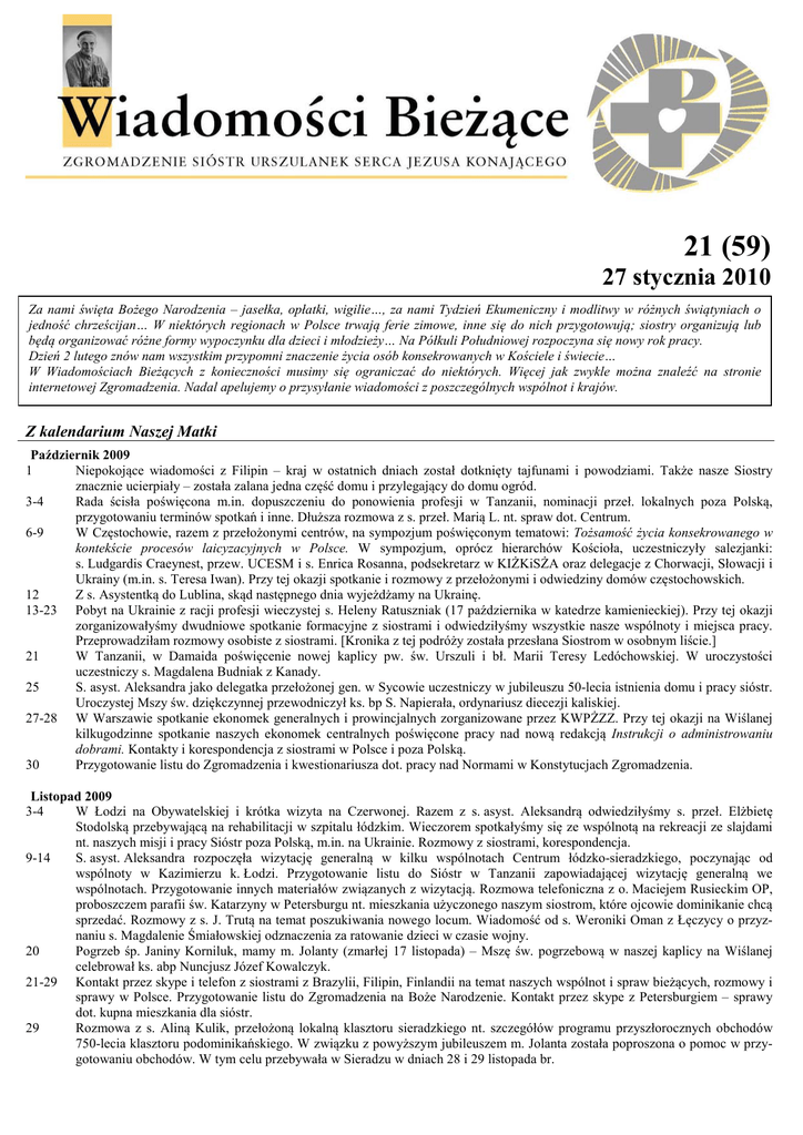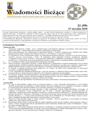 21 (59) 27 stycznia 2010 Za nami święta Bożego Narodzenia – jasełka, opłatki, wigilie…, za nami Tydzień Ekumeniczny i modlitwy w różnych świątyniach o jedność chrześcijan… W niektórych regionach w Polsce trwają ferie zimowe, inne się do nich przygotowują; siostry organizują lub będą organizować różne formy wypoczynku dla dzieci i młodzieży… Na Półkuli Południowej rozpoczyna się nowy rok pracy. Dzień 2 lutego znów nam wszystkim przypomni znaczenie życia osób konsekrowanych w Kościele i świecie… W Wiadomościach Bieżących z konieczności musimy się ograniczać do niektórych. Więcej jak zwykle można znaleźć na stronie internetowej Zgromadzenia. Nadal apelujemy o przysyłanie wiadomości z poszczególnych wspólnot i krajów. Z kalendarium Naszej Matki Październik 2009 1 Niepokojące wiadomości z Filipin – kraj w ostatnich dniach został dotknięty tajfunami i powodziami. Także nasze Siostry znacznie ucierpiały – została zalana jedna część domu i przylegający do domu ogród. 3-4 Rada ścisła poświęcona m.in. dopuszczeniu do ponowienia profesji w Tanzanii, nominacji przeł. lokalnych poza Polską, przygotowaniu terminów spotkań i inne. Dłuższa rozmowa z s. przeł. Marią L. nt. spraw dot. Centrum. 6-9 W Częstochowie, razem z przełożonymi centrów, na sympozjum poświęconym tematowi: Tożsamość życia konsekrowanego w kontekście procesów laicyzacyjnych w Polsce. W sympozjum, oprócz hierarchów Kościoła, uczestniczyły salezjanki: s. Ludgardis Craeynest, przew. UCESM i s. Enrica Rosanna, podsekretarz w KIŻKiSŻA oraz delegacje z Chorwacji, Słowacji i Ukrainy (m.in. s. Teresa Iwan). Przy tej okazji spotkanie i rozmowy z przełożonymi i odwiedziny domów częstochowskich. 12 Z s. Asystentką do Lublina, skąd następnego dnia wyjeżdżamy na Ukrainę. 13-23 Pobyt na Ukrainie z racji profesji wieczystej s. Heleny Ratuszniak (17 października w katedrze kamienieckiej). Przy tej okazji zorganizowałyśmy dwudniowe spotkanie formacyjne z siostrami i odwiedziłyśmy wszystkie nasze wspólnoty i miejsca pracy. Przeprowadziłam rozmowy osobiste z siostrami. [Kronika z tej podróży została przesłana Siostrom w osobnym liście.] 21 W Tanzanii, w Damaida poświęcenie nowej kaplicy pw. św. Urszuli i bł. Marii Teresy Ledóchowskiej. W uroczystości uczestniczy s. Magdalena Budniak z Kanady. 25 S. asyst. Aleksandra jako delegatka przełożonej gen. w Sycowie uczestniczy w jubileuszu 50-lecia istnienia domu i pracy sióstr. Uroczystej Mszy św. dziękczynnej przewodniczył ks. bp S. Napierała, ordynariusz diecezji kaliskiej. 27-28 W Warszawie spotkanie ekonomek generalnych i prowincjalnych zorganizowane przez KWPŻZZ. Przy tej okazji na Wiślanej kilkugodzinne spotkanie naszych ekonomek centralnych poświęcone pracy nad nową redakcją Instrukcji o administrowaniu dobrami. Kontakty i korespondencja z siostrami w Polsce i poza Polską. 30 Przygotowanie listu do Zgromadzenia i kwestionariusza dot. pracy nad Normami w Konstytucjach Zgromadzenia. Listopad 2009 3-4 W Łodzi na Obywatelskiej i krótka wizyta na Czerwonej. Razem z s. asyst. Aleksandrą odwiedziłyśmy s. przeł. Elżbietę Stodolską przebywającą na rehabilitacji w szpitalu łódzkim. Wieczorem spotkałyśmy się ze wspólnotą na rekreacji ze slajdami nt. naszych misji i pracy Sióstr poza Polską, m.in. na Ukrainie. Rozmowy z siostrami, korespondencja. 9-14 S. asyst. Aleksandra rozpoczęła wizytację generalną w kilku wspólnotach Centrum łódzko-sieradzkiego, poczynając od wspólnoty w Kazimierzu k. Łodzi. Przygotowanie listu do Sióstr w Tanzanii zapowiadającej wizytację generalną we wspólnotach. Przygotowanie innych materiałów związanych z wizytacją. Rozmowa telefoniczna z o. Maciejem Rusieckim OP, proboszczem parafii św. Katarzyny w Petersburgu nt. mieszkania użyczonego naszym siostrom, które ojcowie dominikanie chcą sprzedać. Rozmowy z s. J. Trutą na temat poszukiwania nowego locum. Wiadomość od s. Weroniki Oman z Łęczycy o przyznaniu s. Magdalenie Śmiałowskiej odznaczenia za ratowanie dzieci w czasie wojny. 20 Pogrzeb śp. Janiny Korniluk, mamy m. Jolanty (zmarłej 17 listopada) – Mszę św. pogrzebową w naszej kaplicy na Wiślanej celebrował ks. abp Nuncjusz Józef Kowalczyk. 21-29 Kontakt przez skype i telefon z siostrami z Brazylii, Filipin, Finlandii na temat naszych wspólnot i spraw bieżących, rozmowy i sprawy w Polsce. Przygotowanie listu do Zgromadzenia na Boże Narodzenie. Kontakt przez skype z Petersburgiem – sprawy dot. kupna mieszkania dla sióstr. 29 Rozmowa z s. Aliną Kulik, przełożoną lokalną klasztoru sieradzkiego nt. szczegółów programu przyszłorocznych obchodów 750-lecia klasztoru podominikańskiego. W związku z powyższym jubileuszem m. Jolanta została poproszona o pomoc w przygotowaniu obchodów. W tym celu przebywała w Sieradzu w dniach 28 i 29 listopada br. Grudzień 2009 2 Po rozmowach z siostrami decyzja o powrocie s. Ewy Czerniej w najbliższym czasie do Europy (względy zdrowotne). 3 Uczestniczymy w prezentacji albumu o Nuncjaturze Apostolskiej w Polsce z okazji 20-lecia istnienia nuncjatury. Spotkanie odbyło się w sali arcybiskupa warszawskiego z udziałem Księdza Nuncjusza, Księdza Prymasa, biskupów, premiera T. Mazowieckiego, Rektora KUL ks. prof. S. Wilka i wielu innych osób zaproszonych na tę uroczystość. W przygotowaniu albumu miała wielki udział s. Ewa Bońkowska, natomiast tłumaczeniem na język włoski zajęła się s. Jana Brzozowska. 4 Rozmowa via internet z s. przeł. Claudete nt. spraw Centrum brazylijskiego i planów związanych ze wspólnotą w Juinie. Kontakt z Siostrami w Boliwii – pewne nadzieje na znalezienie pracy w ośrodkach wychowawczych lub w szkole dla s. Grażyny M. 6 List do ks. bpa P. Pezzi w Moskwie z prośbą o poparcie naszej prośby do dyrekcji „Zespołu Pomocy Kościołowi na Wschodzie” o otrzymanie wsparcia finansowego dla za