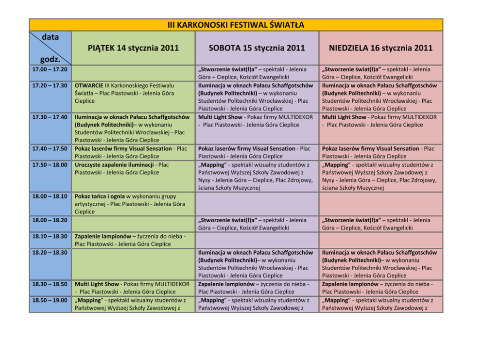 III KARKONOSKI FESTIWAL ŚWIATŁA data PIĄTEK 14 stycznia 2011 SOBOTA 15 stycznia 2011 NIEDZIELA 16 stycznia 2011 „Stworzenie świat(ł)a” – spektakl - Jelenia Góra – Cieplice, Kościół Ewangelicki Iluminacja w oknach Pałacu Schaffgotschów (Budynek Politechniki) – w wykonaniu Studentów Politechniki Wrocławskiej - Plac Piastowski - Jelenia Góra Cieplice Multi Light Show - Pokaz firmy MULTIDEKOR - Plac Piastowski - Jelenia Góra Cieplice „Stworzenie świat(ł)a” – spektakl - Jelenia Góra – Cieplice, Kościół Ewangelicki Iluminacja w oknach Pałacu Schaffgotschów (Budynek Politechniki) – w wykonaniu Studentów Politechniki Wrocławskiej - Plac Piastowski - Jelenia Góra Cieplice Multi Light Show - Pokaz firmy MULTIDEKOR - Plac Piastowski - Jelenia Góra Cieplice Pokaz laserów firmy Visual Sensation - Plac Piastowski - Jelenia Góra Cieplice „Mapping” - spektakl wizualny studentów z Państwowej Wyższej Szkoły Zawodowej z Nysy - Jelenia Góra – Cieplice, Plac Zdrojowy, ściana Szkoły Muzycznej Pokaz laserów firmy Visual Sensation - Plac Piastowski - Jelenia Góra Cieplice „Mapping” - spektakl wizualny studentów z Państwowej Wyższej Szkoły Zawodowej z Nysy - Jelenia Góra – Cieplice, Plac Zdrojowy, ściana Szkoły Muzycznej „Stworzenie świat(ł)a” – spektakl - Jelenia Góra – Cieplice, Kościół Ewangelicki „Stworzenie świat(ł)a” – spektakl - Jelenia Góra – Cieplice, Kościół Ewangelicki Iluminacja w oknach Pałacu Schaffgotschów (Budynek Politechniki)– w wykonaniu Studentów Politechniki Wrocławskiej - Plac Piastowski - Jelenia Góra Cieplice Zapalenie lampionów – życzenia do nieba Plac Piastowski - Jelenia Góra Cieplice „Mapping” - spektakl wizualny studentów z Państwowej Wyższej Szkoły Zawodowej z Iluminacja w oknach Pałacu Schaffgotschów (Budynek Politechniki)– w wykonaniu Studentów Politechniki Wrocławskiej - Plac Piastowski - Jelenia Góra Cieplice Zapalenie lampionów – życzenia do nieba Plac Piastowski - Jelenia Góra Cieplice „Mapping” - spektakl wizualny studentów z Państwowej Wyższej Szkoły Zawodowej z godz. 17.00 – 17.20 17.20 – 17.30 OTWARCIE III Karkonoskiego Festiwalu Światła – Plac Piastowski - Jelenia Góra Cieplice 17.30 – 17.40 Iluminacja w oknach Pałacu Schaffgotschów (Budynek Politechniki)– w wykonaniu Studentów Politechniki Wrocławskiej - Plac Piastowski - Jelenia Góra Cieplice Pokaz laserów firmy Visual Sensation - Plac Piastowski - Jelenia Góra Cieplice Uroczyste zapalenie iluminacji - Plac Piastowski - Jelenia Góra Cieplice 17.40 – 17.50 17.50 – 18.00 18.00 – 18.10 Pokaz tańca i ognia w wykonaniu grupy artystycznej - Plac Piastowski - Jelenia Góra Cieplice 18.00 – 18.20 18.10 – 18.30 Zapalenie lampionów – życzenia do nieba Plac Piastowski - Jelenia Góra Cieplice 18.20 – 18.30 18.30 – 18.50 18.50 – 19.00 Multi Light Show - Pokaz firmy MULTIDEKOR - Plac Piastowski - Jelenia Góra Cieplice „Mapping” - spektakl wizualny studentów z Państwowej Wyższej Szkoły Zawodowej z 19.00 – 19.20 Nysy - Jelenia Góra – Cieplice, Plac Zdrojowy, ściana Szkoły Muzycznej „Stworzenie świat(ł)a” – spektakl - Jelenia Góra – Cieplice, Kościół Ewangelicki 19.10 – 19.20 19.20 – 19.30 19.30 – 19.40 Iluminacja w oknach Pałacu Schaffgotschów (Budynek Politechniki)– Plac Piastowski Jelenia Góra Cieplice Multi Light Show - Pokaz firmy MULTIDEKOR - Plac Piastowski - Jelenia Góra Cieplice 19.40 – 19.50 19.50 – 20.00 Nysy - Jelenia Góra – Cieplice, Plac Zdrojowy, ściana Szkoły Muzycznej „Stworzenie świat(ł)a” – spektakl - Jelenia Góra – Cieplice, Kościół Ewangelicki Multi Light Show - Pokaz firmy MULTIDEKOR - Plac Piastowski - Jelenia Góra Cieplice Iluminacja w oknach Pałacu Schaffgotschów (Budynek Politechniki)– Plac Piastowski Jelenia Góra Cieplice „Teatr ognia” - występ grupy Anstis „Mapping” - spektakl wizualny studentów z Państwowej Wyższej Szkoły Zawodowej z Nysy - Jelenia Góra – Cieplice, Plac Zdrojowy, ściana Szkoły Muzycznej Pokaz laserów firmy Visual Sensation - Plac Piastowski - Jelenia Góra Cieplice „Mapping” - spektakl wizualny studentów z Państwowej Wyższej Szkoły Zawodowej z Nysy - Jelenia Góra – Cieplice, Plac Zdrojowy, ściana Szkoły Muzycznej „Stworzenie świat(ł)a” - spektakl - Jelenia Góra – Cieplice, Kościół Ewangelicki „Stworzenie świat(ł)a” - spektakl - Jelenia Góra – Cieplice, Kościół Ewangelicki 20.00 – 20.10 20.00 – 20.20 20.10 – 20.20 20.20 – 20.30 20.30 – 20.40 20.40 20.50 – 21.00 Pokaz laserów firmy Visual Sensation - Plac Piastowski - Jelenia Góra Cieplice Iluminacja w oknach Pałacu Schaffgotschów (Budynek Politechniki) – w wykonaniu Studentów Politechniki Wrocławskiej Plac Piastowski - Jelenia Góra Cieplice Multi Light Show - Pokaz firmy MULTIDEKOR - Plac Piastowski - Jelenia Góra Cieplice Iluminacja w oknach Pałacu Schaffgotschów (Budynek Politechniki) – w wykonaniu Studentów Politechniki Wrocławskiej Plac Piastowski - Jelenia Góra Cieplice Multi Light Show - Pokaz firmy MULTIDEKOR - Plac Piastowski - Jelenia Góra Cieplice „Mapping” - spektakl wizualny studentów z Państwowej Wyższej Szkoły Zawodowej z Nysy - Jelenia Góra – Cieplice, Plac Zdrojowy, ściana Szkoły Muzycznej „Mapping” - spektakl wizualny studentów z Państwowej Wyższej Szkoły Zawodowej z Nysy - Jelenia Góra – Cieplice, Plac Zdrojowy, ściana Szkoły Muzycznej Nysy - Jelenia Góra – Cieplice, Plac Zdrojowy, ściana Szkoły Muzycznej „Stworzenie świat(ł)a” – spektakl - Jelenia Góra – Cieplice, Kościół Ewangelicki Iluminacja w oknach Pałacu Schaffgotschów (Budynek Politechniki)– Plac Piastowski Jelenia Góra Cieplice Multi Light Show - Pokaz firmy MULTIDEKOR - Plac Piastowski - Jelenia Góra Cieplice „Mapping” - spektakl wizualny studentów z Państwowej Wyższej 