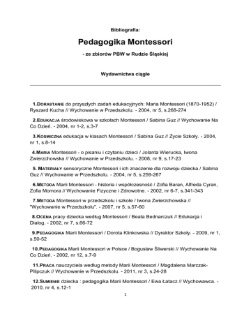 Bibliografia: Pedagogika Montessori - ze zbiorów PBW w Rudzie Śląskiej Wydawnictwa ciągłe 1.DORASTANIE do przyszłych zadań edukacyjnych: Maria Montessori (1870-1952) / Ryszard Kucha // Wychowanie w Przedszkolu. - 2004, nr 5, s.268-274 2.EDUKACJA środowiskowa w szkołach Montessori / Sabina Guz // Wychowanie Na Co Dzień. - 2004, nr 1-2, s.3-7 3.KOSMICZNA edukacja w klasach Montessori / Sabina Guz // Życie Szkoły. - 2004, nr 1, s.8-14 4.MARIA Montessori - o pisaniu i czytaniu dzieci / Jolanta Wierucka, Iwona Zwierzchowska // Wychowanie w Przedszkolu. - 2008, nr 9, s.17-23 5. MATERIAŁY sensoryczne Montessori i ich znaczenie dla rozwoju dziecka / Sabina Guz // Wychowanie w Przedszkolu. - 2004, nr 5, s.259-267 6.METODA Marii Montessori - historia i współczesność / Zofia Baran, Alfreda Cyran, Zofia Momora // Wychowanie Fizyczne i Zdrowotne. - 2002, nr 6-7, s.341-343 7.METODA Montessori w przedszkolu i szkole / Iwona Zwierzchowska // "Wychowanie w Przedszkolu". - 2007, nr 5, s.57-60 8.OCENA pracy dziecka według Montessori / Beata Bednarczuk // Edukacja i Dialog. - 2002, nr 7, s.66-72 9.PEDAGOGIKA Marii Montessori / Dorota Klinkowska // Dyrektor Szkoły. - 2009, nr 1, s.50-52 10.PEDAGOGIKA Marii Montessori w Polsce / Bogusław Śliwerski // Wychowanie Na Co Dzień. - 2002, nr 12, s.7-9 11.PRACA nauczyciela według metody Marii Montessori / Magdalena MarczakPilipczuk // Wychowanie w Przedszkolu. - 2011, nr 3, s.24-28 12.SUMIENIE dziecka : pedagogika Marii Montessori / Ewa Łatacz // Wychowawca. 2010, nr 4, s.12-1 1 Wydawnictwa zwarte 1.DOMY dziecięce : metoda pedagogiki naukowej stosowana w wychowaniu najmłodszych dzieci / Maria Montessori. - Warszawa : "Żak", 2005 Sygnatura: 38936-czyt. 2.DZIECKO w klasie Montessori : odniesienia teoretyczne i praktyczne / Beata Bednarczuk. - Lublin : Wydawnictwo Uniwersytetu Marii Curie-Skłodowskiej, 2007 Sygnatura: 40444 3.EDUKACJA w systemie Montessori : podręcznik dla nauczycieli i studentów. T.1. Lublin : : Wydawnictwo Uniwersytetu Marii Curie-Skłodowskiej, 1998 Sygnatura: 36945/I-czyt. 4.EDUKACJA w systemie Montessori : podręcznik dla nauczycieli i studentów. T.2. Lublin : : Wydawnictwo Uniwersytetu Marii Curie-Skłodowskiej, 1998 Sygnatura: 36945/II-czyt. 5.MARIA Montessori-poszukiwanie życia razem z dziećmi : odpowiedzi na aktualne pytania pedagogiczne / Horst Klaus Berg. - Kielce : Wyd."Jedność", 2007 Sygnatura: 39702 6.METODA Montessori w przedszkolu i szkole : kształcenie i osiągnięcia dzieci / Sabina Guz. - Lublin : Wydawnictwo Uniwersytetu Marii Curie-Skłodowskiej, 2006 Sygnatura: 39510 7.ODKRYJMY Montessori raz jeszcze... : program wychowana przedszkolnego opracowany na podstawie założeń pedagogiki Marii Montessori w Przedszkolu Miejskim nr 106 w Łodzi / Anetta Albinowska, Renata Czekalska, Aleksandra Gaj i in.. - Kraków : Oficyna Wydawnicza "Impuls", 2008 Sygnatura: 40232 8.PEDAGOGIKA Marii Montessori w przedszkolu / Ulrich Steenberg. - Kielce : "Jedność Herder", 2003 Sygnatura: 38114 9.PEDAGOGIKA Montessori w przedszkolu i szkole / Kristina Skjöld Wennerström, Mari Bröderman Smeds. - Kraków : "Impuls", 2007 Sygnatura: 39674 2 10.POMÓŻ mi zrobić to samemu : jak wykorzystać idee Marii Montessori we współczesności / Gabriela Badura-Strzelczyk. - Kraków : "Impuls", 1998 Sygnatura: 35755 11.SZKOŁA Marii Montessori : historia i współczesność: z doświadczeń szkoły w Stanach Zjednoczonych / Anna Łukaniuk-Quintanilla. - Kraków : "ESPERO", 1998 Sygnatura: 35273 Sygnatura: 35274-czyt. 12.TEORIA i praktyka pedagogiki Marii Montessori w szkole podstawowej / Barbara Stein. - Kielce : JEDNOŚĆ, 2003 Sygnatura: 38112 13.WSPÓŁCZESNE tendencje w nauczaniu inspirowane metodami M. Montessori, C. Freineta i R. Steinera : na przykładzie jednej ze szkół społecznych w Gdańsku / Magdalena Szuksta, Maria Mendel. - Płock : Iwanowski, 1995 Sygnatura: 33881 Sygnatura: 33723 Sygnatura: 33724 Sygnatura: 33725-czyt. 14.ZROZUMIEĆ Montessori : czyli Maria Montessori o wychowaniu dziecka / Małgorzata Miksza. - Kraków : "Impuls", 1998 Sygnatura: 35118 Sygnatura: 35119-czyt. 3