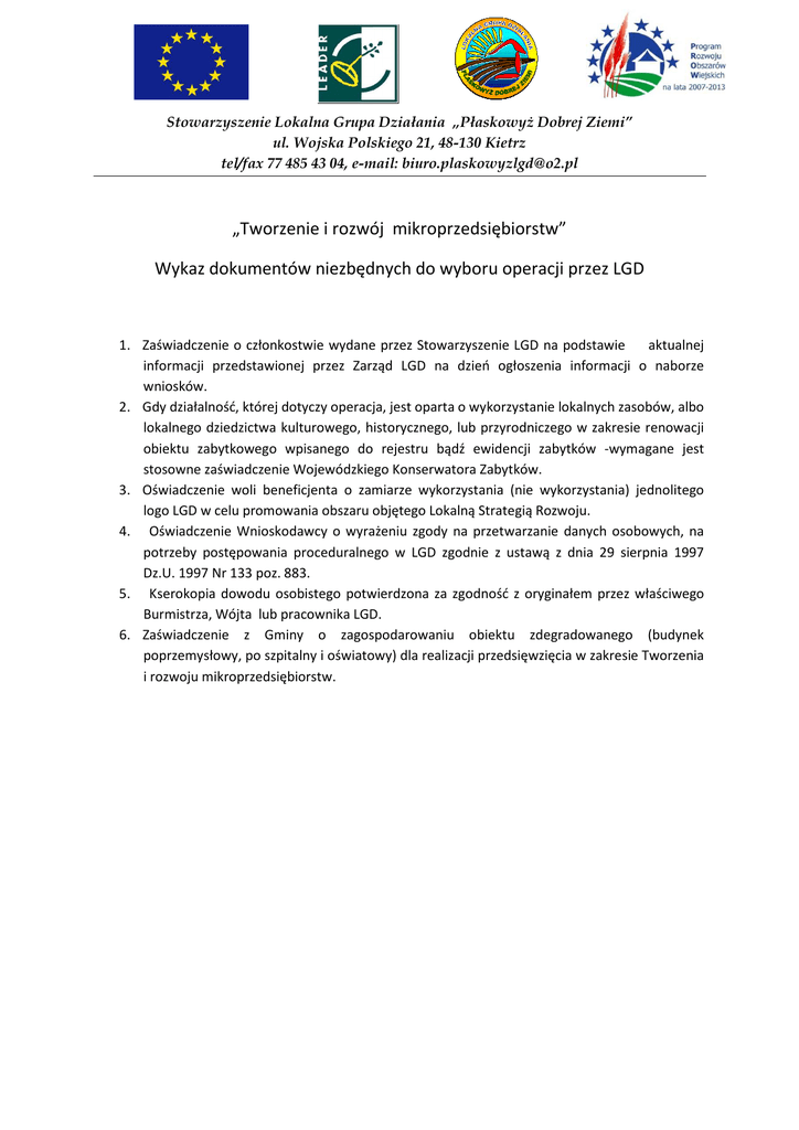 Stowarzyszenie Lokalna Grupa Działania „PłaskowyŜ Dobrej Ziemi” ul. Wojska Polskiego 21, 48-130 Kietrz tel/fax 77 485 43 04, e-mail: [email protected] „Tworzenie i rozwój mikroprzedsiębiorstw” Wykaz dokumentów niezbędnych do wyboru operacji przez LGD 1. Zaświadczenie o członkostwie wydane przez Stowarzyszenie LGD na podstawie aktualnej informacji przedstawionej przez Zarząd LGD na dzień ogłoszenia informacji o naborze wniosków. 2. Gdy działalność, której dotyczy operacja, jest oparta o wykorzystanie lokalnych zasobów, albo lokalnego dziedzictwa kulturowego, historycznego, lub przyrodniczego w zakresie renowacji obiektu zabytkowego wpisanego do rejestru bądź ewidencji zabytków -wymagane jest stosowne zaświadczenie Wojewódzkiego Konserwatora Zabytków. 3. Oświadczenie woli beneficjenta o zamiarze wykorzystania (nie wykorzystania) jednolitego logo LGD w celu promowania obszaru objętego Lokalną Strategią Rozwoju. 4. Oświadczenie Wnioskodawcy o wyrażeniu zgody na przetwarzanie danych osobowych, na potrzeby postępowania proceduralnego w LGD zgodnie z ustawą z dnia 29 sierpnia 1997 Dz.U. 1997 Nr 133 poz. 883. 5. Kserokopia dowodu osobistego potwierdzona za zgodność z oryginałem przez właściwego Burmistrza, Wójta lub pracownika LGD. 6. Zaświadczenie z Gminy o zagospodarowaniu obiektu zdegradowanego (budynek poprzemysłowy, po szpitalny i oświatowy) dla realizacji przedsięwzięcia w zakresie Tworzenia i rozwoju mikroprzedsiębiorstw.