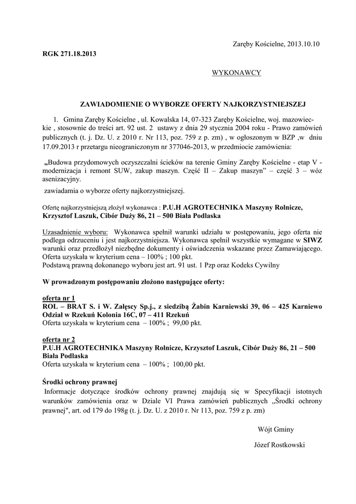 Zaręby Kościelne, 2013.10.10 RGK 271.18.2013 WYKONAWCY ZAWIADOMIENIE O WYBORZE OFERTY NAJKORZYSTNIEJSZEJ 1. Gmina Zaręby Kościelne , ul. Kowalska 14, 07-323 Zaręby Kościelne, woj. mazowieckie , stosownie do treści art. 92 ust. 2 ustawy z dnia 29 stycznia 2004 roku - Prawo zamówień publicznych (t. j. Dz. U. z 2010 r. Nr 113, poz. 759 z p. zm) , w ogłoszonym w BZP ,w dniu 17.09.2013 r przetargu nieograniczonym nr 377046-2013, w przedmiocie zamówienia: „Budowa przydomowych oczyszczalni ścieków na terenie Gminy Zaręby Kościelne - etap V modernizacja i remont SUW, zakup maszyn. Część II – Zakup maszyn” – część 3 – wóz asenizacyjny. zawiadamia o wyborze oferty najkorzystniejszej. Ofertę najkorzystniejszą złoŜył wykonawca : P.U.H AGROTECHNIKA Maszyny Rolnicze, Krzysztof Laszuk, Cibór DuŜy 86, 21 – 500 Biała Podlaska Uzasadnienie wyboru: Wykonawca spełnił warunki udziału w postępowaniu, jego oferta nie podlega odrzuceniu i jest najkorzystniejsza. Wykonawca spełnił wszystkie wymagane w SIWZ warunki oraz przedłoŜył niezbędne dokumenty i oświadczenia wskazane przez Zamawiającego. Oferta uzyskała w kryterium cena – 100% ; 100 pkt. Podstawą prawną dokonanego wyboru jest art. 91 ust. 1 Pzp oraz Kodeks Cywilny W prowadzonym postępowaniu złoŜono następujące oferty: oferta nr 1 ROL – BRAT S. i W. Załęscy Sp.j., z siedzibą śabin Karniewski 39, 06 – 425 Karniewo Odział w Rzekuń Kolonia 16C, 07 – 411 Rzekuń Oferta uzyskała w kryterium cena – 100% ; 99,00 pkt. oferta nr 2 P.U.H AGROTECHNIKA Maszyny Rolnicze, Krzysztof Laszuk, Cibór DuŜy 86, 21 – 500 Biała Podlaska Oferta uzyskała w kryterium cena – 100% ; 100,00 pkt. Środki ochrony prawnej Informacje dotyczące środków ochrony prawnej znajdują się w Specyfikacji istotnych warunków zamówienia oraz w Dziale VI Prawa zamówień publicznych „Środki ochrony prawnej", art. od 179 do 198g (t. j. Dz. U. z 2010 r. Nr 113, poz. 759 z p. zm) Wójt Gminy Józef Rostkowski