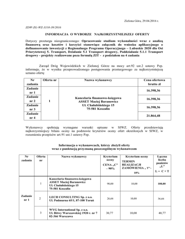 Zielona Góra, 29.04.2016 r. ZDW-ZG-WZ-3310-39/2016 INFORMACJA O WYBORZE NAJKORZYSTNIEJSZEJ OFERTY Dotyczy przetargu nieograniczonego: Opracowanie studium wykonalności wraz z analizą finansową oraz kosztów i korzyści stanowiące załącznik do wniosku aplikacyjnego o dofinansowanie inwestycji z Regionalnego Programu Operacyjnego – Lubuskie 2020 dla Osi Priorytetowej 5. Transport, Działanie 5.1 Transport drogowy, Poddziałanie 5.1.1 Transport drogowy - projekty realizowane poza formułą ZIT - z podziałem na 4 zadania Zarząd Dróg Wojewódzkich w Zielonej Górze na mocy art.92 ust.2 ustawy Pzp. informuje, że w wyniku przeprowadzonego postępowania przetargowego za najkorzystniejszą uznano ofertę Nr zadania Zadanie nr 1 Zadanie nr 2 Zadanie nr 3 Zadanie nr 4 Oferta nr Nazwa wykonawcy Cena ofertowa brutto zł 16.398,36 1 Kancelaria finansowo-księgowa ASSET Maciej Baranowicz Ul. Chałubińskiego 15 75-581 Koszalin 16.398,36 16.398,36 21.864,48 Wykonawcy spełniają wymagane warunki opisane w SIWZ. Oferty przedstawiają najkorzystniejszy bilans oceny na podstawie kryteriów oceny ofert określonych w SIWZ, w rozumieniu przepisów art.91 ust.1 ustawy Pzp. Informacja o wykonawcach, którzy złożyli oferty wraz z punktacją przyznaną poszczególnym wykonawcom Nr zadania Oferta nr Nazwa wykonawcy Kryterium oceny CENA „C” – 90% Kryterium oceny TERMIN REALIZACJI ZAMÓWIENIA „ T”– 10% Zadanie nr 1 Łączna liczba punktów „L” L= C+T 1 Kancelaria finansowo-księgowa ASSET Maciej Baranowicz Ul. Chałubińskiego 15 75-581 Koszalin 90,00 10,00 100,00 2 LECH CONSULTING Sp. z o.o. Ul. Podmurna 65/1, 87-100 Toruń 26,66 10,00 36,66 3 WYG International Sp. z o.o. Ul. Bitwy Warszawskiej 1920 r. nr 7 02-366 Warszawa 30,77 10,00 40,77 Kancelaria VIP Sp. z o.o. Ul. Metalowa 4 pok. 301 10-603 Olsztyn 4 5 Pracownia Projektowa Archidrog Witold Orczyński Ul. Grunwaldzka 21, 60-783 Poznań 67,79 10,00 77,79 6 WROCONSULT Sp. z o.o. Ul. Siedlecka 26, 54-101 Wrocław 40,81 10,00 50,81 90,00 10,00 100,00 24,10 10,00 34,10 30,77 10,00 40,77 1 2 Zadanie nr 2 3 4 5 6 1 Zadanie nr 3 2 3 4 5 6 1 Zadanie nr 4 Wykonawca wykluczony, oferta uznana za odrzuconą Kancelaria finansowo-księgowa ASSET Maciej Baranowicz Ul. Chałubińskiego 15 75-581 Koszalin LECH CONSULTING Sp. z o.o. Ul. Podmurna 65/1, 87-100 Toruń WYG International Sp. z o.o. Ul. Bitwy Warszawskiej 1920 r. nr 7 02-366 Warszawa Kancelaria VIP Sp. z o.o. Ul. Metalowa 4 pok. 301 10-603 Olsztyn Pracownia Projektowa Archidrog Witold Orczyński Ul. Grunwaldzka 21, 60-783 Poznań WROCONSULT Sp. z o.o. Ul. Siedlecka 26, 54-101 Wrocław Kancelaria finansowo-księgowa ASSET Maciej Baranowicz Ul. Chałubińskiego 15 75-581 Koszalin LECH CONSULTING Sp. z o.o. Ul. Podmurna 65/1, 87-100 Toruń WYG International Sp. z o.o. Ul. Bitwy Warszawskiej 1920 r. nr 7 02-366 Warszawa Kancelaria VIP Sp. z o.o. Ul. Metalowa 4 pok. 301, 10-603 Olsztyn Pracownia Projektowa Archidrog Witold Orczyński Ul. Grunwaldzka 21, 60-783 Poznań WROCONSULT Sp. z o.o. Ul. Siedlecka 26, 54-101 Wrocław Kancelaria finansowo-księgowa ASSET Maciej Baranowicz Ul. Chałubińskiego 15 75-581 Koszalin Wykonawca wykluczony, oferta uznana za odrzuconą 61,85 10,00 71,85 45,45 10,00 55,45 90,00 10,00 100,00 28,57 10,00 38,57 30,77 5,00 35,77 Wykonawca wykluczony, oferta uznana za odrzuconą 73,61 10,00 83,61 51,28 10,00 61,28 90,00 10,00 100,00 2 LECH CONSULTING Sp. z o.o. Ul. Podmurna 65/1, 87-100 Toruń 29,63 10,00 39,63 3 WYG International Sp. z o.o. Ul. Bitwy Warszawskiej 1920 r. nr 7 02-366 Warszawa 30,77 5,00 35,77 4 Kancelaria VIP Sp. z o.o. Ul. Metalowa 4 pok. 301, 10-603 Olsztyn Wykonawca wykluczony, oferta uznana za odrzuconą 5 6 Pracownia Projektowa Archidrog Witold Orczyński Ul. Grunwaldzka 21, 60-783 Poznań 75,47 10,00 85,47 WROCONSULT Sp. z o.o. Ul. Siedlecka 26, 54-101 Wrocław 37,03 10,00 47,03 Za udział w postępowaniu dziękujemy Podpisano: Z -ca Dyrektora ds. Inwestycyjnych Paweł Tonder