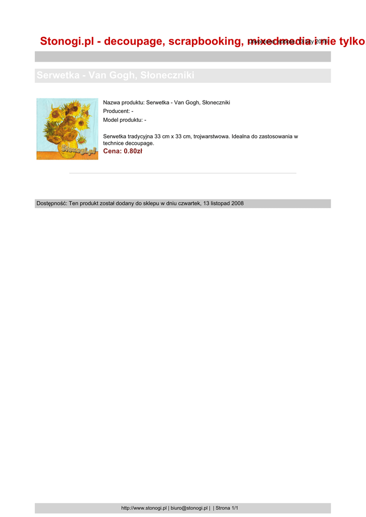 Utworzono: sobota, 13 luty i2016 Stonogi.pl - decoupage, scrapbooking, mixedmedia nie tylko. Serwetka - Van Gogh, Słoneczniki Nazwa produktu: Serwetka - Van Gogh, Słoneczniki Producent: Model produktu: Serwetka tradycyjna 33 cm x 33 cm, trojwarstwowa. Idealna do zastosowania w technice decoupage. Cena: 0.80zł Dostępność: Ten produkt został dodany do sklepu w dniu czwartek, 13 listopad 2008 http://www.stonogi.pl | [email protected] | | Strona 1/1