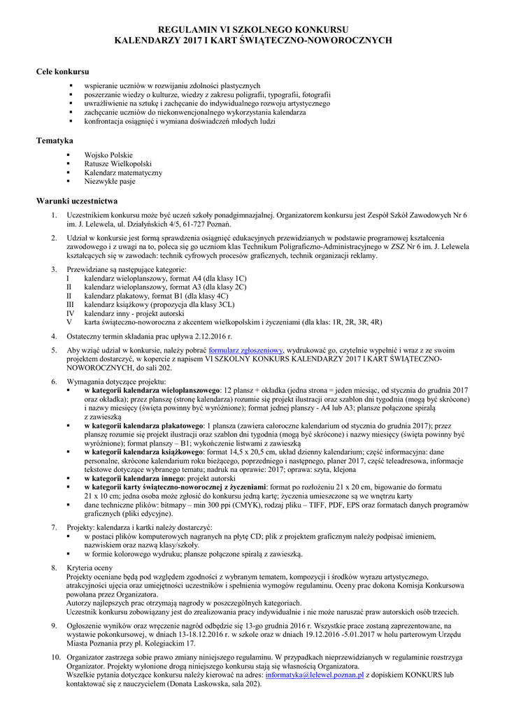 REGULAMIN VI SZKOLNEGO KONKURSU KALENDARZY 2017 I KART ŚWIĄTECZNO-NOWOROCZNYCH Cele konkursu wspieranie uczniów w rozwijaniu zdolności plastycznych poszerzanie wiedzy o kulturze, wiedzy z zakresu poligrafii, typografii, fotografii uwrażliwienie na sztukę i zachęcanie do indywidualnego rozwoju artystycznego zachęcanie uczniów do niekonwencjonalnego wykorzystania kalendarza konfrontacja osiągnięć i wymiana doświadczeń młodych ludzi Tematyka Wojsko Polskie Ratusze Wielkopolski Kalendarz matematyczny Niezwykłe pasje Warunki uczestnictwa 1. Uczestnikiem konkursu może być uczeń szkoły ponadgimnazjalnej. Organizatorem konkursu jest Zespół Szkół Zawodowych Nr 6 im. J. Lelewela, ul. Działyńskich 4/5, 61-727 Poznań. 2. Udział w konkursie jest formą sprawdzenia osiągnięć edukacyjnych przewidzianych w podstawie programowej kształcenia zawodowego i z uwagi na to, poleca się go uczniom klas Technikum Poligraficzno-Administracyjnego w ZSZ Nr 6 im. J. Lelewela kształcących się w zawodach: technik cyfrowych procesów graficznych, technik organizacji reklamy. 3. Przewidziane są następujące kategorie: I kalendarz wieloplanszowy, format A4 (dla klasy 1C) II kalendarz wieloplanszowy, format A3 (dla klasy 2C) II kalendarz plakatowy, format B1 (dla klasy 4C) III kalendarz książkowy (propozycja dla klasy 3CL) IV kalendarz inny - projekt autorski V karta świąteczno-noworoczna z akcentem wielkopolskim i życzeniami (dla klas: 1R, 2R, 3R, 4R) 4. Ostateczny termin składania prac upływa 2.12.2016 r. 5. Aby wziąć udział w konkursie, należy pobrać formularz zgłoszeniowy, wydrukować go, czytelnie wypełnić i wraz z ze swoim projektem dostarczyć, w kopercie z napisem VI SZKOLNY KONKURS KALENDARZY 2017 I KART ŚWIĄTECZNONOWOROCZNYCH, do sali 202. 6. Wymagania dotyczące projektu: w kategorii kalendarza wieloplanszowego: 12 plansz + okładka (jedna strona = jeden miesiąc, od stycznia do grudnia 2017 oraz okładka); przez planszę (stronę kalendarza) rozumie się projekt ilustracji oraz szablon dni tygodnia (mogą być skrócone) i nazwy miesięcy (święta powinny być wyróżnione); format jednej planszy - A4 lub A3; plansze połączone spiralą z zawieszką w kategorii kalendarza plakatowego: 1 plansza (zawiera całoroczne kalendarium od stycznia do grudnia 2017); przez planszę rozumie się projekt ilustracji oraz szablon dni tygodnia (mogą być skrócone) i nazwy miesięcy (święta powinny być wyróżnione); format planszy – B1; wykończenie listwami z zawieszką w kategorii kalendarza książkowego: format 14,5 x 20,5 cm, układ dzienny kalendarium; część informacyjna: dane personalne, skrócone kalendarium roku bieżącego, poprzedniego i następnego, planer 2017, część teleadresowa, informacje tekstowe dotyczące wybranego tematu; nadruk na oprawie: 2017; oprawa: szyta, klejona w kategorii kalendarza innego: projekt autorski w kategorii karty świąteczno-noworocznej z życzeniami: format po rozłożeniu 21 x 20 cm, bigowanie do formatu 21 x 10 cm; jedna osoba może zgłosić do konkursu jedną kartę; życzenia umieszczone są we wnętrzu karty dane techniczne plików: bitmapy – min 300 ppi (CMYK), rodzaj pliku – TIFF, PDF, EPS oraz formatach danych programów graficznych (pliki edycyjne). 7. Projekty: kalendarza i kartki należy dostarczyć: w postaci plików komputerowych nagranych na płytę CD; plik z projektem graficznym należy podpisać imieniem, nazwiskiem oraz nazwą klasy/szkoły. w formie kolorowego wydruku; plansze połączone spiralą z zawieszką. 8. Kryteria oceny Projekty oceniane będą pod względem zgodności z wybranym tematem, kompozycji i środków wyrazu artystycznego, atrakcyjności ujęcia oraz umiejętności uczestników i spełnienia wymogów regulaminu. Oceny prac dokona Komisja Konkursowa powołana przez Organizatora. Autorzy najlepszych prac otrzymają nagrody w poszczególnych kategoriach. Uczestnik konkursu zobowiązany jest do zrealizowania pracy indywidualnie i nie może naruszać praw autorskich osób trzecich. 9. Ogłoszenie wyników oraz wręczenie nagród odbędzie się 13-go grudnia 2016 r. Wszystkie prace zostaną zaprezentowane, na wystawie pokonkursowej, w dniach 13-18.12.2016 r. w szkole oraz w dniach 19.12.2016 -5.01.2017 w holu parterowym Urzędu Miasta Poznania przy pl. Kolegiackim 17. 10. Organizator zastrzega sobie prawo zmiany niniejszego regulaminu. W przypadkach nieprzewidzianych w regulaminie rozstrzyga Organizator. Projekty wyłonione drogą niniejszego konkursu stają się własnością Organizatora. Wszelkie pytania dotyczące konkursu należy kierować na adres: [email protected] z dopiskiem KONKURS lub kontaktować się z nauczycielem (Donata Laskowska, sala 202).